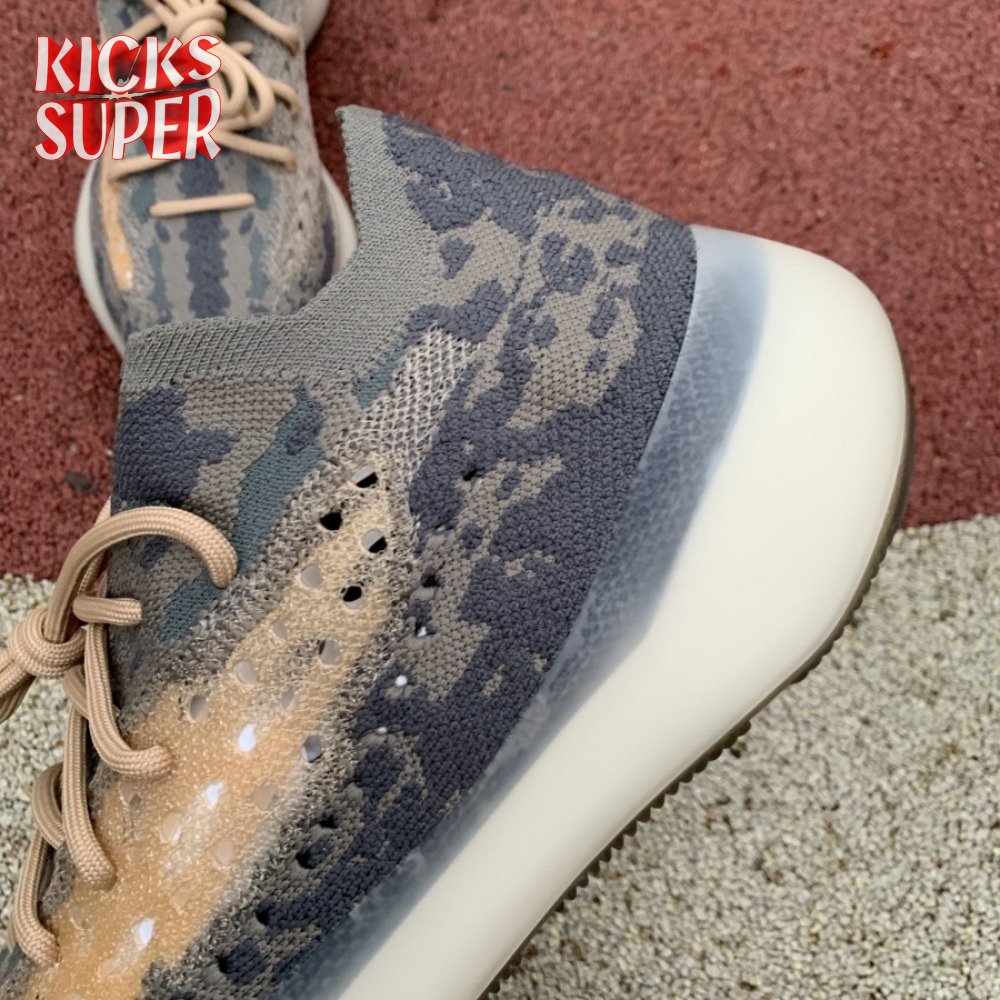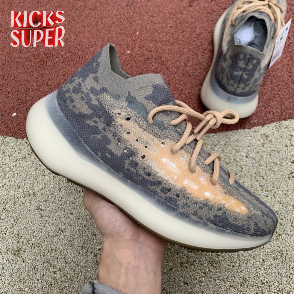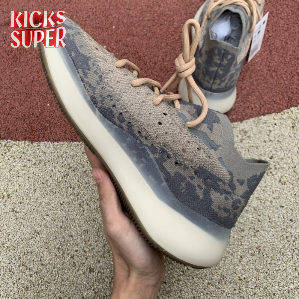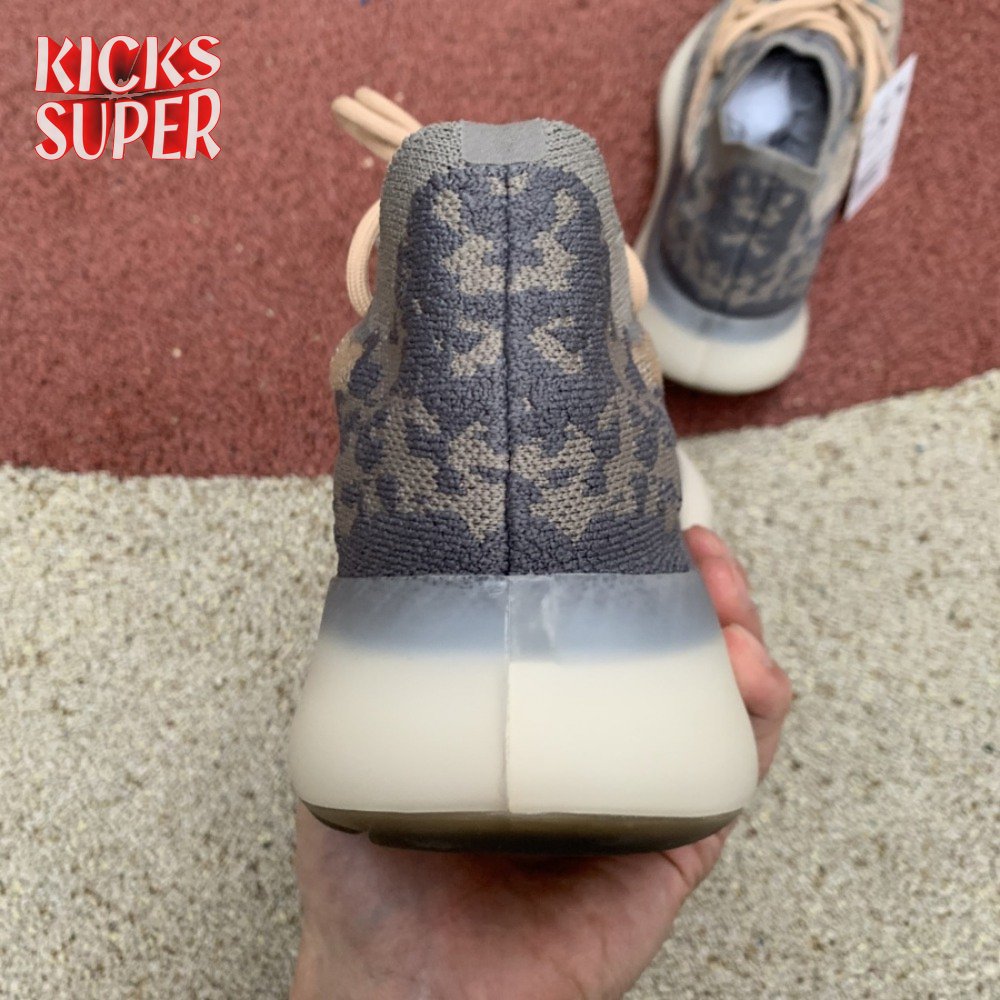 The Yeezy Boost 380 'Mist Non-Reflective' utilizes a breathable Primeknit upper finished in a camo-like pattern comprising neutral grey and tan hues. Details include a sock-like collar, rope laces integrated directly into the knit build and perforated detailing on the side panels for ventilated comfort. A semi-translucent rubber cage is applied to the full-length Boost midsole, featuring an elevated heel for a forward-leaning stance. A gum rubber outsole is good for grippy traction underfoot.