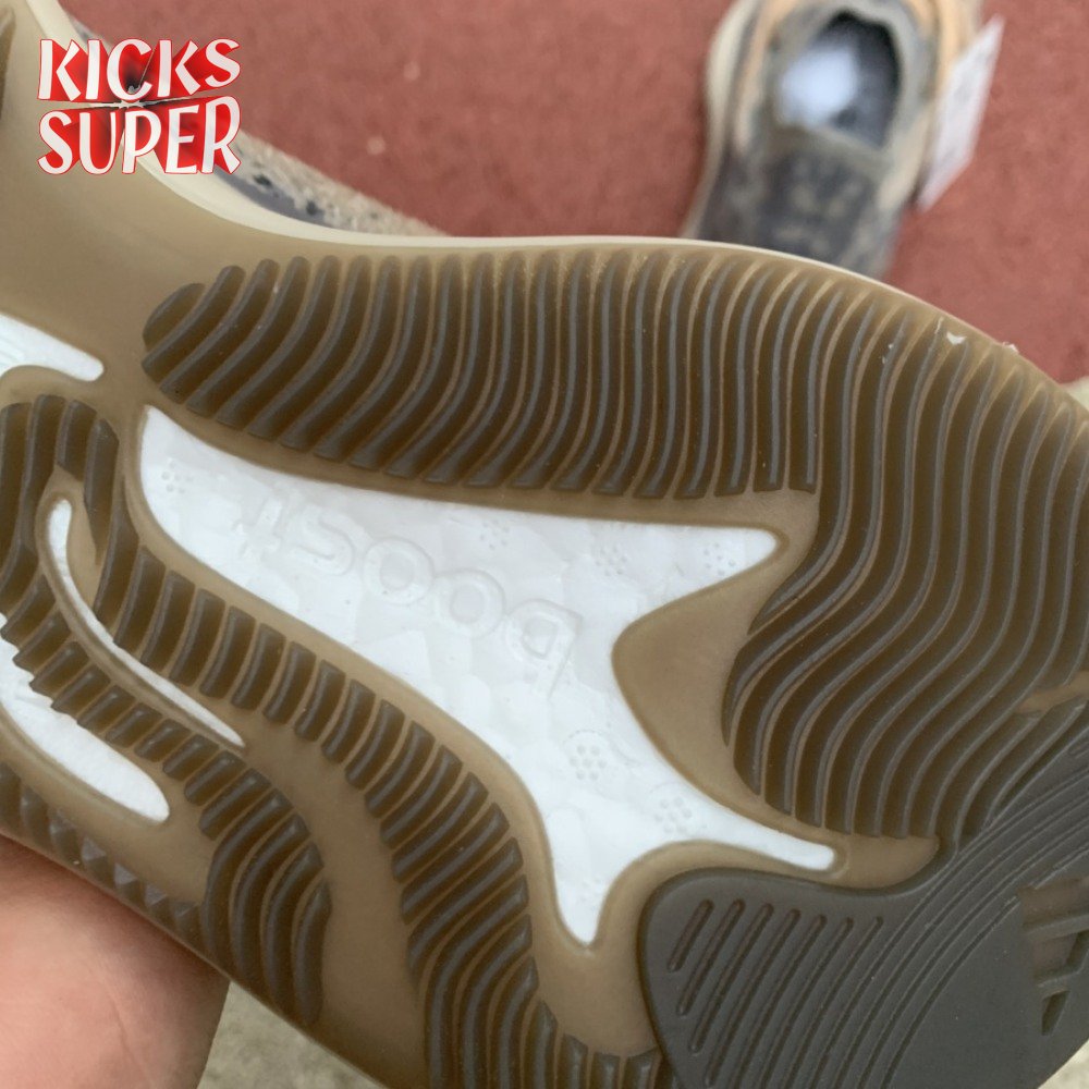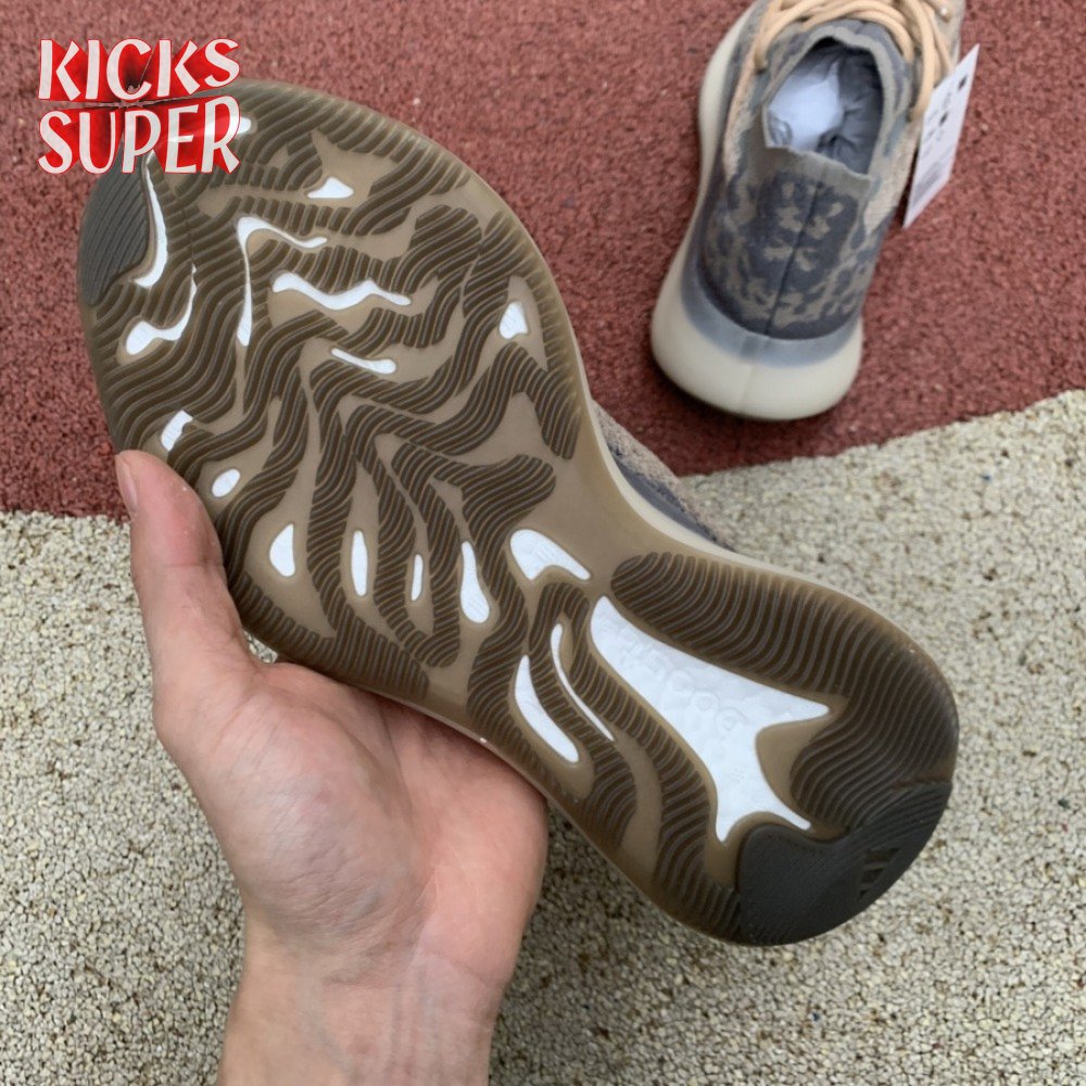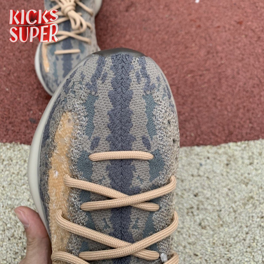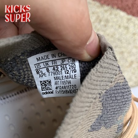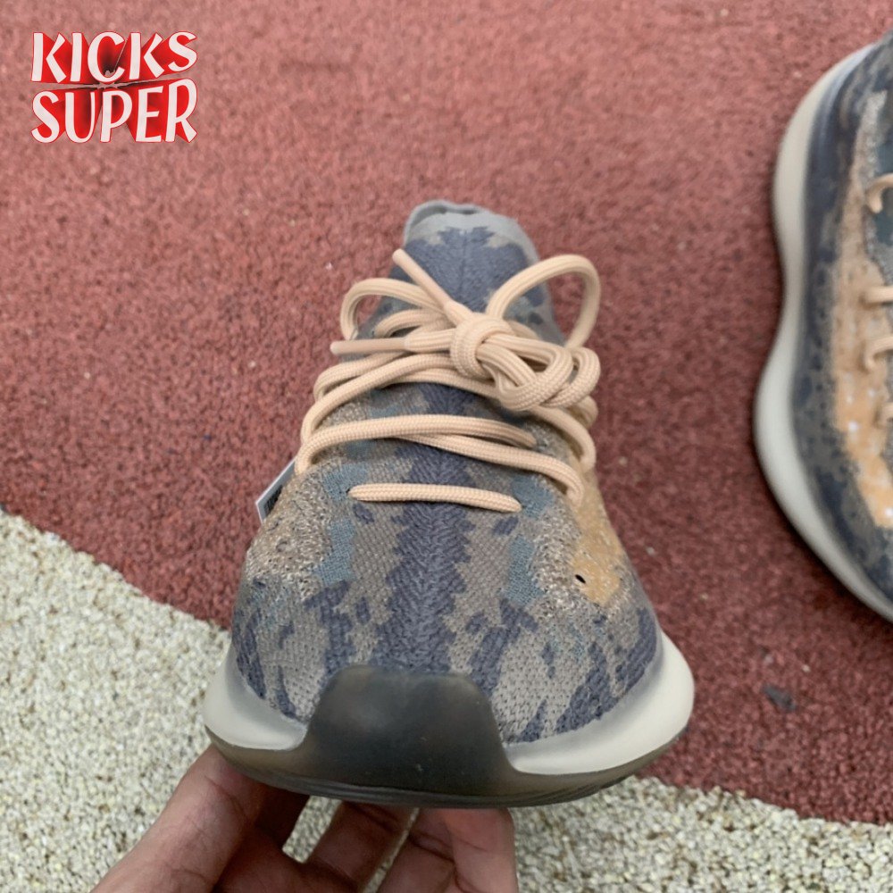 The Yeezy Boost 380 'Mist Non-Reflective' utilizes a breathable Primeknit upper finished in a camo-like pattern comprising neutral grey and tan hues. Details include a sock-like collar, rope laces integrated directly into the knit build and perforated detailing on the side panels for ventilated comfort. A semi-translucent rubber cage is applied to the full-length Boost midsole, featuring an elevated heel for a forward-leaning stance. A gum rubber outsole is good for grippy traction underfoot.