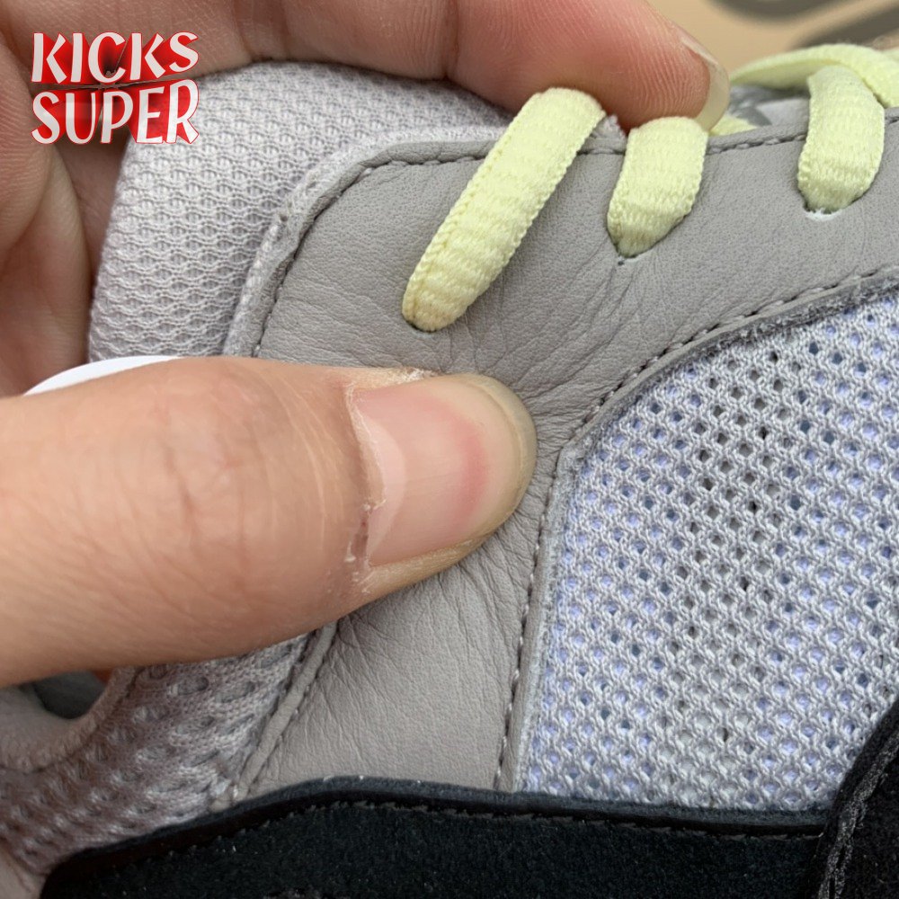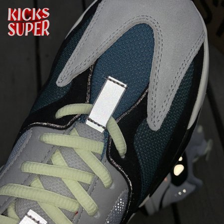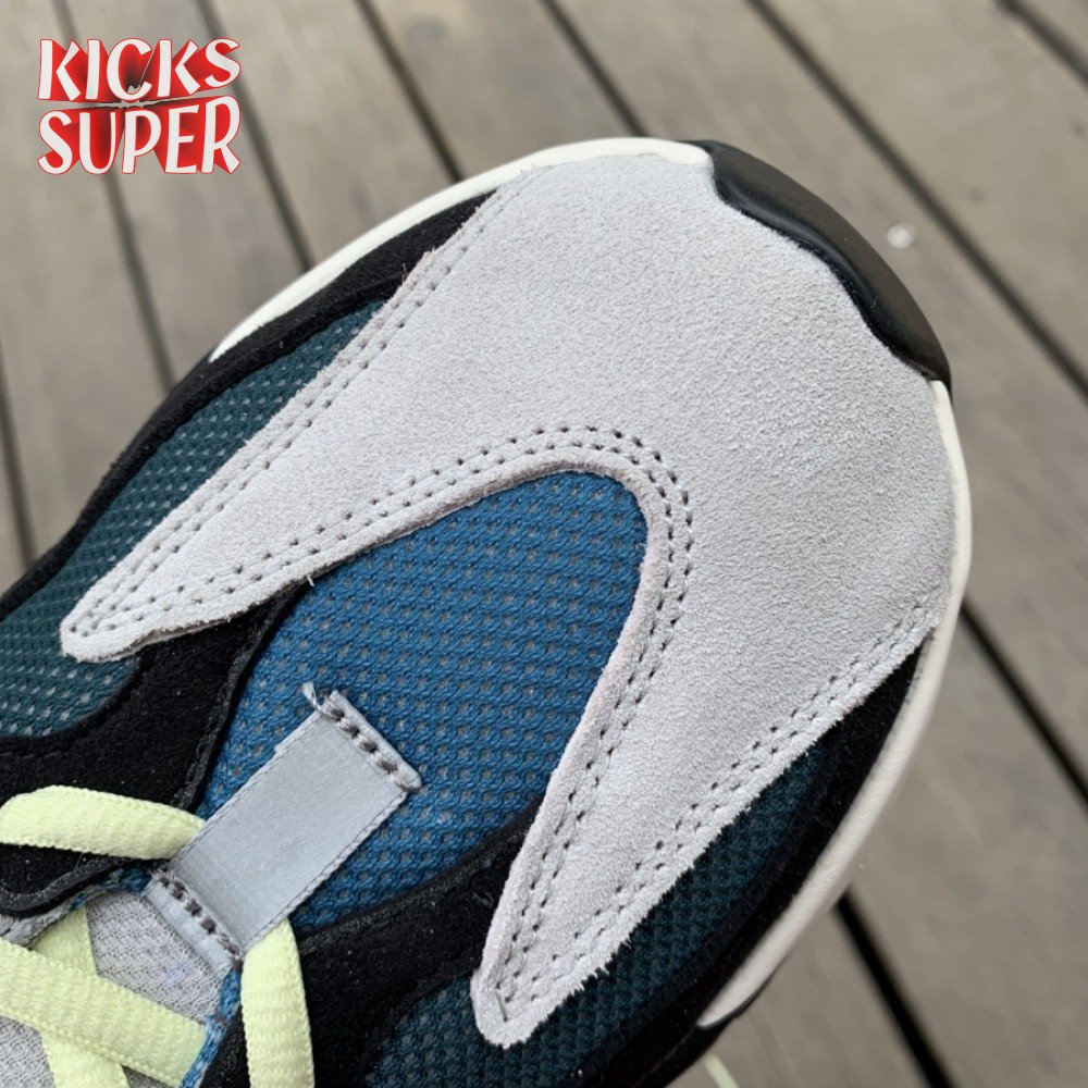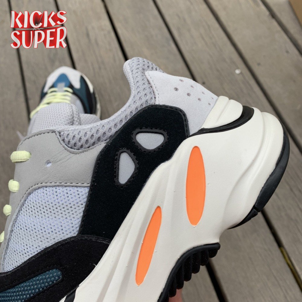 This inaugural colorway of Kanye West"s Yeezy Wave Runner 700 launched in November 2017, following a public debut earlier in the year as part of the Yeezy Season 5 runway show. The sneaker"s retro-inspired lines worked in tandem with a chunky silhouette reminiscent of an earlier era. A mesh base is finished in grey on the quarter panels and bright blue and teal on the forefoot. Suede overlays arrive on the toe and heel accented grey leather eyestays. Other details include neon green laces, a bulky white midsole, and pops of black and bright orange.