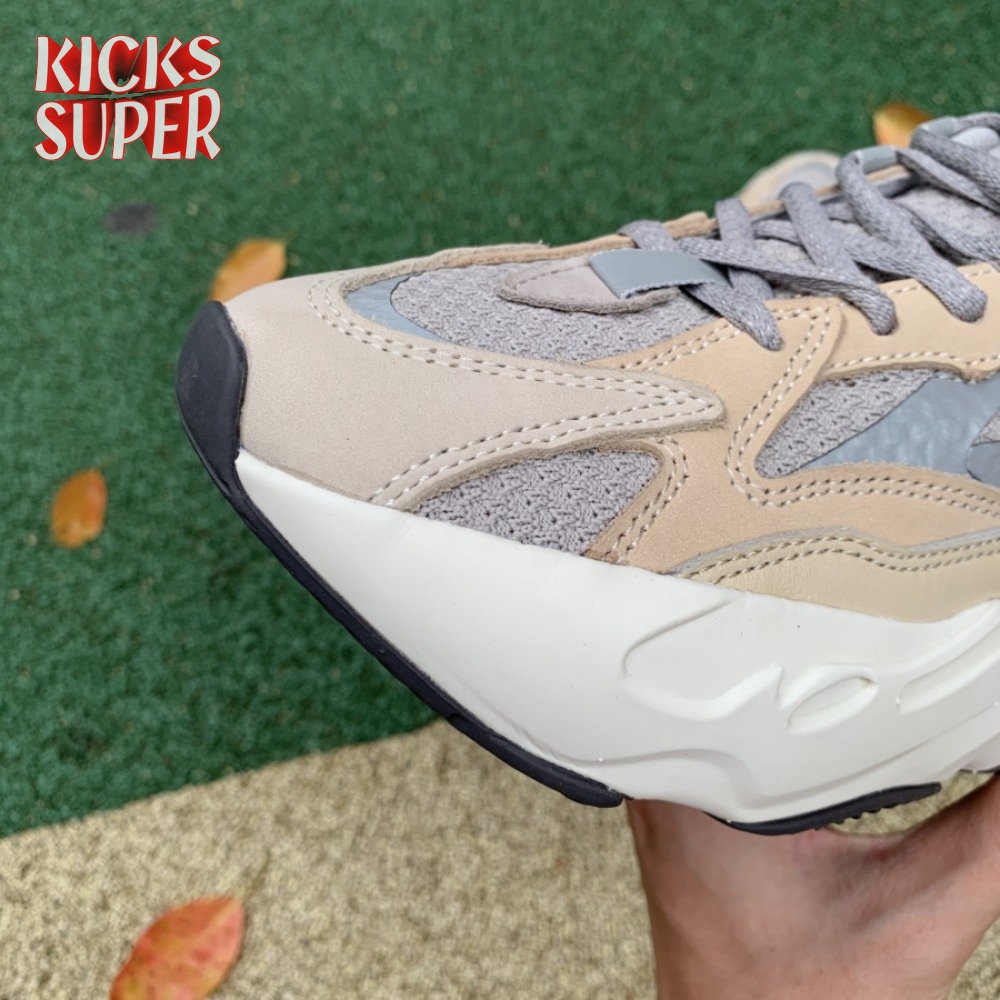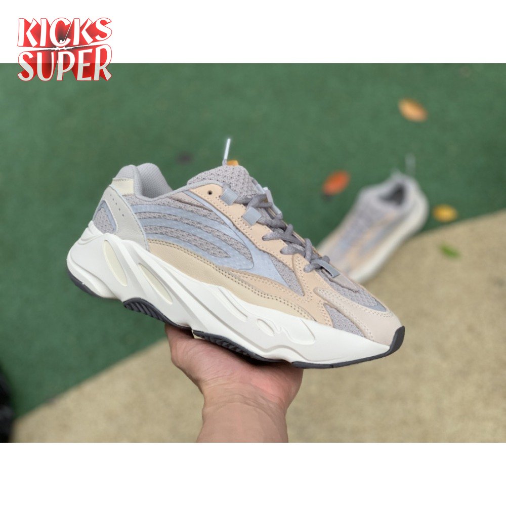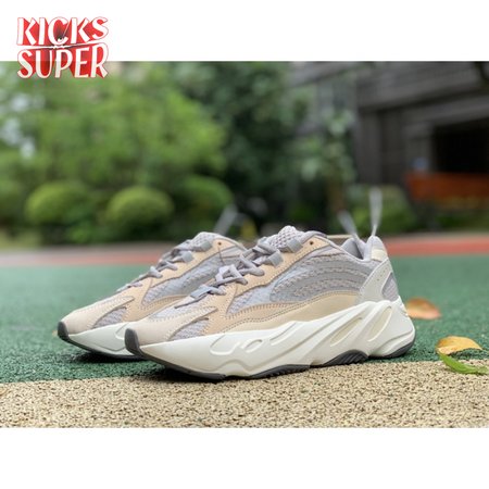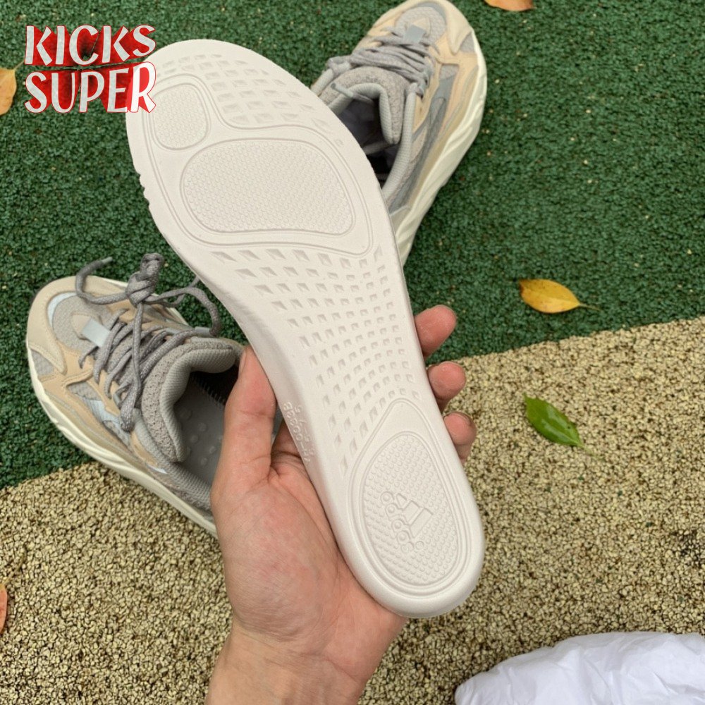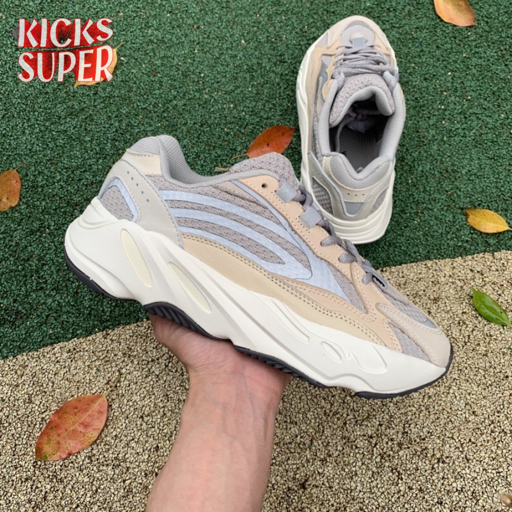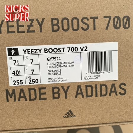 The adidas Yeezy Boost 700 V2 "Cream" delivers an unassuming colorway of Kanye West"s running-inspired silhouette. The upper features rolled knit construction in a pale grey hue, reinforced with tonal no-sew skins and tan nubuck overlays. An off-white finish distinguishes the exaggerated EVA midsole, featuring sculpted sidewalls that conceal a full-length drop-in Boost unit. Underfoot, the rubber outsole uses a classic herringbone traction pattern for superior grip.