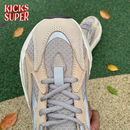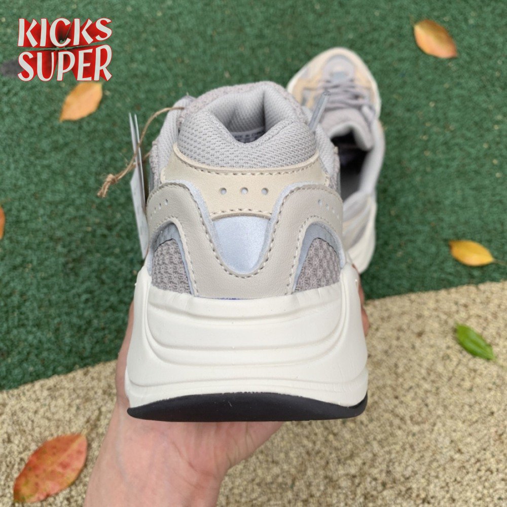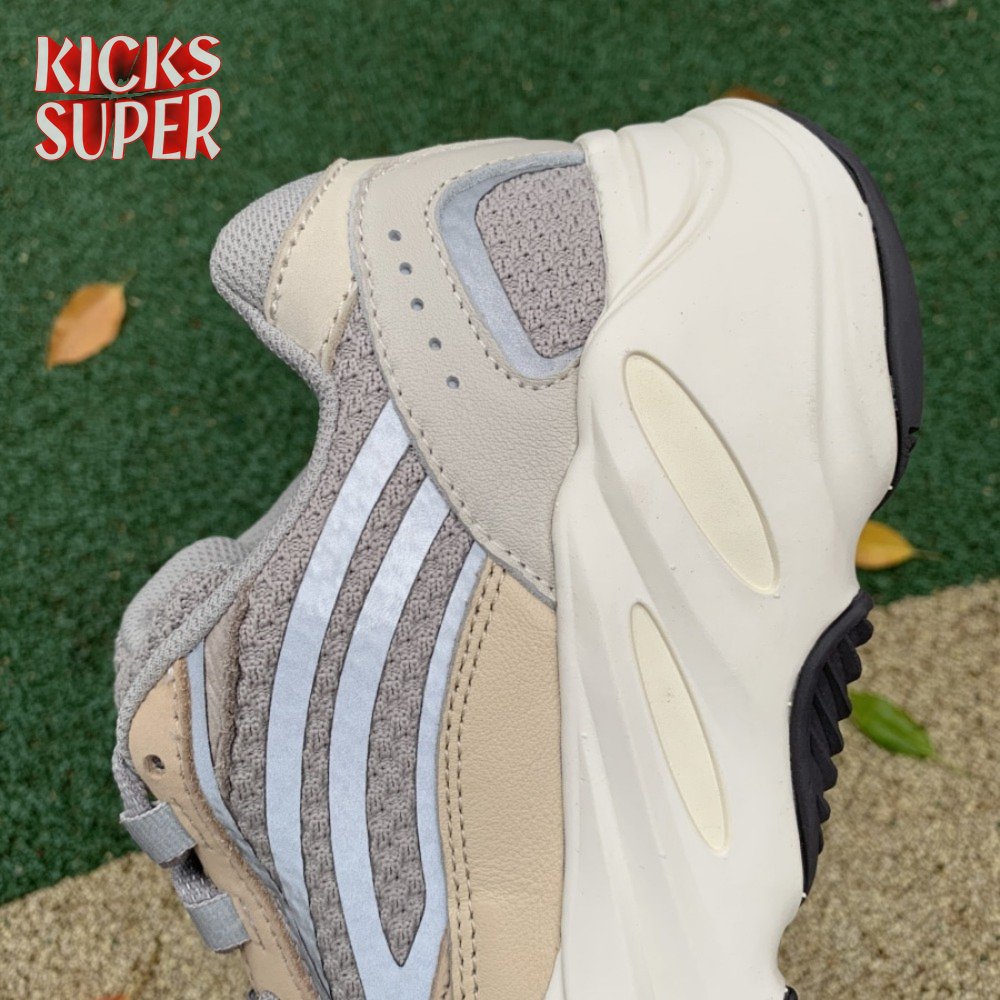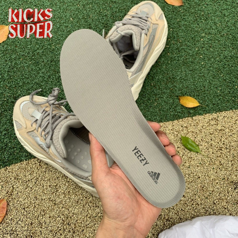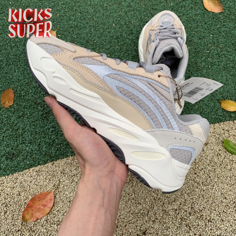 The adidas Yeezy Boost 700 V2 "Cream" delivers an unassuming colorway of Kanye West"s running-inspired silhouette. The upper features rolled knit construction in a pale grey hue, reinforced with tonal no-sew skins and tan nubuck overlays. An off-white finish distinguishes the exaggerated EVA midsole, featuring sculpted sidewalls that conceal a full-length drop-in Boost unit. Underfoot, the rubber outsole uses a classic herringbone traction pattern for superior grip.