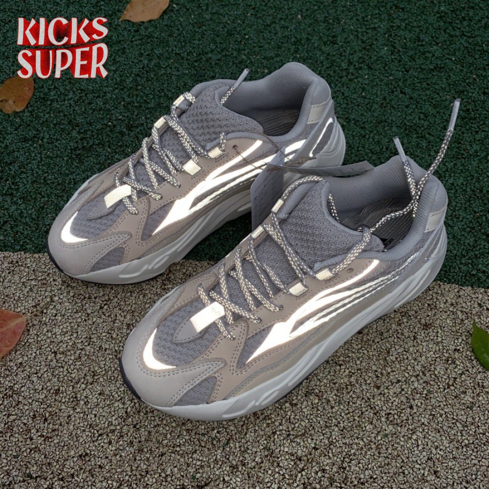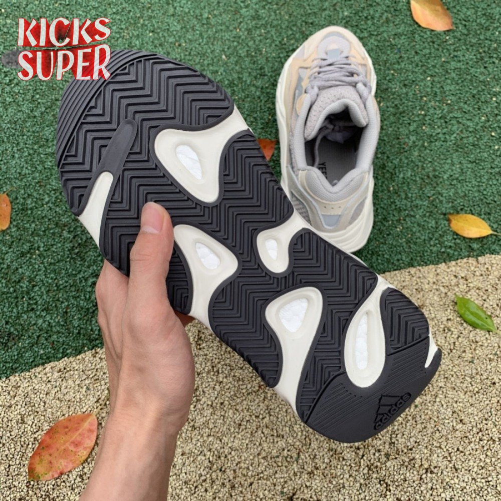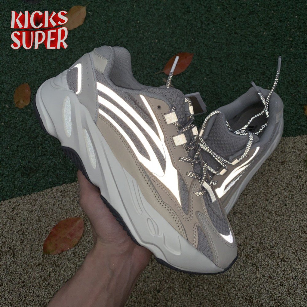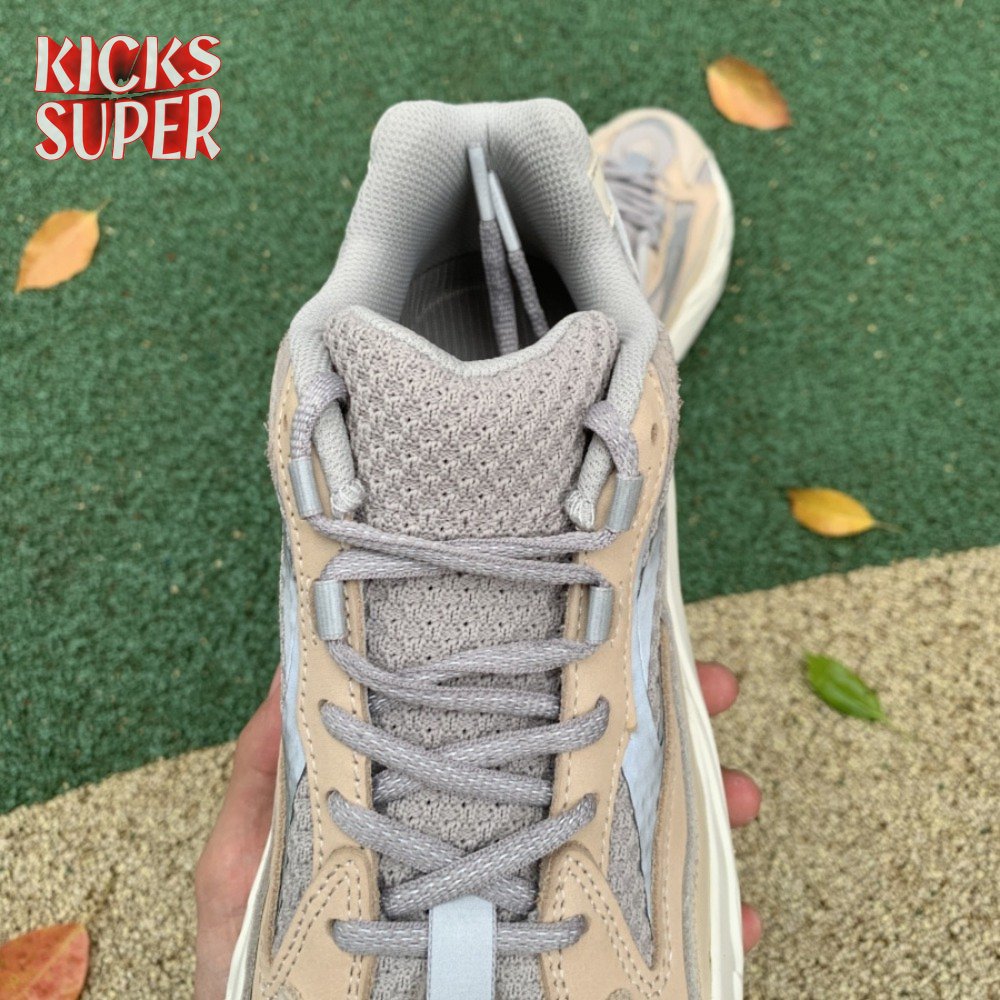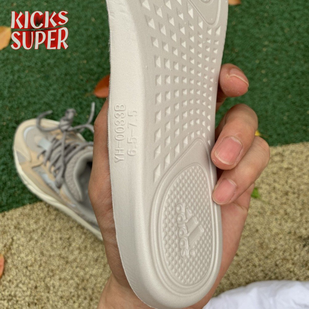 The adidas Yeezy Boost 700 V2 "Cream" delivers an unassuming colorway of Kanye West"s running-inspired silhouette. The upper features rolled knit construction in a pale grey hue, reinforced with tonal no-sew skins and tan nubuck overlays. An off-white finish distinguishes the exaggerated EVA midsole, featuring sculpted sidewalls that conceal a full-length drop-in Boost unit. Underfoot, the rubber outsole uses a classic herringbone traction pattern for superior grip.