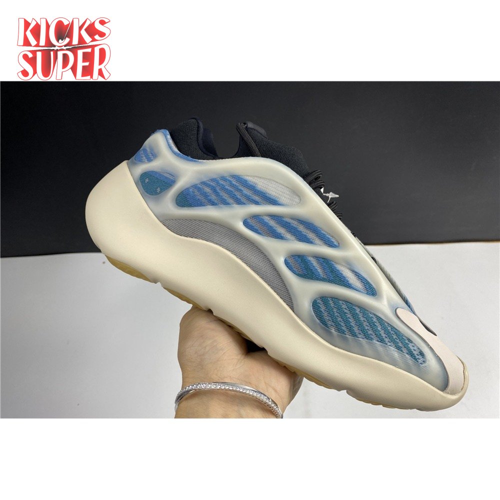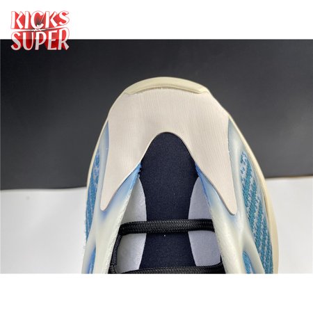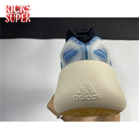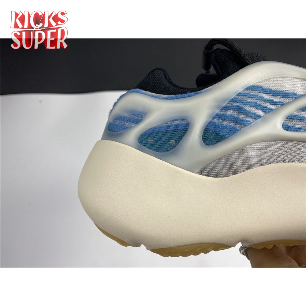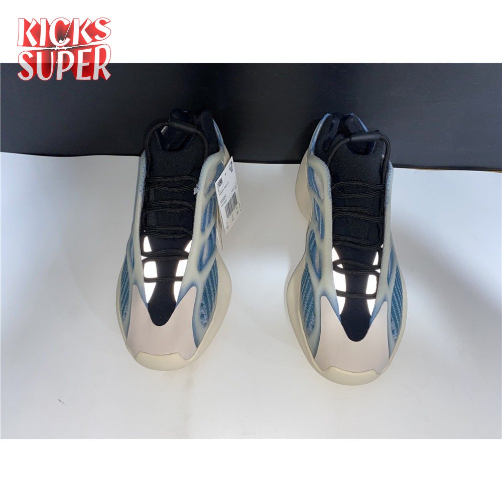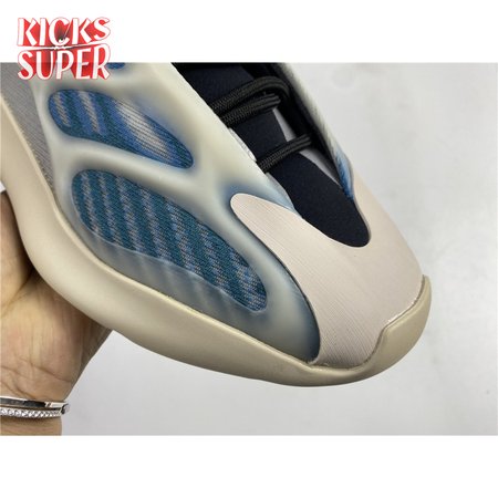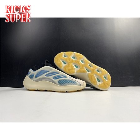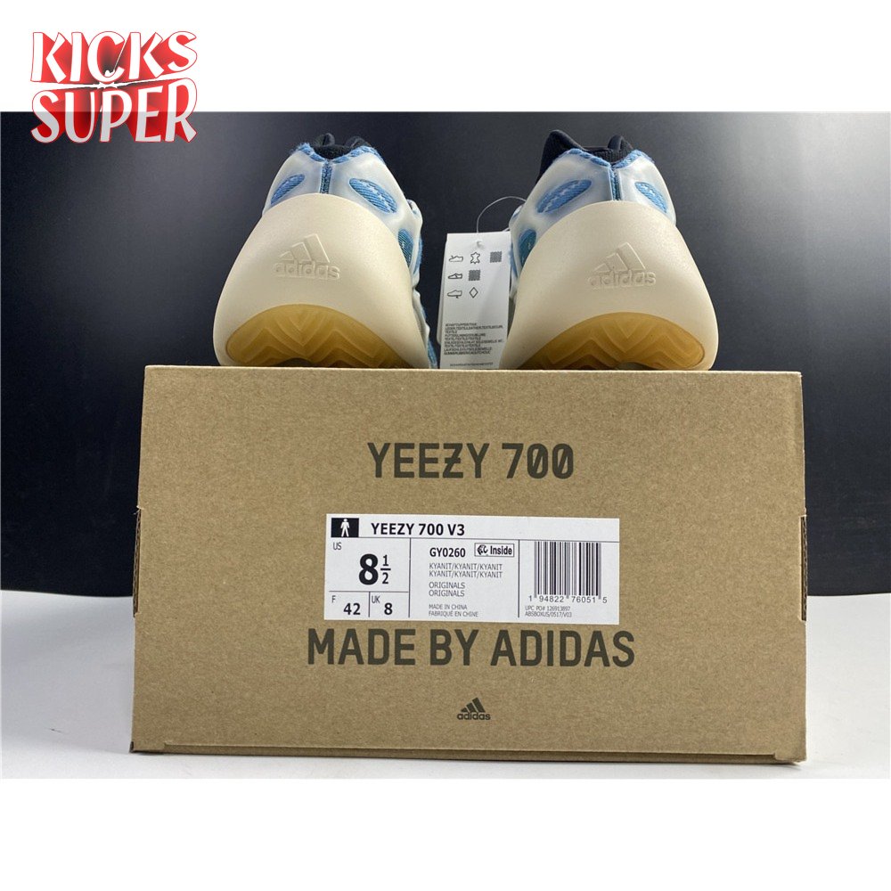 The adidas Yeezy 700 V3 "Kyanite" showcases flowing stripes of blue coloring throughout the breathable upper, constructed from monofilament engineered mesh with exoskeletal RPU overlays coated in a glow-in-the-dark finish. Interior bootie construction delivers a snug fit, while a reinforced rubber toe cap provides added durability. The sneaker rides on a lightweight EVA midsole encapsulated in an off-white PU cage, supported by a herringbone rubber outsole.