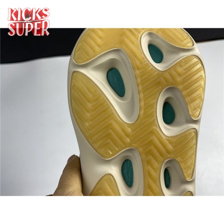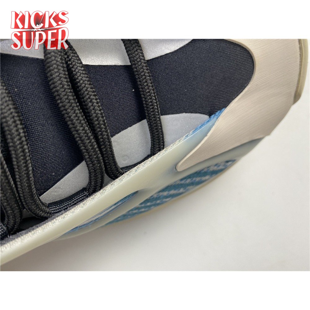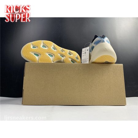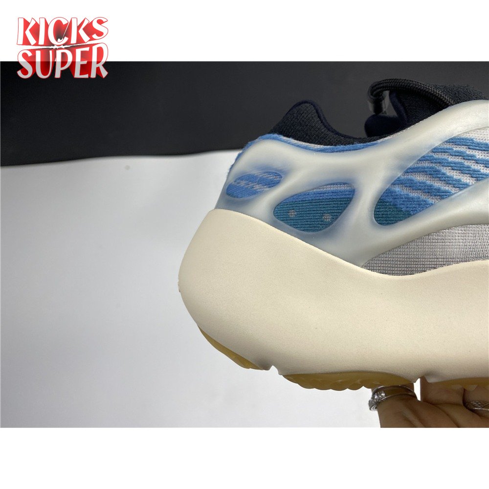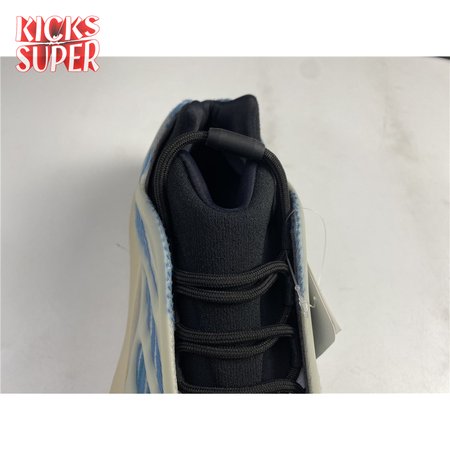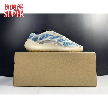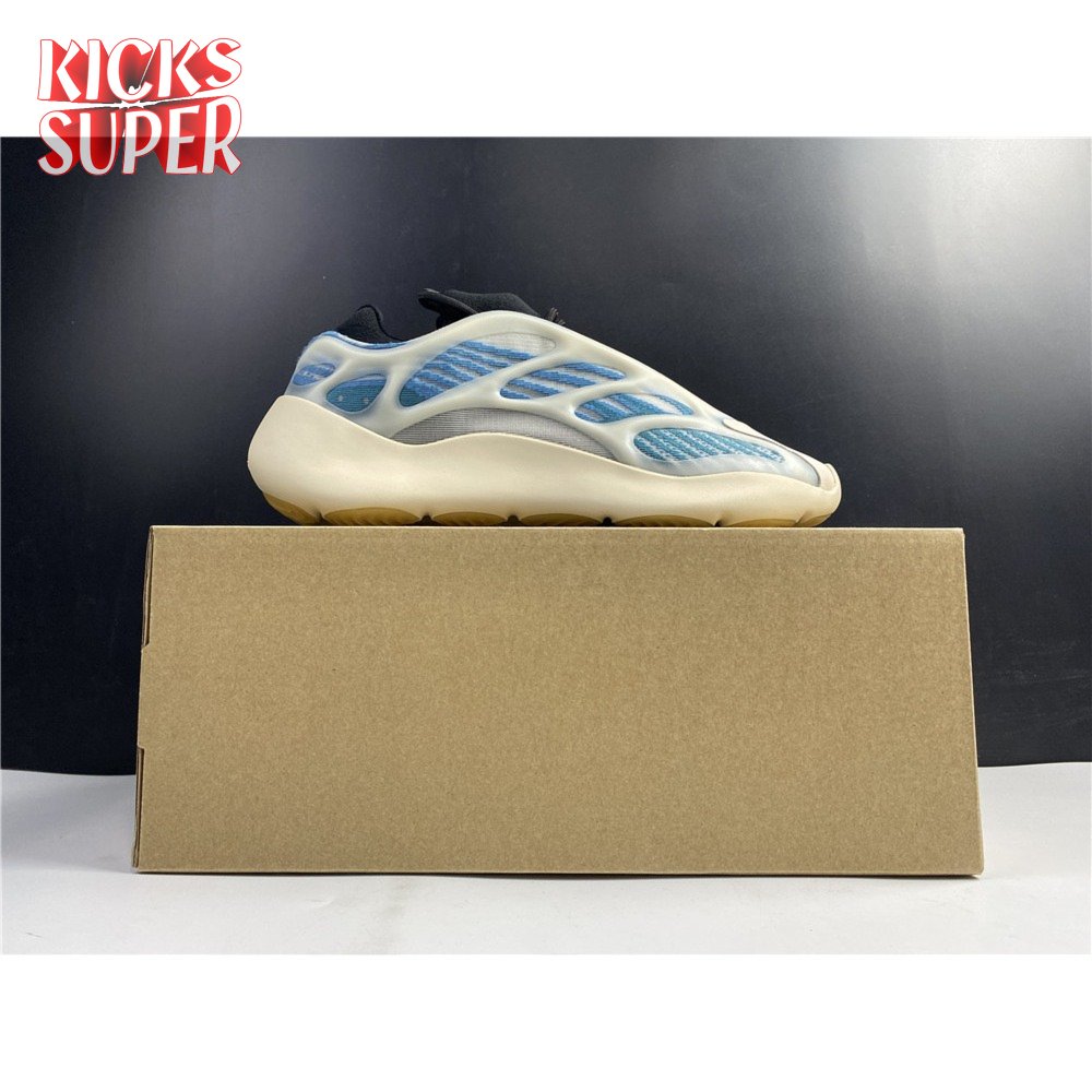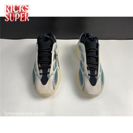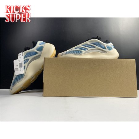 The adidas Yeezy 700 V3 "Kyanite" showcases flowing stripes of blue coloring throughout the breathable upper, constructed from monofilament engineered mesh with exoskeletal RPU overlays coated in a glow-in-the-dark finish. Interior bootie construction delivers a snug fit, while a reinforced rubber toe cap provides added durability. The sneaker rides on a lightweight EVA midsole encapsulated in an off-white PU cage, supported by a herringbone rubber outsole.