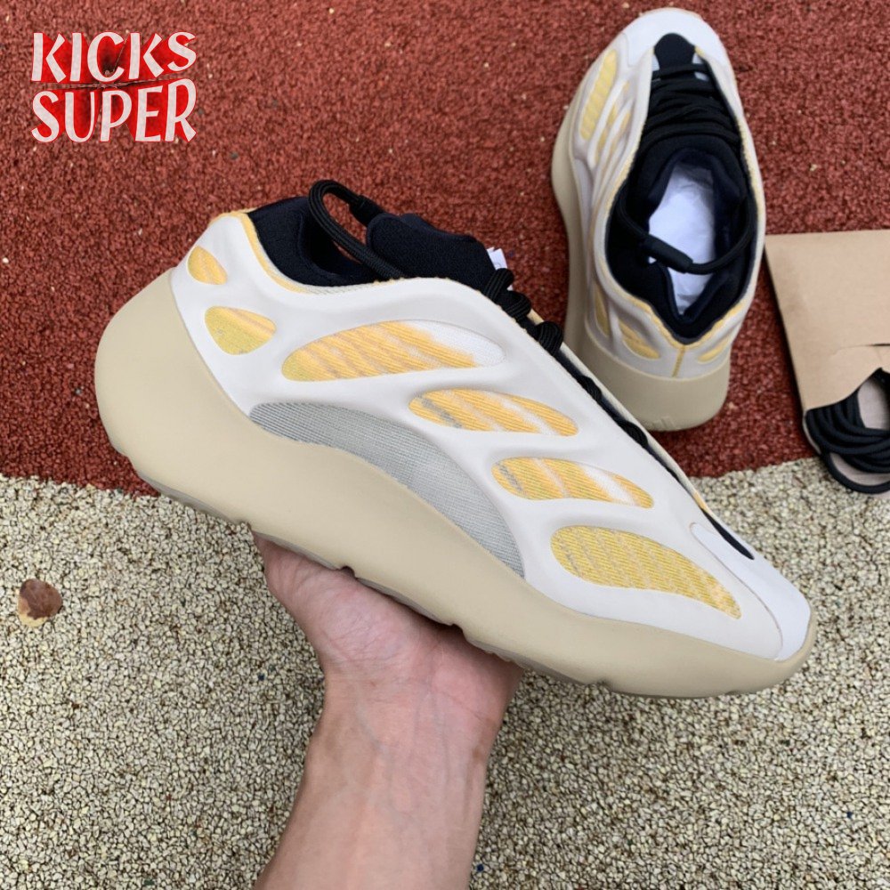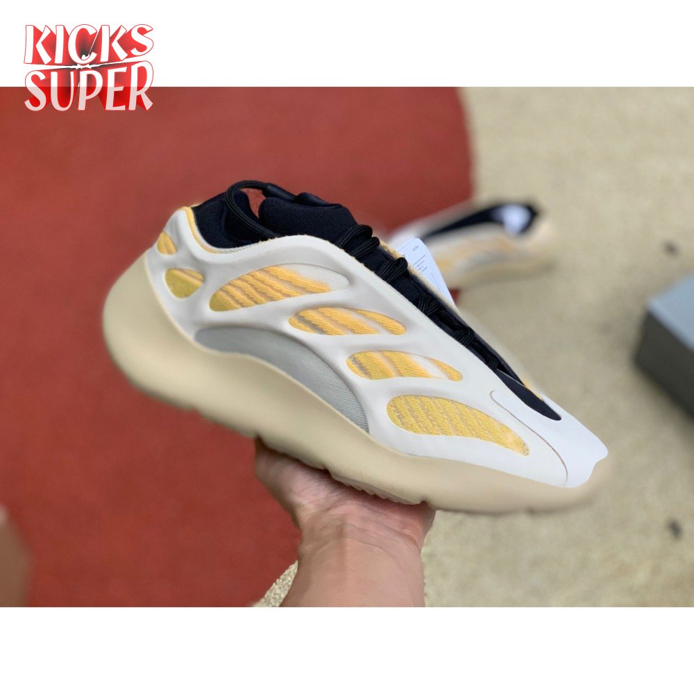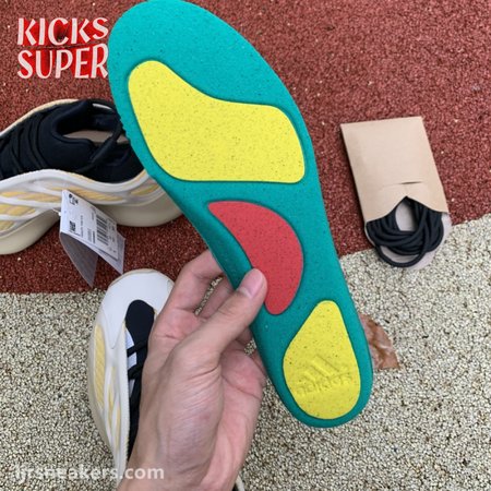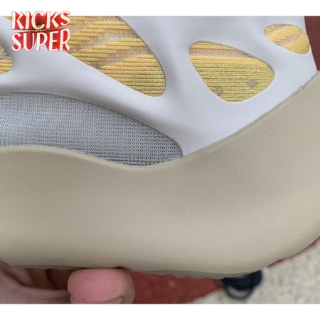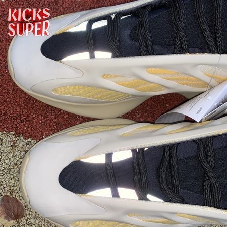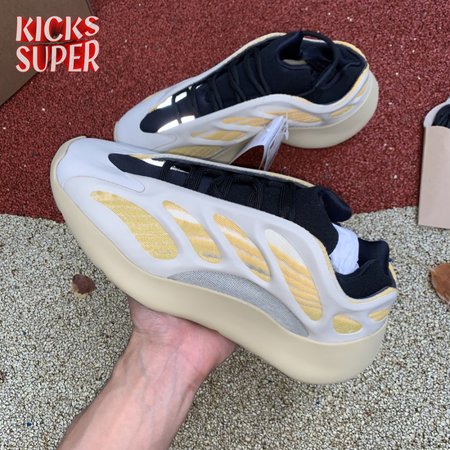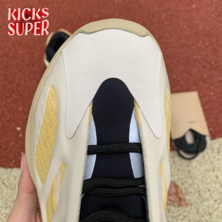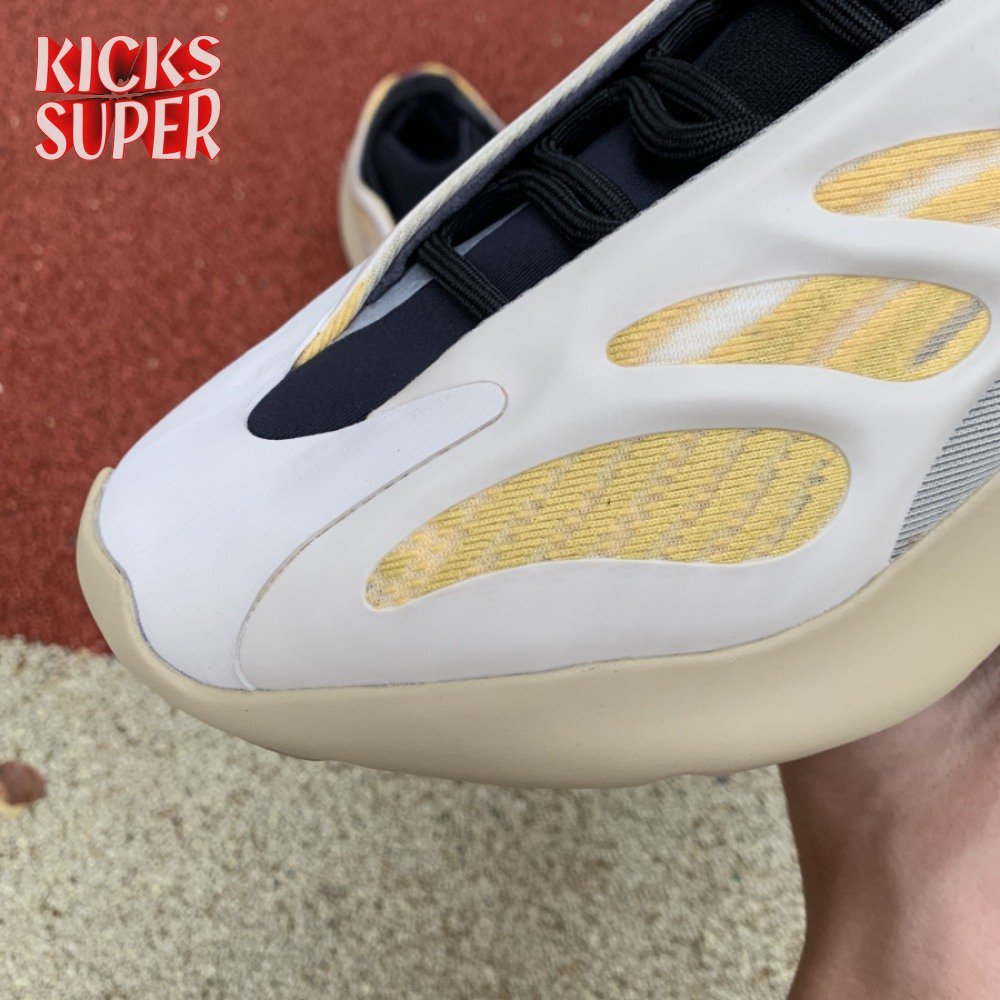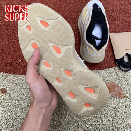 The adidas Yeezy 700 V3 "Safflower" showcases a mostly neutral color scheme in keeping with the Yeezy brand"s signature palette. Subtle hints of color arrive via yellow striations throughout the monofilament engineered mesh upper, overlaid with a glow-in-the-dark RPU cage that extends from heel to toe. The sneaker"s interior bootie construction is rendered in a contrasting black finish, offering a snug, comfortable fit. A PU encapsulated EVA midsole anchors the streamlined silhouette.