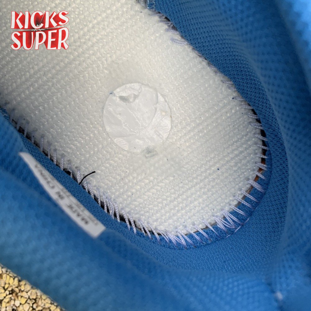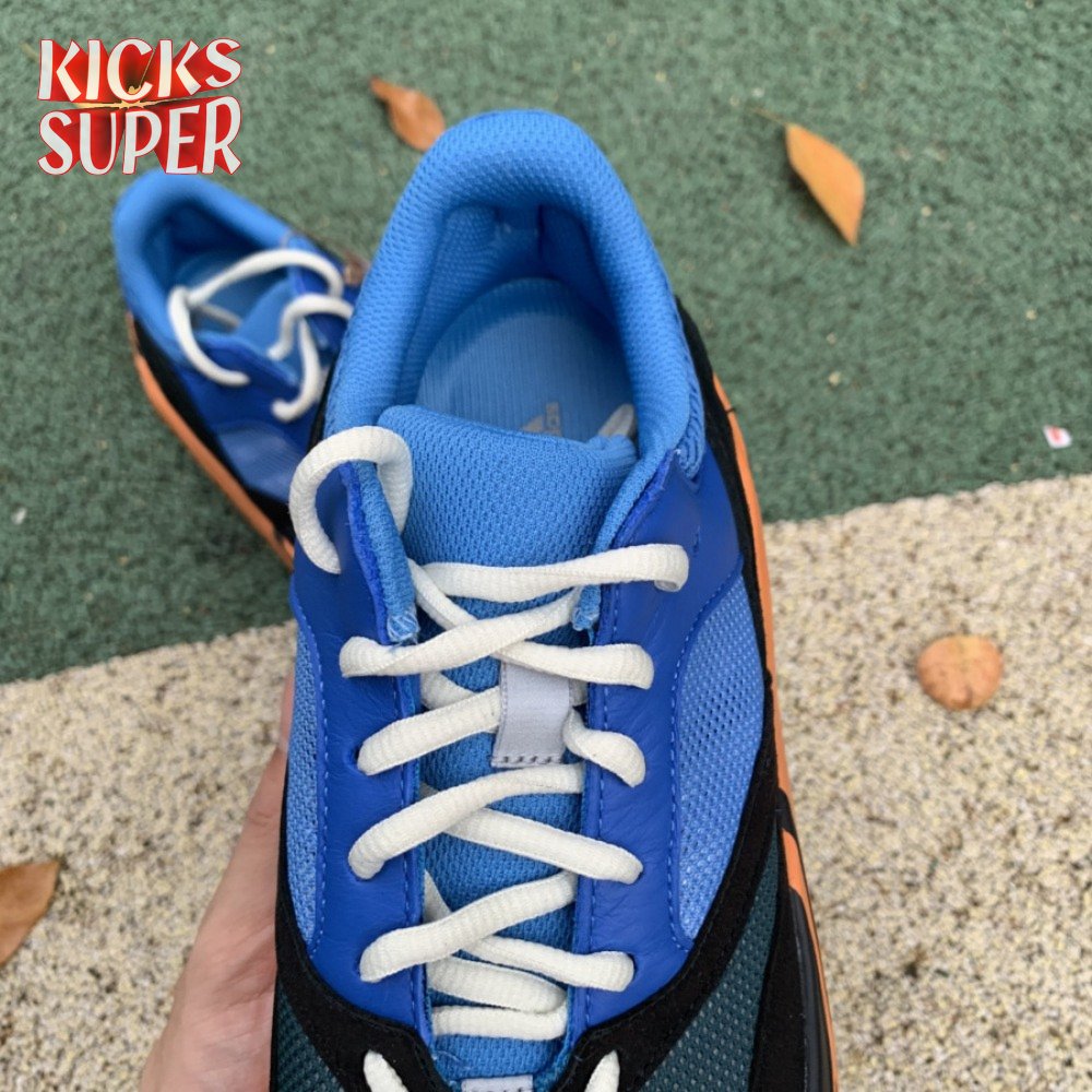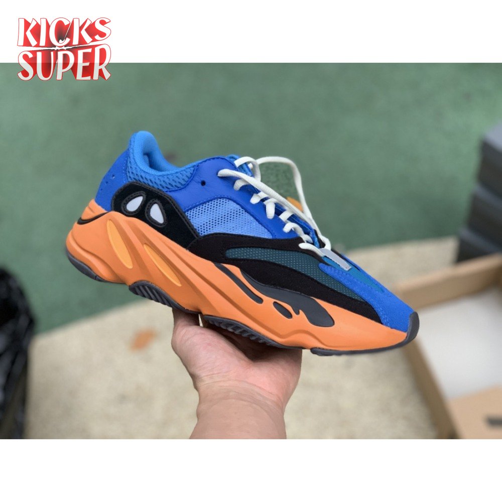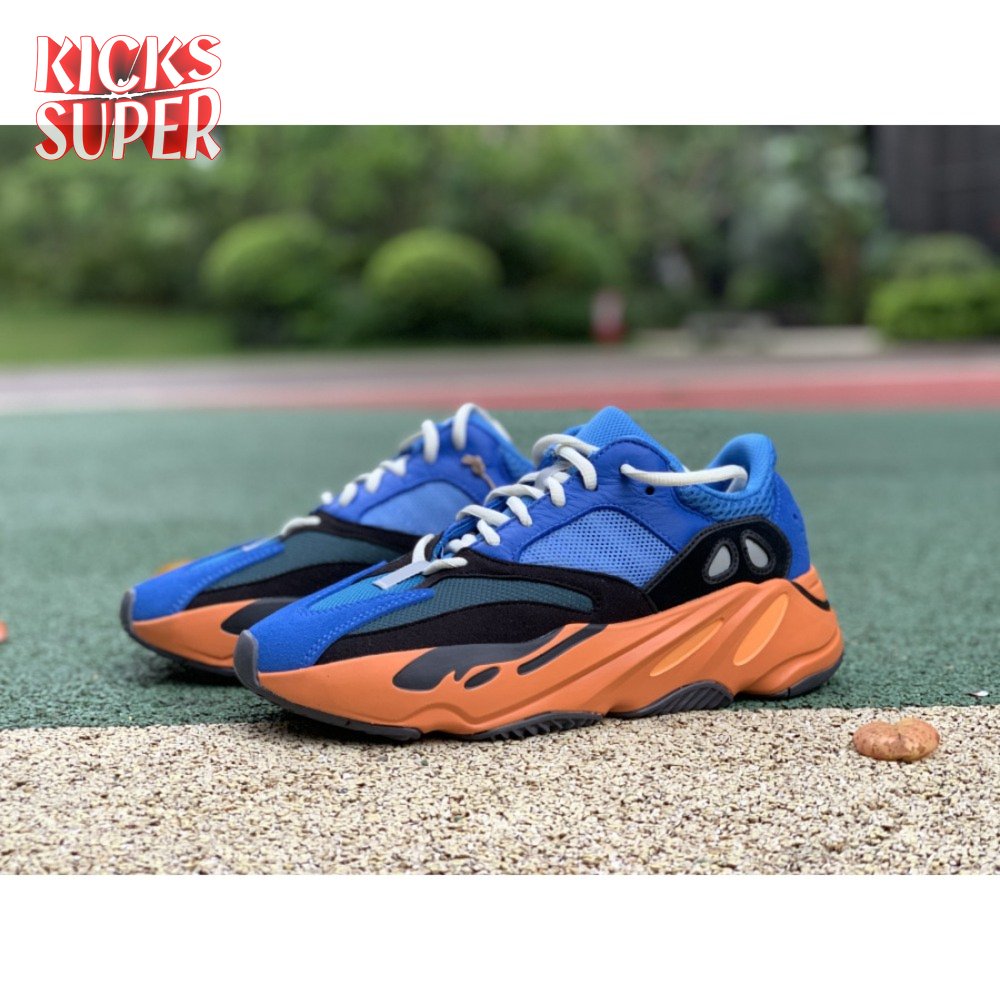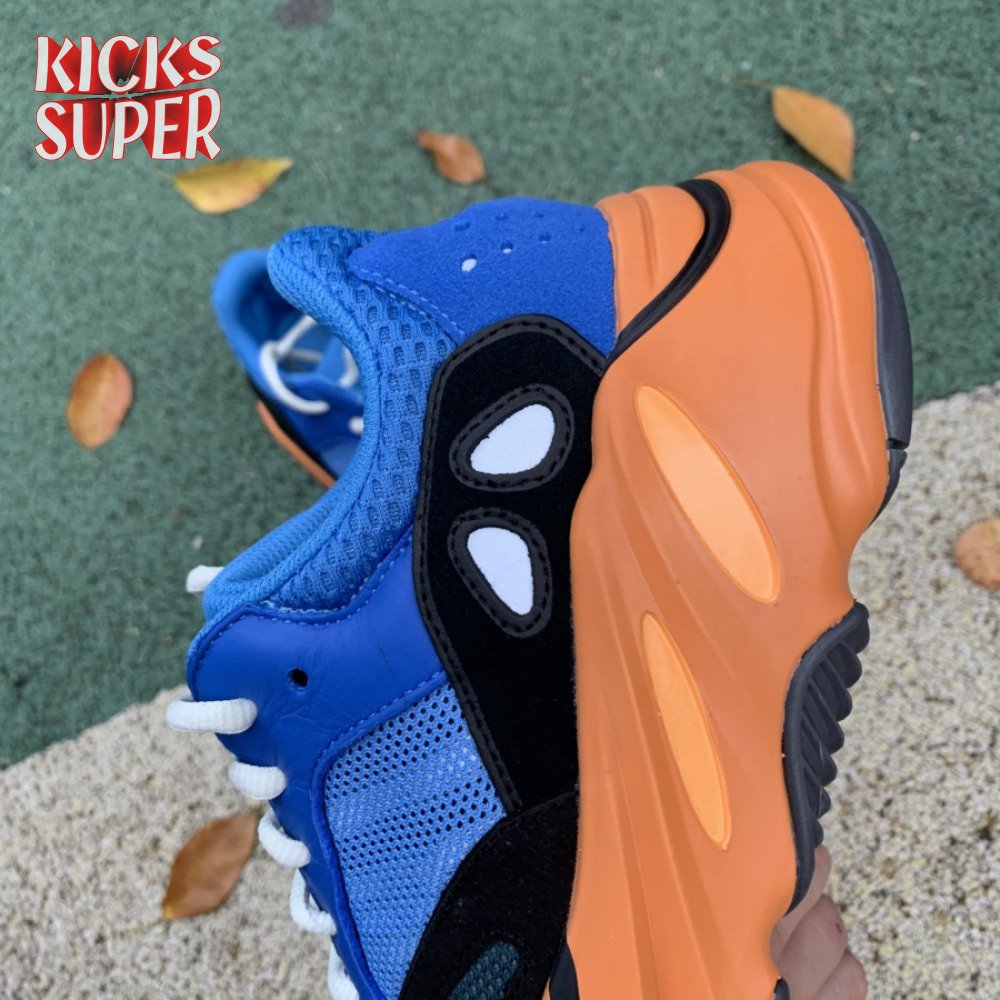 The adidas Yeezy Boost 700 "Bright Blue" uses sharply contrasting finishes to delineate the lifestyle runner"s upper and tooling. The latter pairs sculpted orange sidewalls with a contrasting black rubber outsole, featuring a herringbone traction pattern with cut-out detailing that reveals a drop-in Boost midsole. Up top, royal blue mesh is reinforced with tonal suede overlays at the toe and heel, along with black suede midfoot panels enlivened with reflective detailing.
