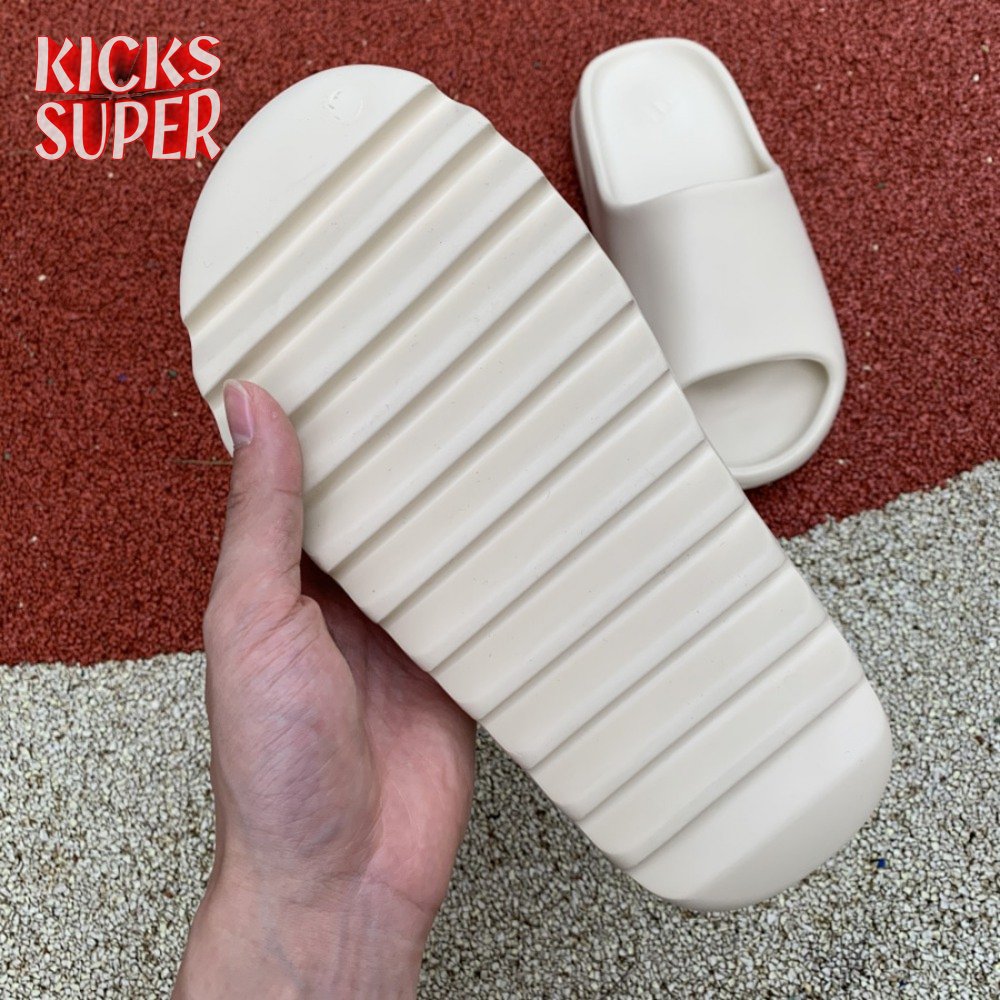 The Yeezy Slide 'Bone' applies a neutral hue to Kanye West"s take on an everyday sandal, constructed from EVA foam for lightweight comfort. The minimalist design is good for a sleek, contemporary look, with exterior branding limited to adidas" three-stripe logo debossed at the heel of the footbed. The slip-on build rides atop a high-traction outsole, fitted with strategically placed grooves for sure footing.