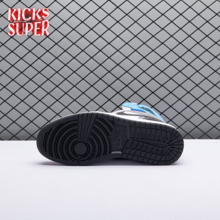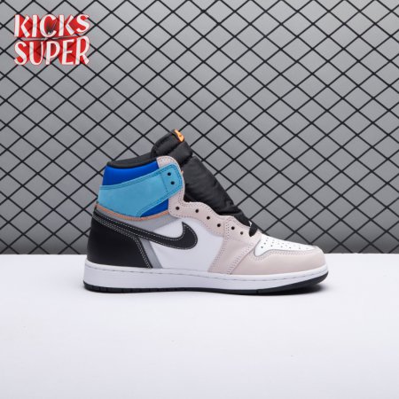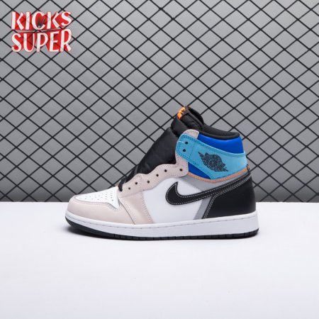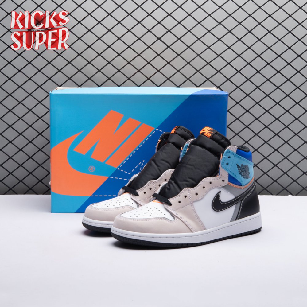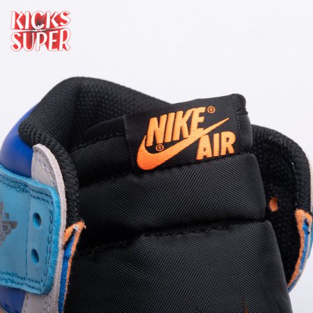 The Air Jordan 1 Retro High OG "Prototype" showcases sharply contrasting color stories between the collar and the rest of the upper. The latter combines a white leather base with reinforced overlays in tan nubuck and grey and black leather. Vibrant shades of blue distinguish the collar, marked with wraparound perforated detailing that indicates where wearers will need to cut if they opt to convert the high-top silhouette into a low-top. An orange mini-Swoosh is embroidered atop the toe box, matching the woven Nike Air tag affixed to the black nylon tongue.