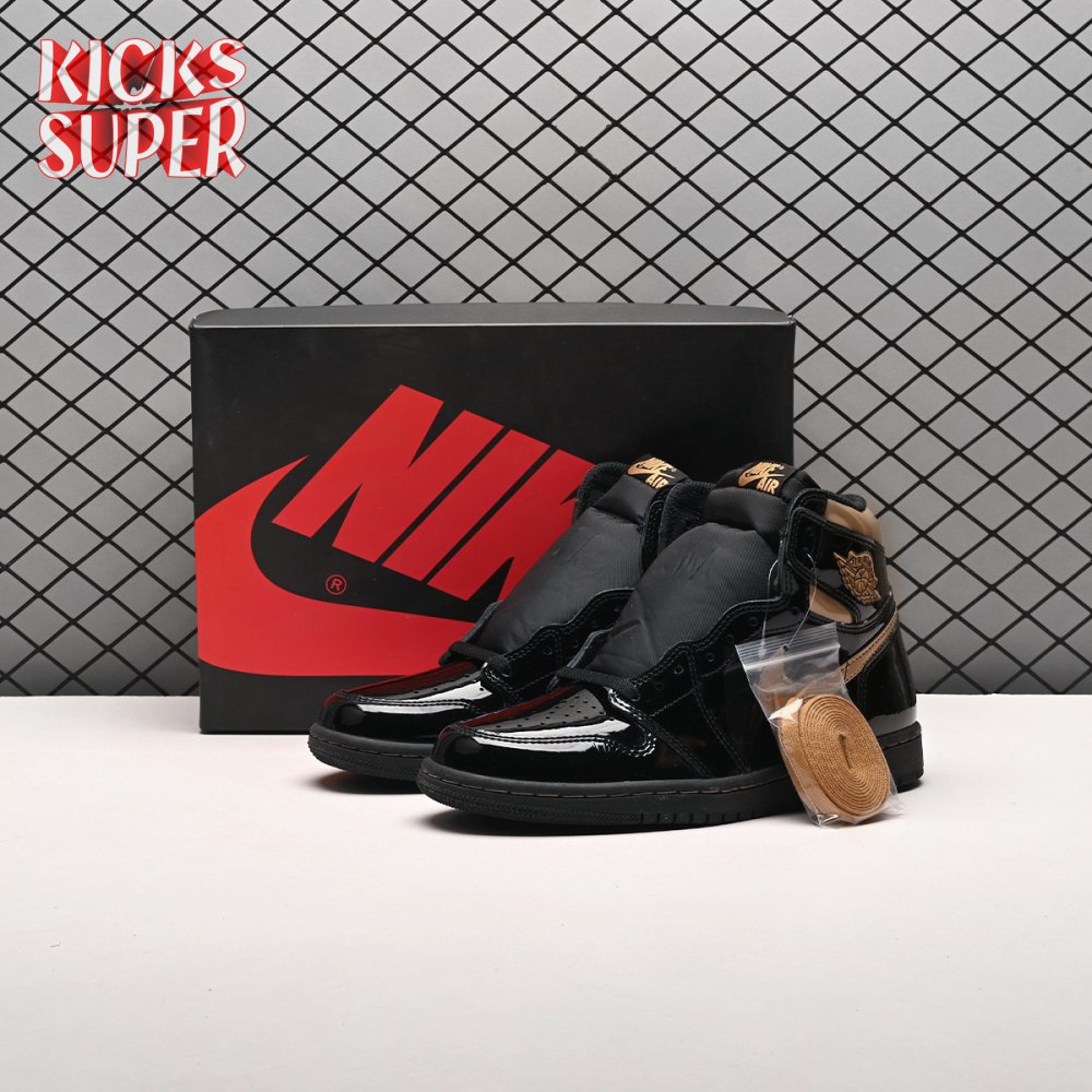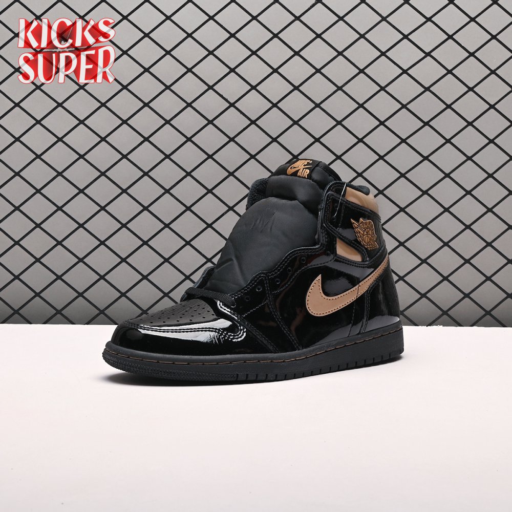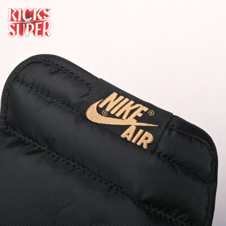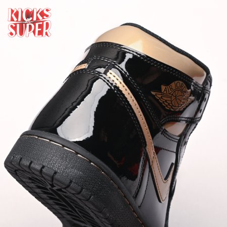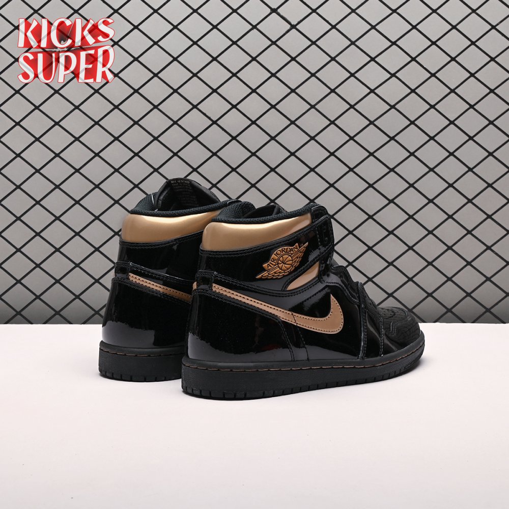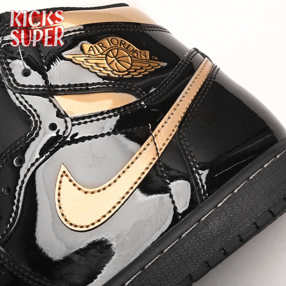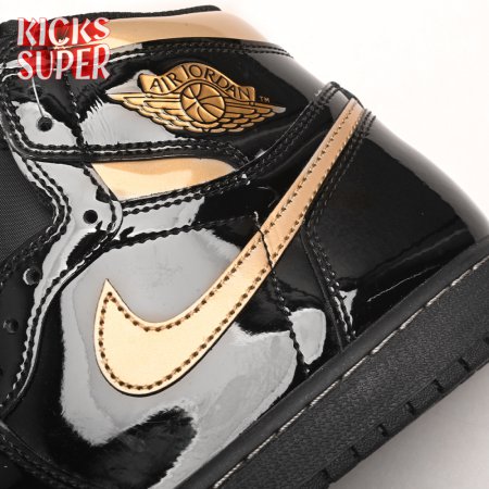 The Air Jordan 1 Retro High OG "Black Metallic Gold" seemingly takes inspiration from an Air Jordan 1 Mid from 2003 that similarly utilized a black patent leather upper with gilded accents. This pair adds OG touches in the form of a printed Wings logo on the lateral collar flap and a woven Nike tag atop the lightly padded nylon tongue. The two-tone palette is repeated on the sneaker"s tooling, featuring gold stitching that circles the black rubber cupsole.