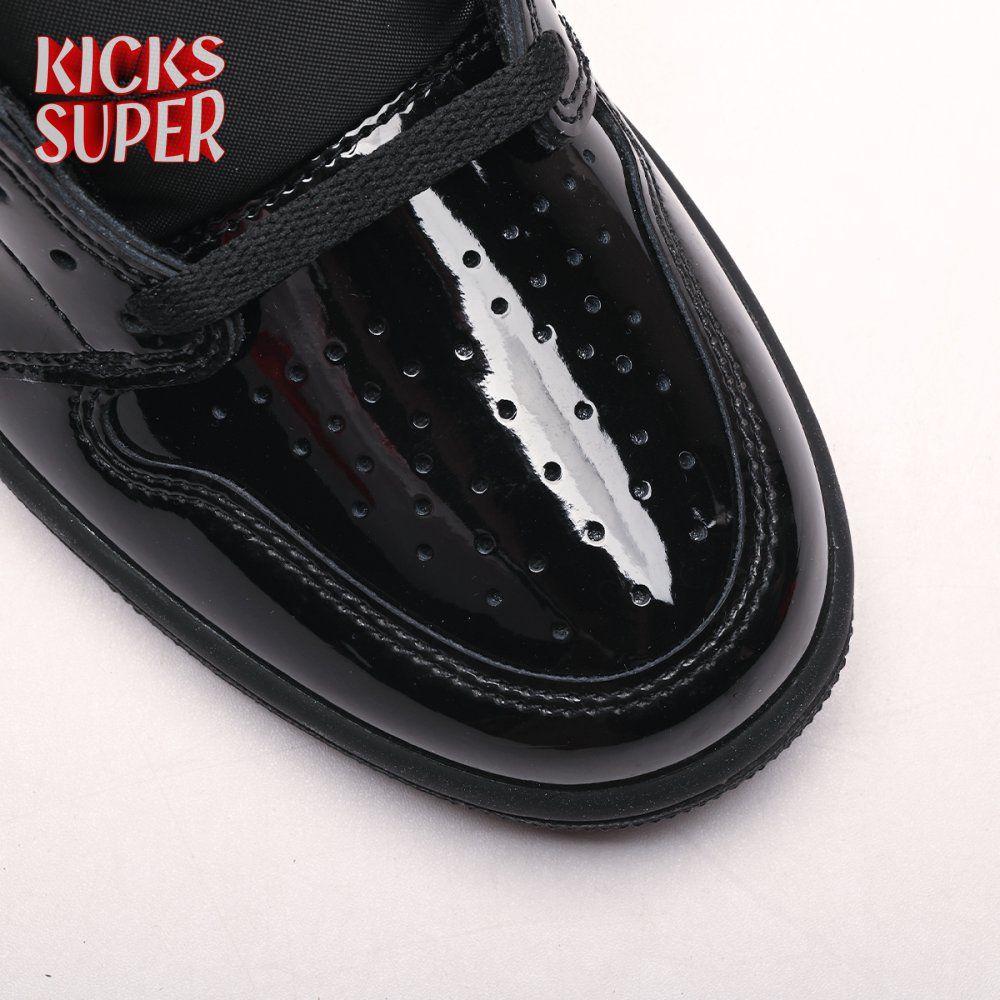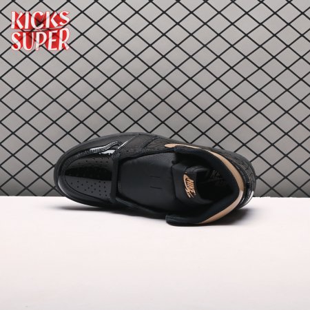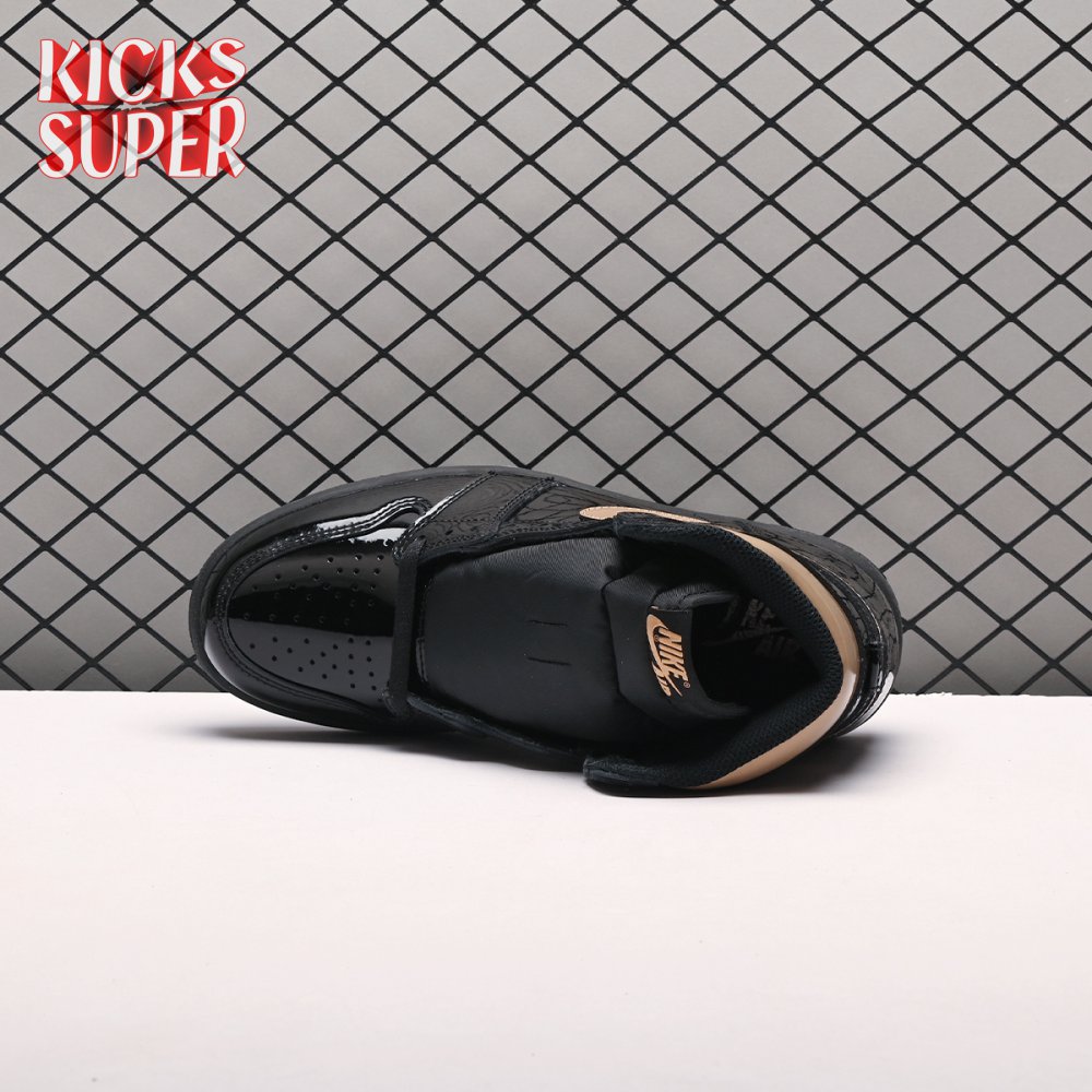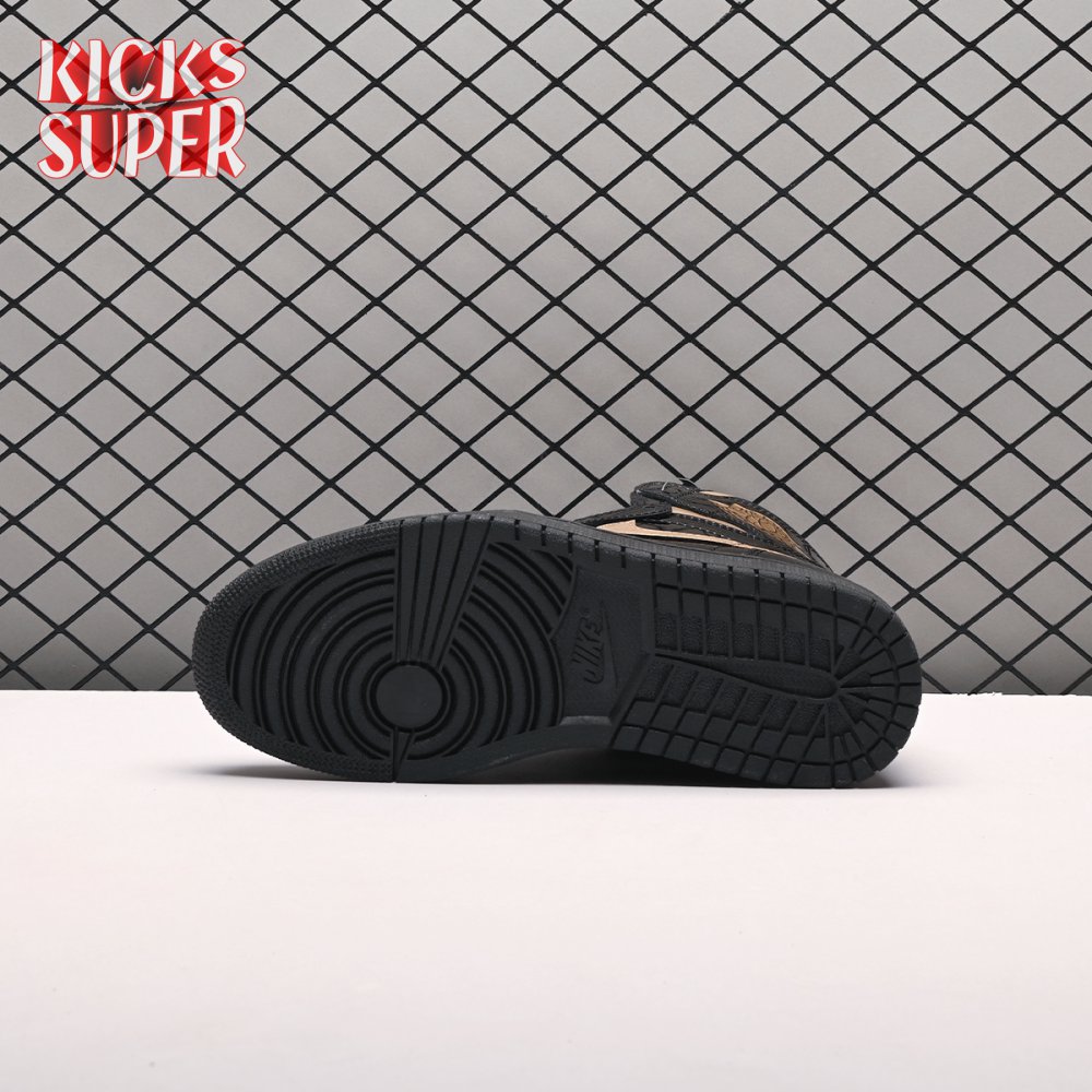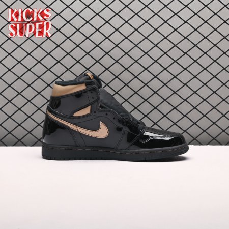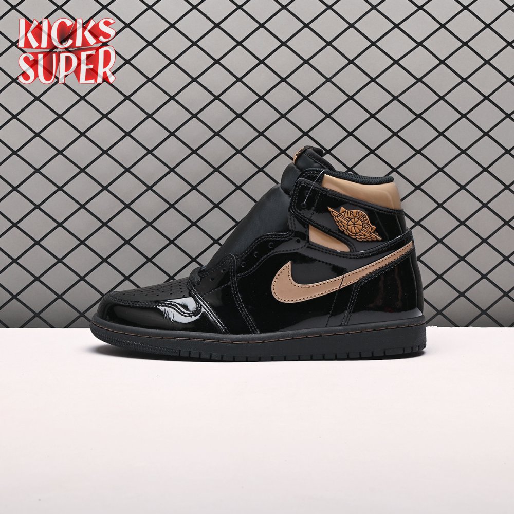 The Air Jordan 1 Retro High OG "Black Metallic Gold" seemingly takes inspiration from an Air Jordan 1 Mid from 2003 that similarly utilized a black patent leather upper with gilded accents. This pair adds OG touches in the form of a printed Wings logo on the lateral collar flap and a woven Nike tag atop the lightly padded nylon tongue. The two-tone palette is repeated on the sneaker"s tooling, featuring gold stitching that circles the black rubber cupsole.