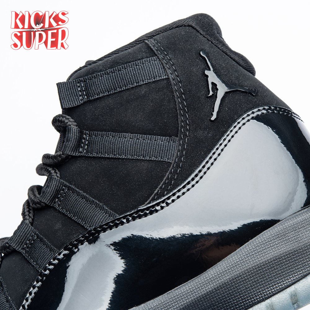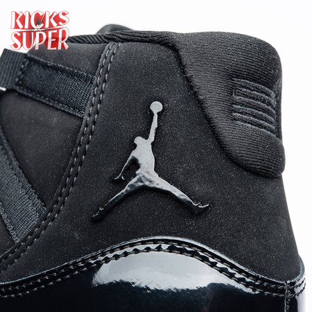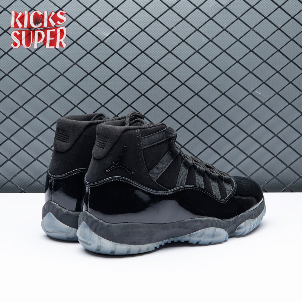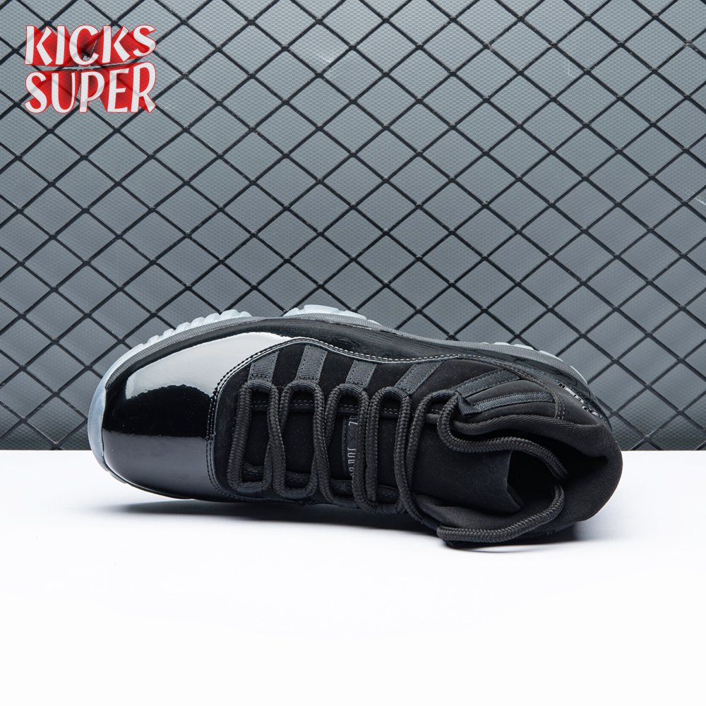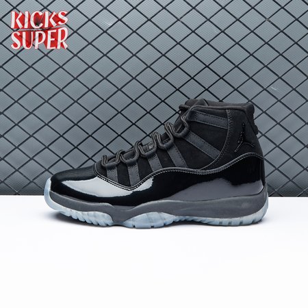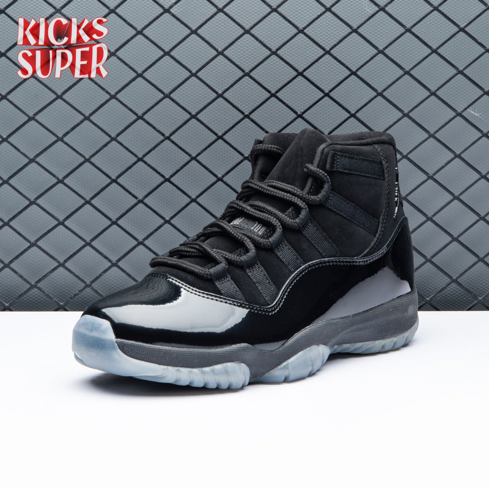 First teased in 2011 as a sample from the Air Jordan Blackout Collection, the Air Jordan 11 Retro 'Cap and Gown' was finally made available to the public in 2018. The name refers its formal look, designed to be worn for occasions such as graduation ceremonies"its laces are even inspired by graduation cords. The all-black model features a patent leather and premium nubuck upper atop an icy blue outsole.