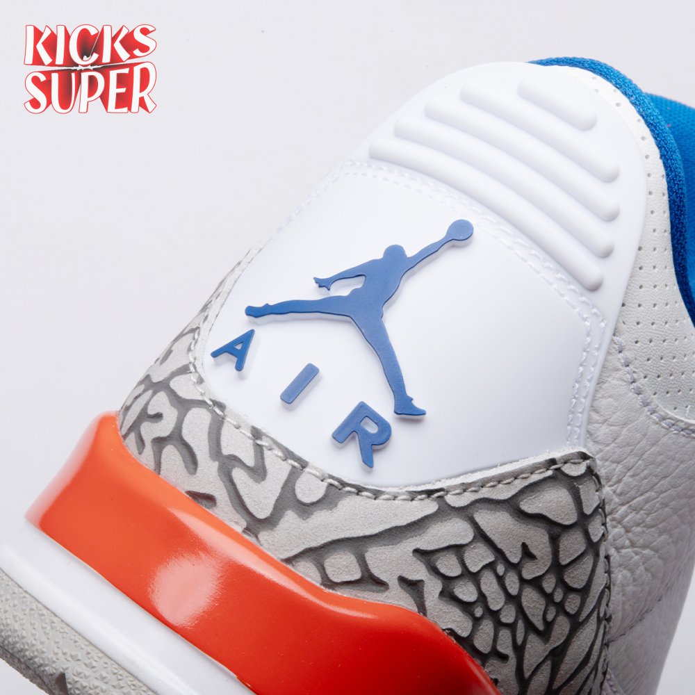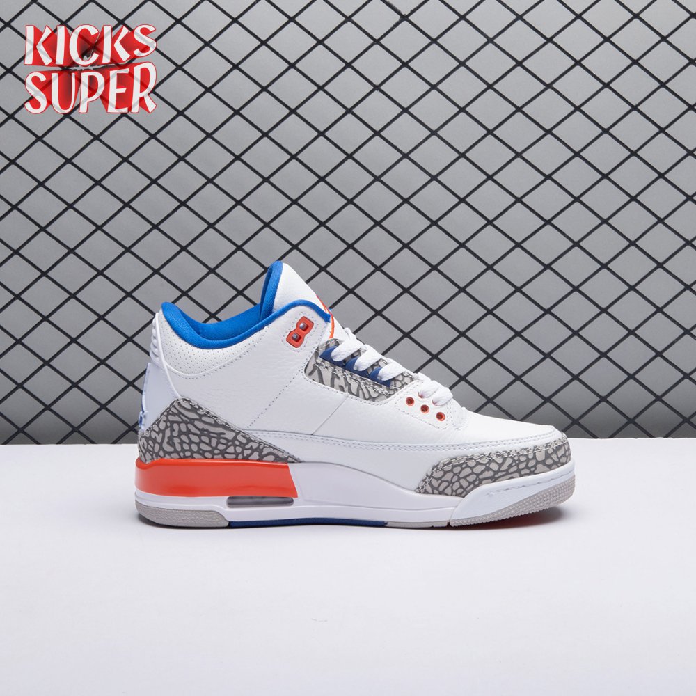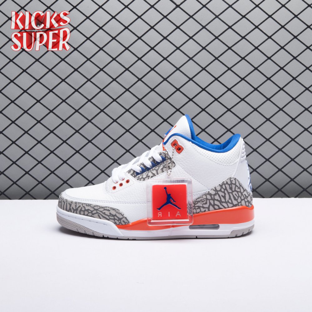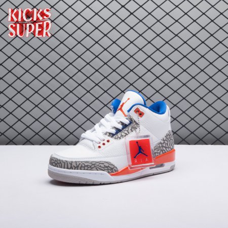 The Air Jordan 3 Retro 'Knicks Rivals' boasts a colorway inspired by a team Michael Jordan and the Chicago Bulls had to hurdle for Eastern Conference dominance, the New York Knicks. The AJ3 was the first of numerous Air Jordans designed by Tinker Hatfield and the debut of the Jumpman logo on the tongue. This 'Knicks Rivals' retro, released in September 2019, stays true to the original silhouette with a white tumbled leather upper, elephant print on the toe cap and heel, Old Royal and University Orange accents, and a visible Nike Air unit.