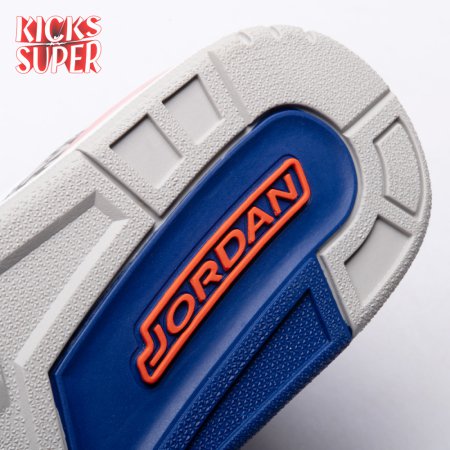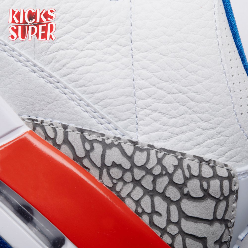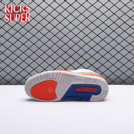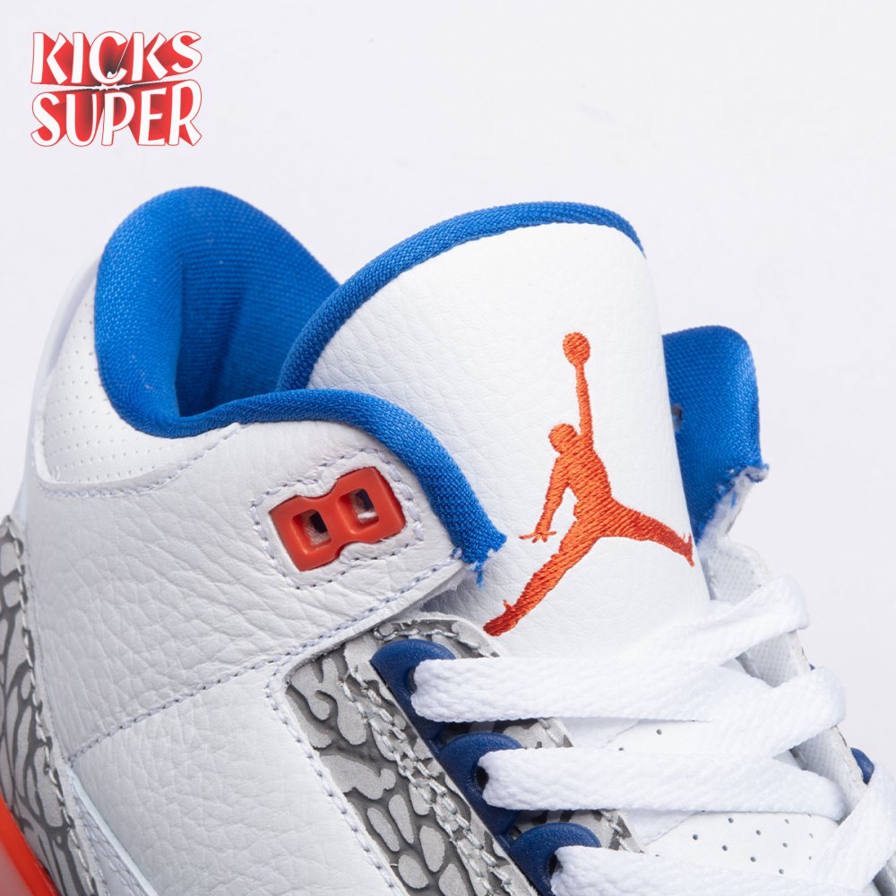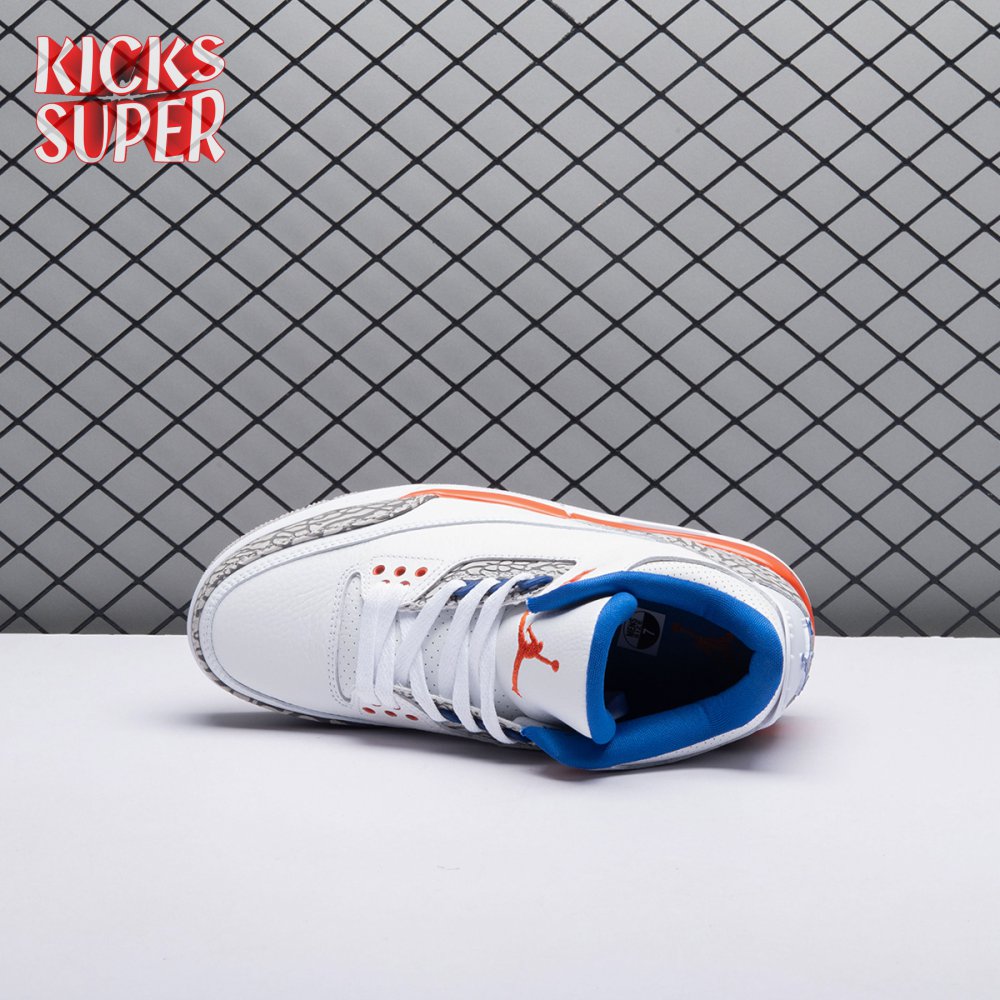 The Air Jordan 3 Retro 'Knicks Rivals' boasts a colorway inspired by a team Michael Jordan and the Chicago Bulls had to hurdle for Eastern Conference dominance, the New York Knicks. The AJ3 was the first of numerous Air Jordans designed by Tinker Hatfield and the debut of the Jumpman logo on the tongue. This 'Knicks Rivals' retro, released in September 2019, stays true to the original silhouette with a white tumbled leather upper, elephant print on the toe cap and heel, Old Royal and University Orange accents, and a visible Nike Air unit.