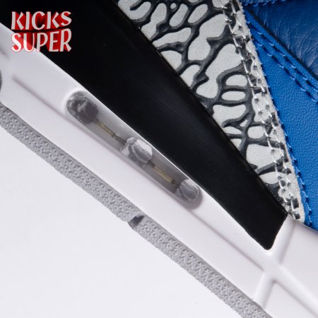 The Air Jordan 3 Retro "Varsity Royal" showcases an OG-inspired look, complete with signature details inextricably tied to Jordan heritage. They include embroidered Jumpman branding atop the tongue, visible Air cushioning in the midsole and grey elephant-print overlays at the toe and heel. The tumbled leather upper is rendered in a royal blue finish, a non-Chicago hue that figures prominently throughout the history of the franchise. A second Jumpman logo adorns the molded heel panel.