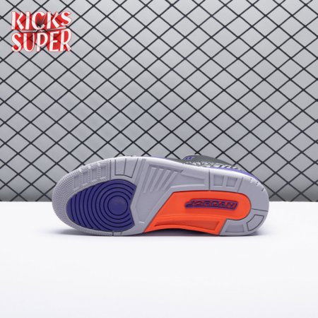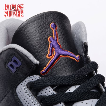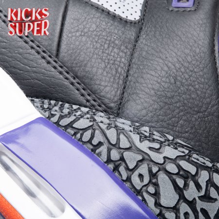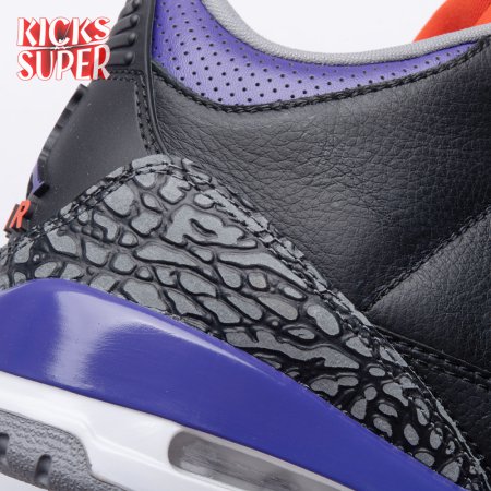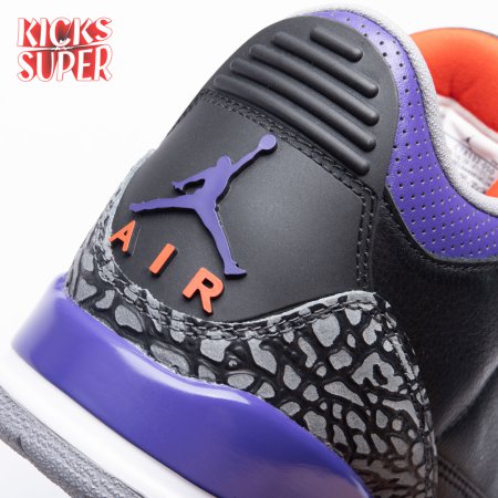 The Air Jordan 3 Retro "Court Purple" makes use of a black tumbled leather upper with signature elephant print overlays at the toe and heel. Violet accents make their way to the padded collar, eyelets and two-tone midsole, featuring visible Air cushioning in the heel. Unexpected pops of vibrant orange stand out on the sneaker"s interior tongue and branding elements, highlighted by a raised Jumpman icon atop the tongue and heel.