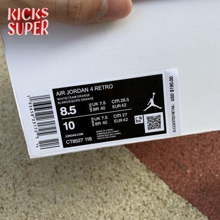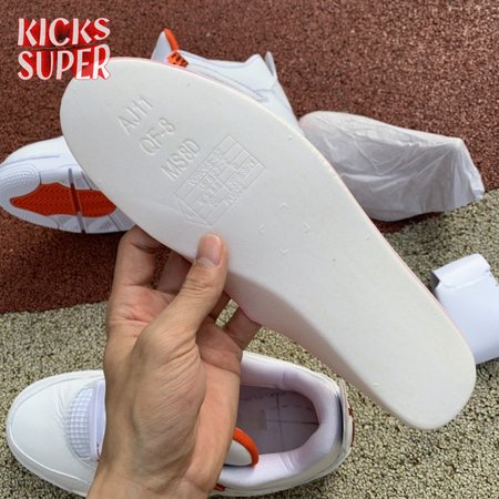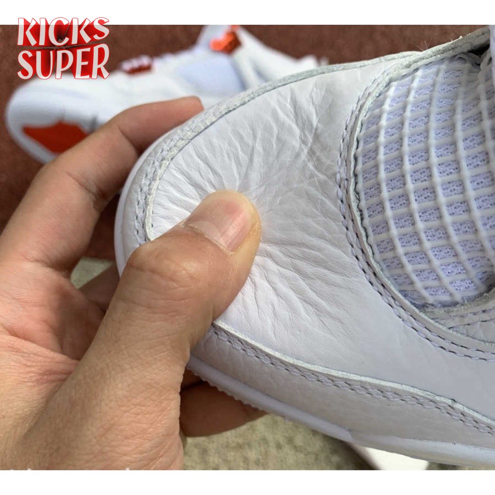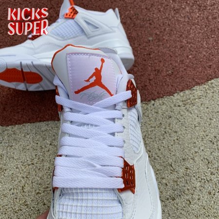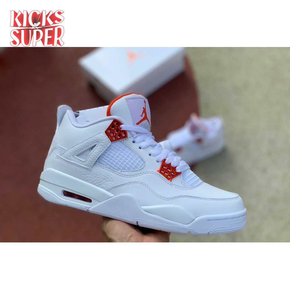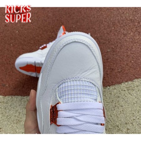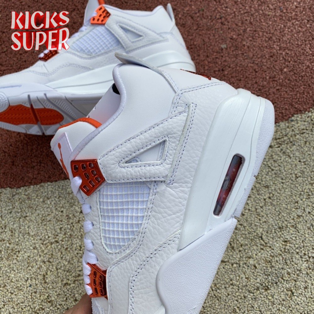 The Air Jordan 4 Retro "Orange Metallic" dons an all-white leather build, with its white monochromatic finish punctuated by sharp bursts of Team Orange on the eyelets, interior tongue and Jumpman branding hits, located on the woven tongue tag and heel. The visible Max Air unit embedded in the heel of the midsole is similarly tinted orange. The kicks dropped alongside three additional colorways in Court Purple, University Red and Pine Green.