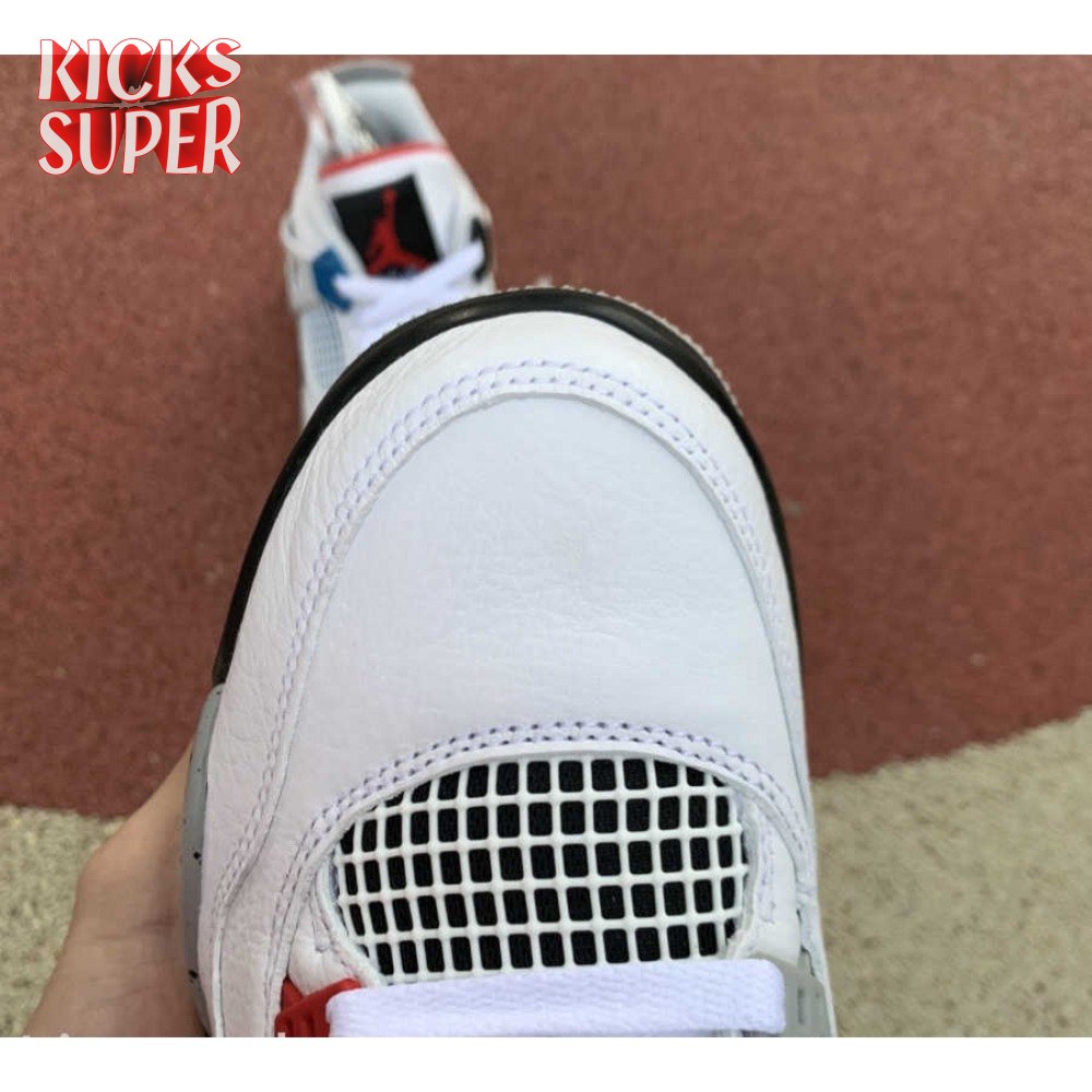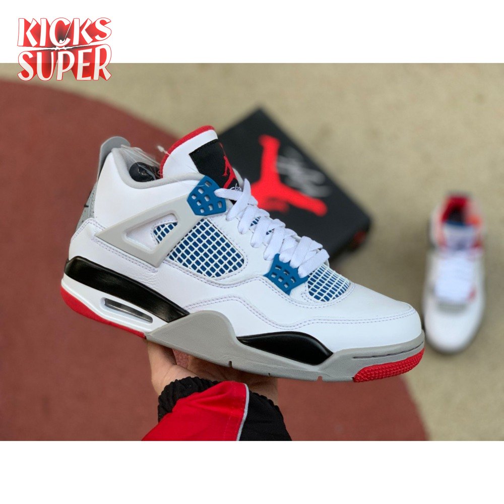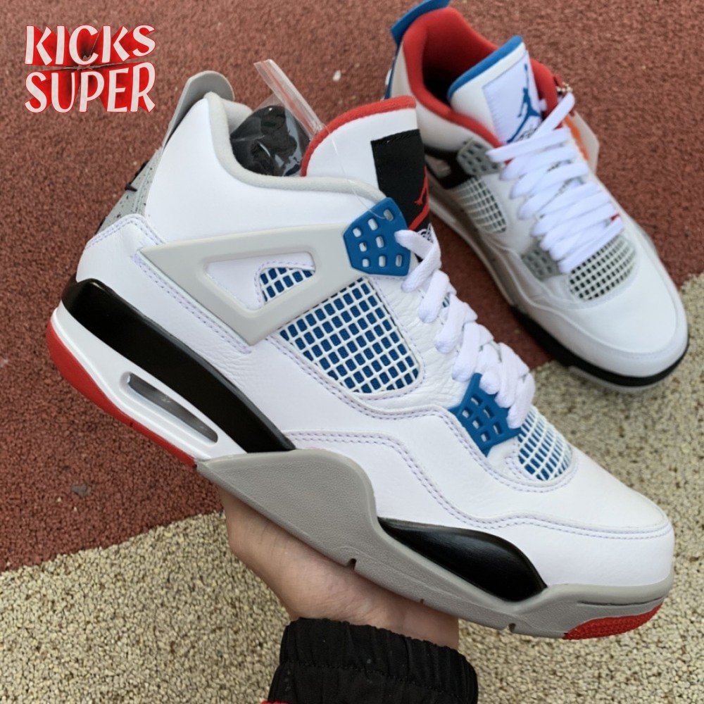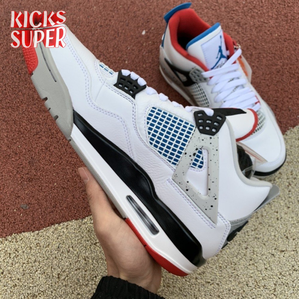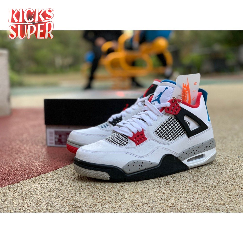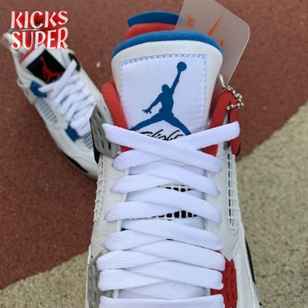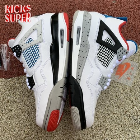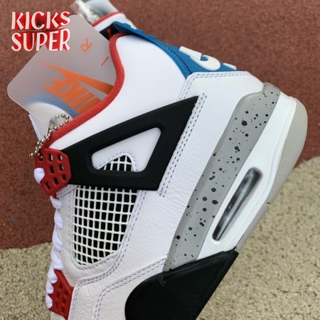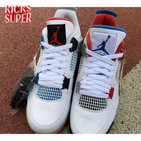 Released in November 2019, the Air Jordan 4 Retro SE 'What The 4' takes the original four colorways of the Air Jordan 4 and combines them in a 'What The' format that has been seen on several Nike silhouettes. This original color palette is realized on the entire shoe, with the beloved Varsity Red, Cement Grey and Military Blue that Jordan 4 fans recognize and love. The discordant aesthetic works across the leather uppers, signature lacing wings and Jumpman logos on the tongue and heel to create something familiar yet new.