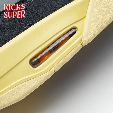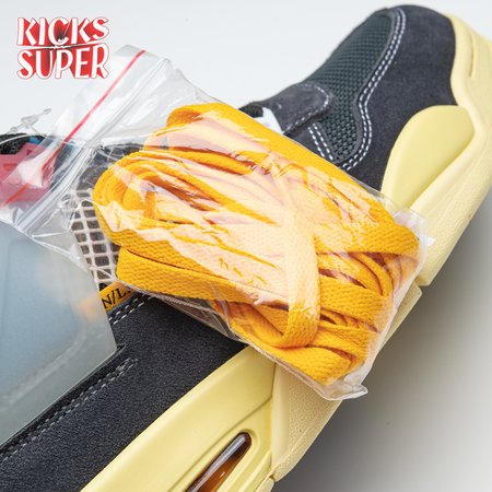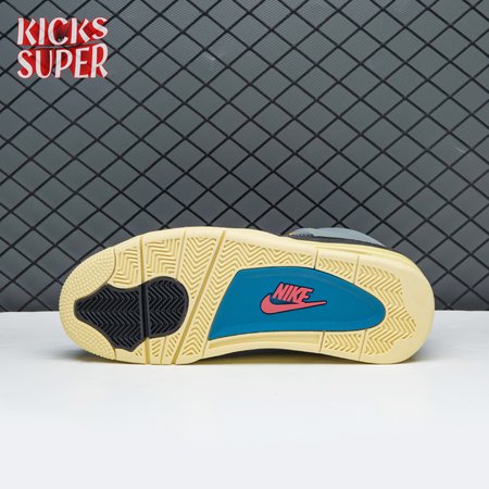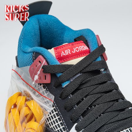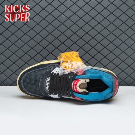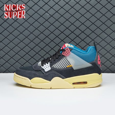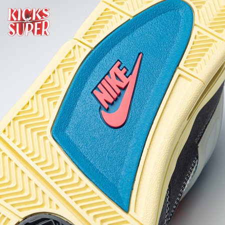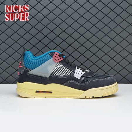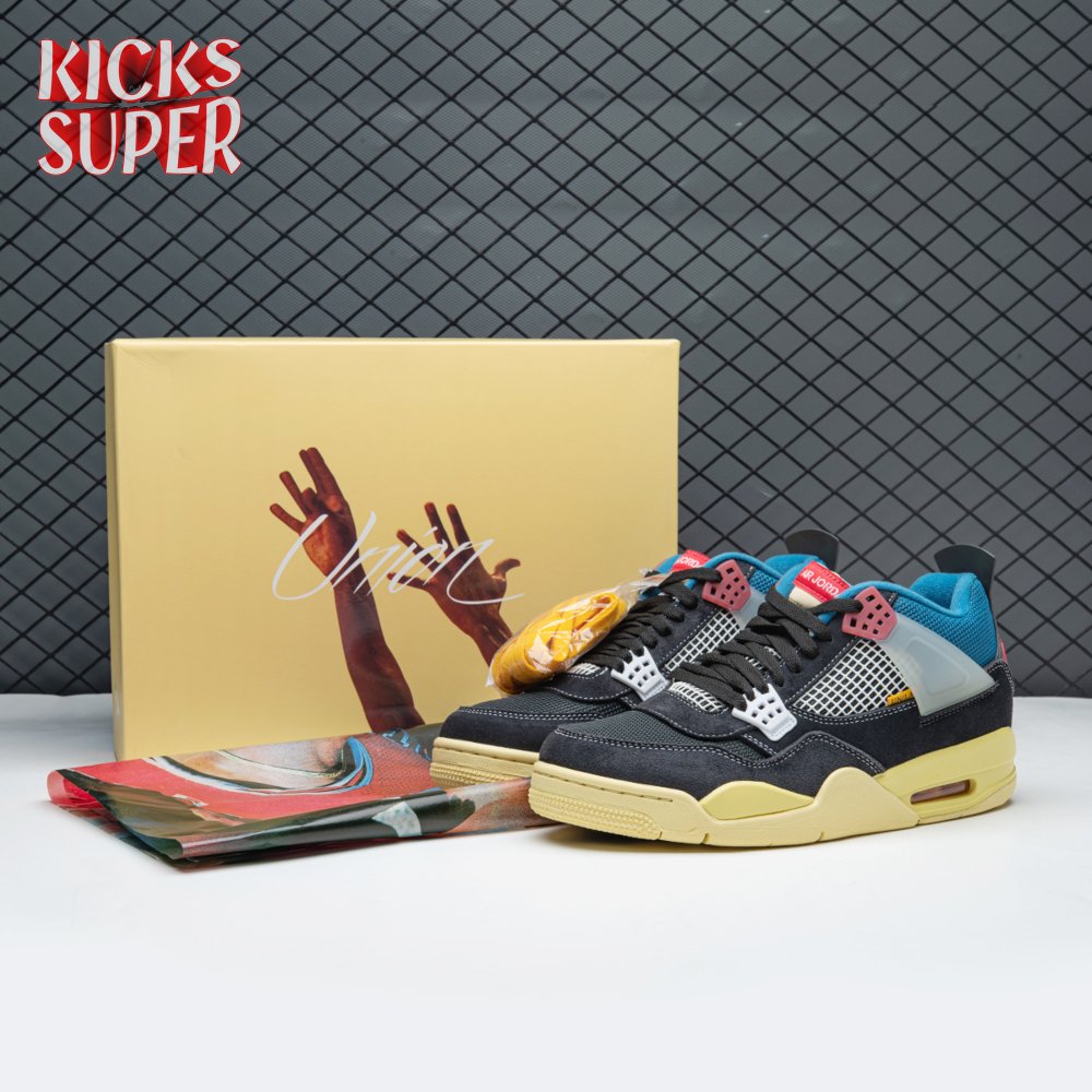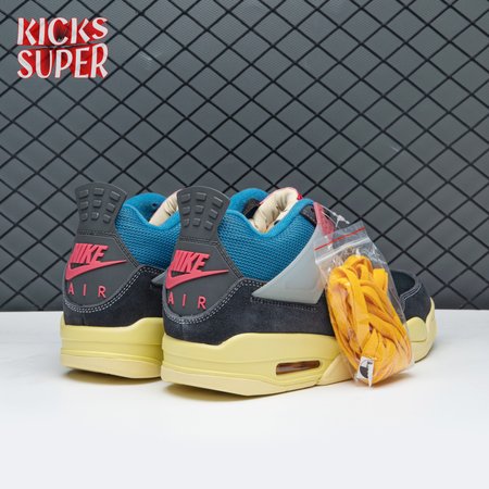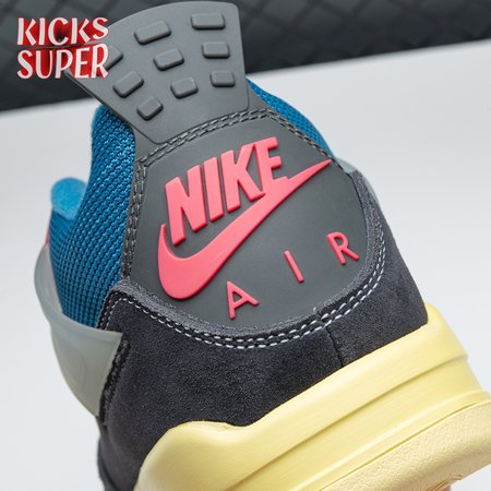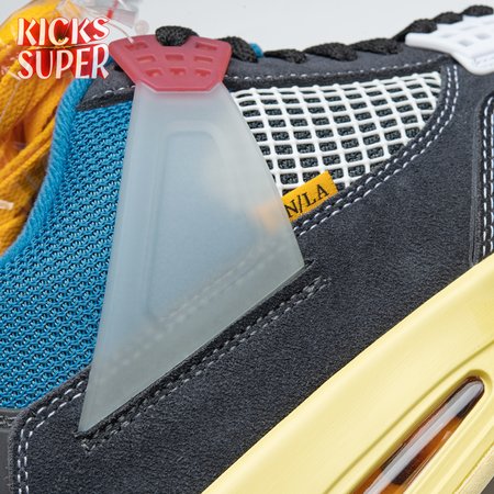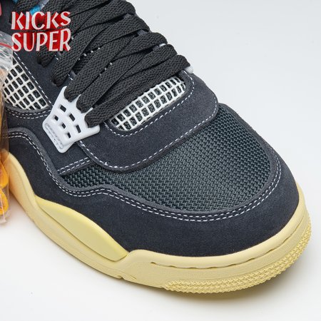 The Union LA x Air Jordan 4 Retro "Off Noir" represents the follow-up effort to the duo"s highly coveted Air Jordan 1 collaboration from 2018. The updated design features a black suede upper with matching black mesh on the toe box and blue mesh around the collar. The semi-translucent structural wings are attached to molded red eyelets, matching the woven Air Jordan tag atop the padded tongue and Nike Air branding on the heel. The TPU wings are filled in, reminiscent of an original Tinker Hatfield sketch of the AJ4, while the AIR JORDAN tag usually found on the inside of the tongue conveys a unique look, like someone folded the tongue over to expose the inside tag. Finally, a 'UN/LA' tag on the side panel shows the Union heritage and a yellowed midsole conveys a vintage aesthetic.