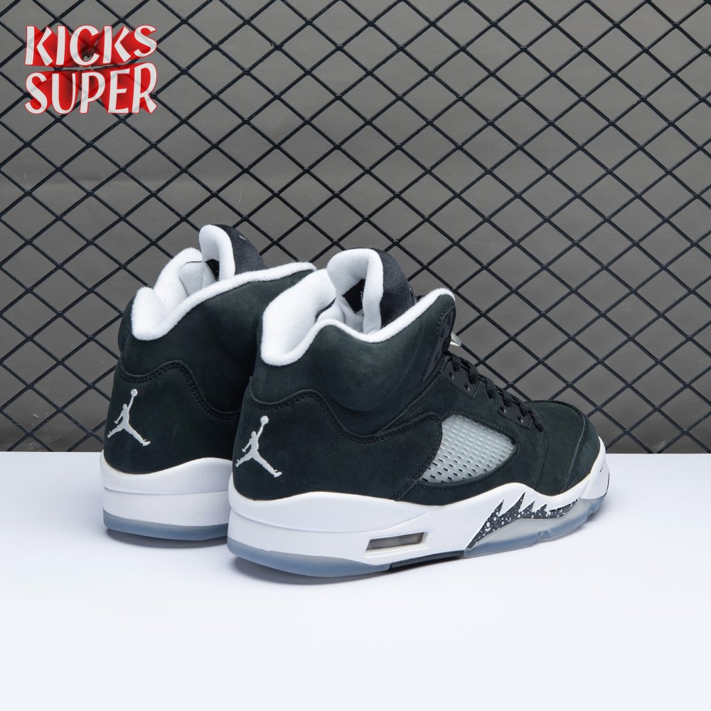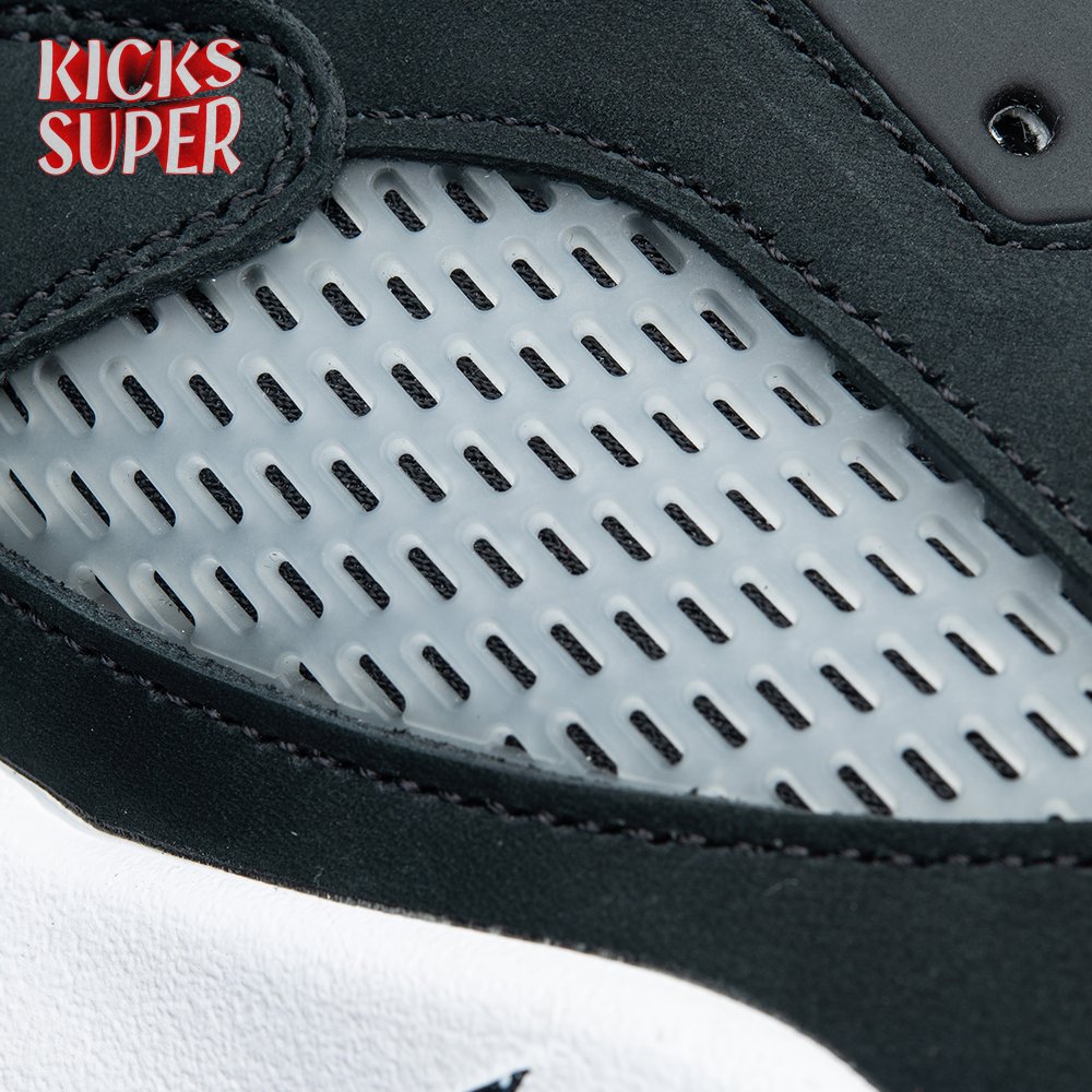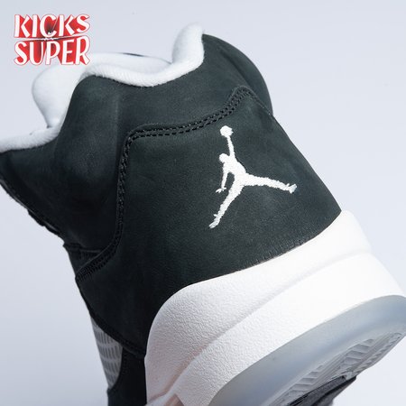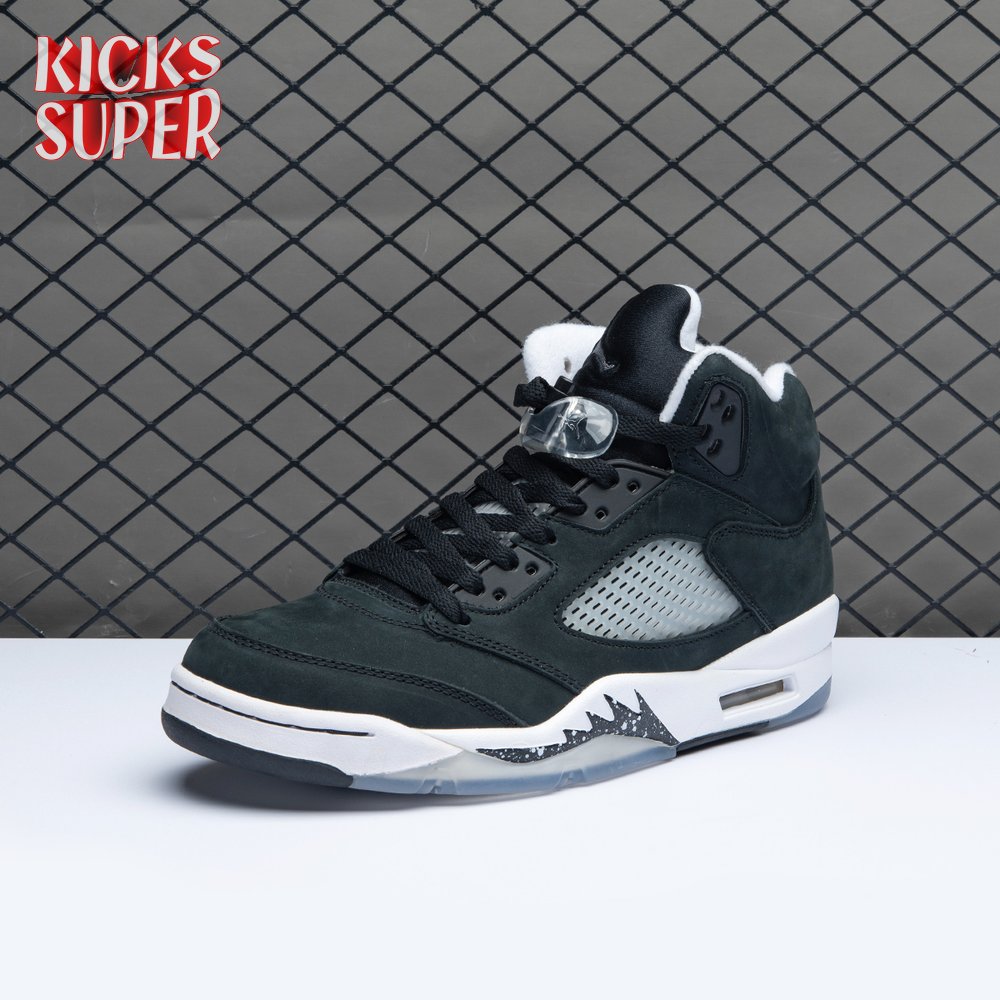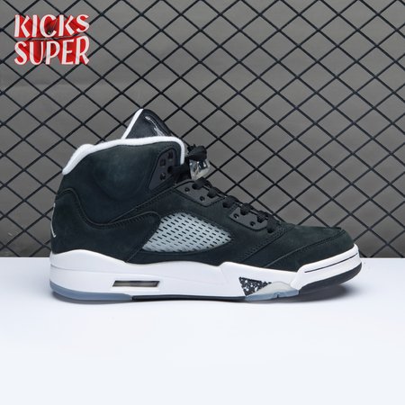 The 2021 edition of the Air Jordan 5 Retro "Oreo" 2021brings back a simple two-tone colorway first released in 2013. The build is faithful to the original, featuring a black suede upper with tonal TPU eyelets, translucent quarter panel netting and a grey Jumpman embroidered on the tongue. Contrasting white hits appear on the collar lining, interior tongue and Jumpman heel branding. The mid-top sits on a white polyurethane midsole with a visible Air unit nestled in the heel and black shark-tooth detailing dusted in white speckles. Underfoot, an icy rubber outsole delivers stop-and-go traction.