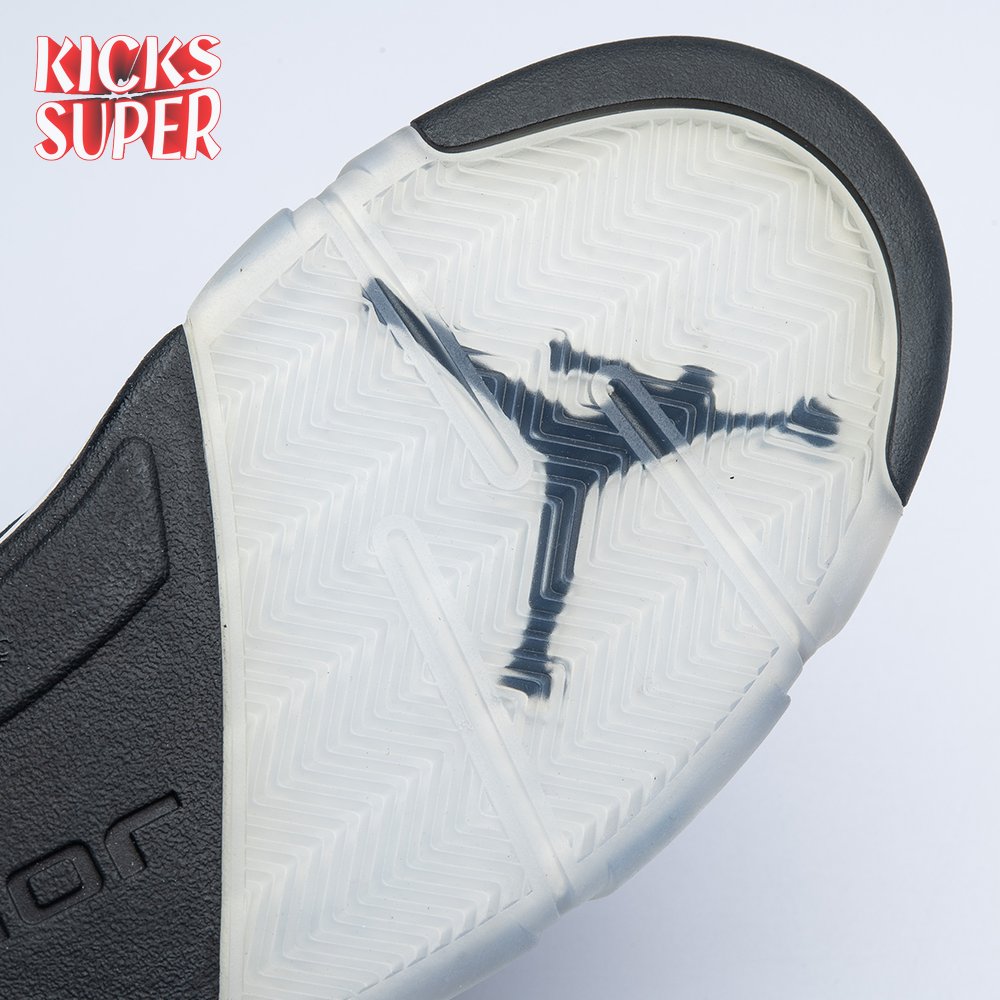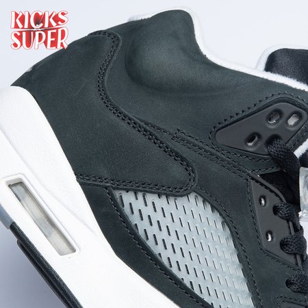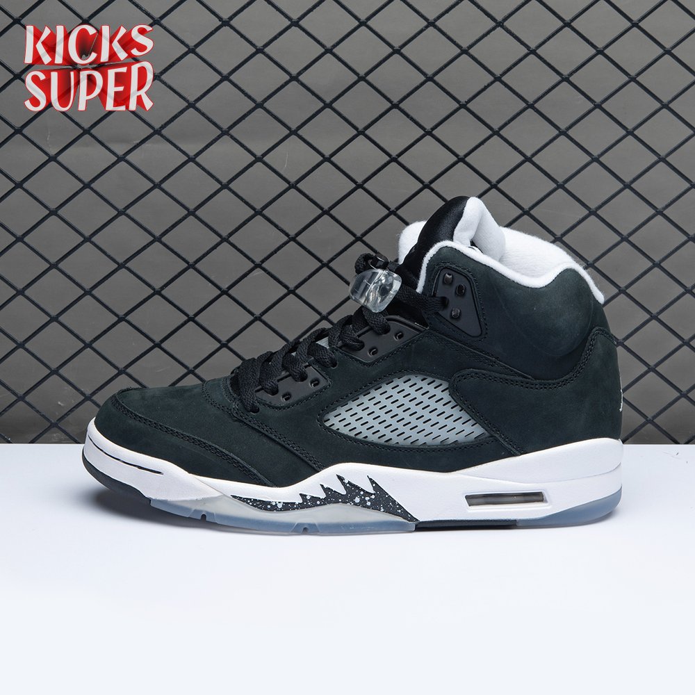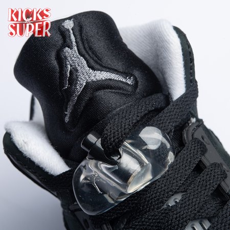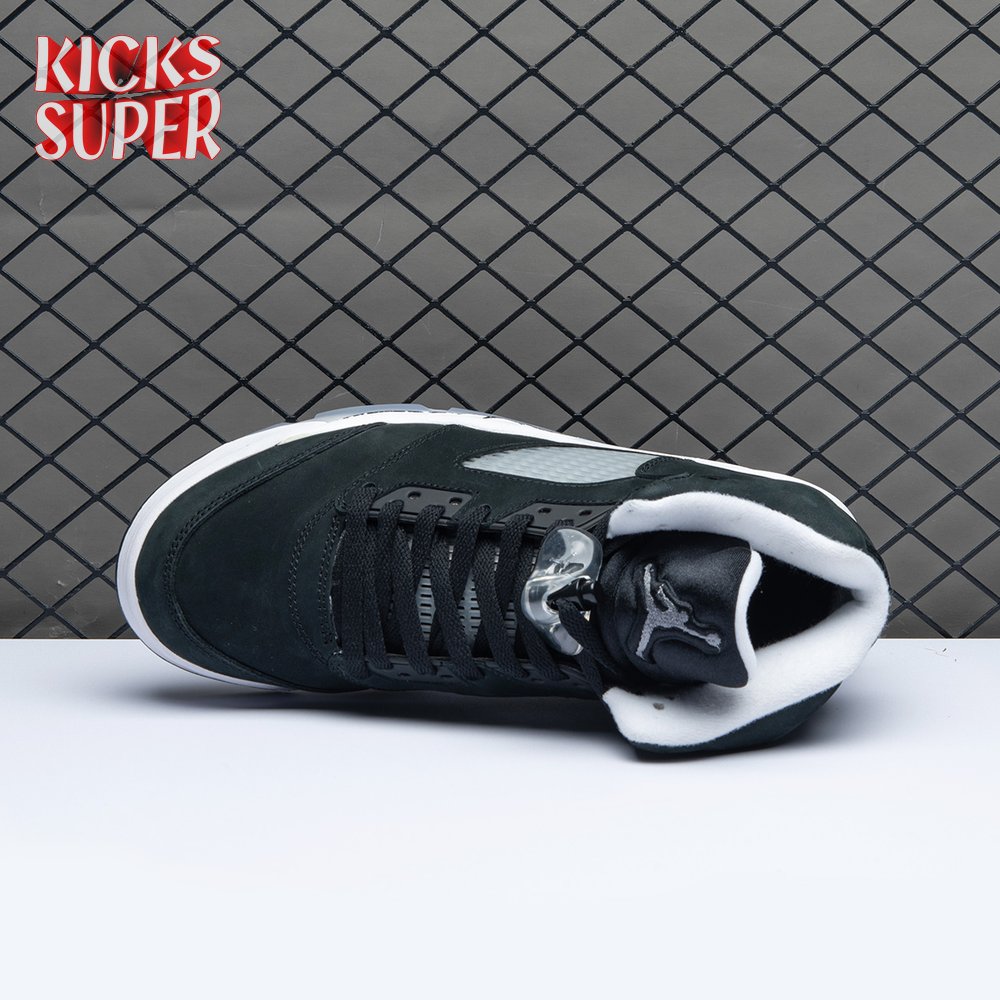 The 2021 edition of the Air Jordan 5 Retro "Oreo" 2021brings back a simple two-tone colorway first released in 2013. The build is faithful to the original, featuring a black suede upper with tonal TPU eyelets, translucent quarter panel netting and a grey Jumpman embroidered on the tongue. Contrasting white hits appear on the collar lining, interior tongue and Jumpman heel branding. The mid-top sits on a white polyurethane midsole with a visible Air unit nestled in the heel and black shark-tooth detailing dusted in white speckles. Underfoot, an icy rubber outsole delivers stop-and-go traction.