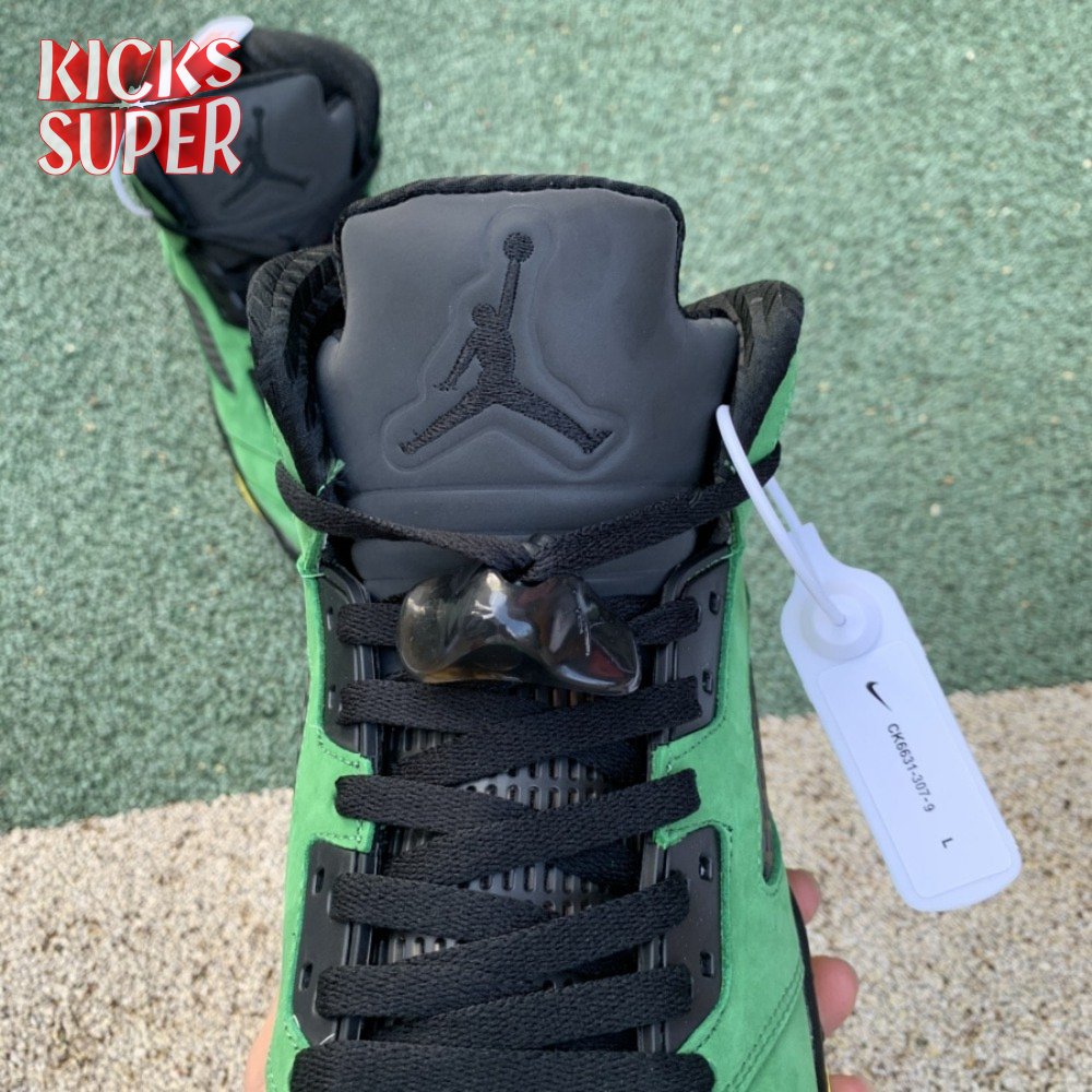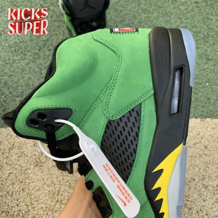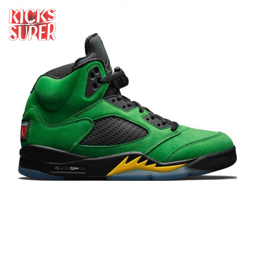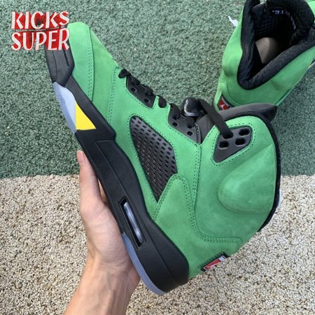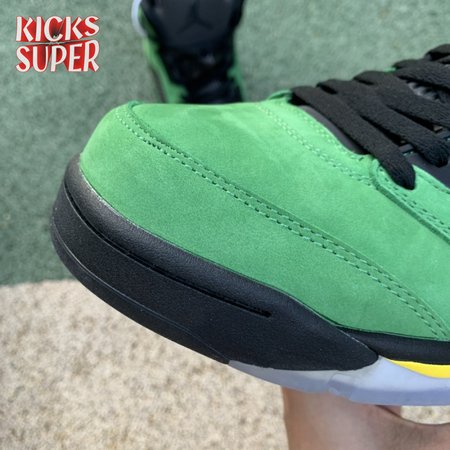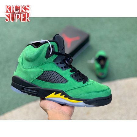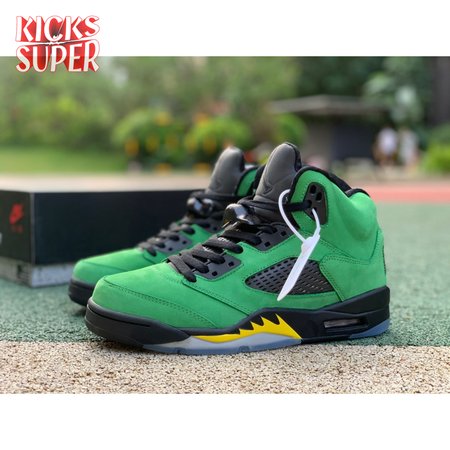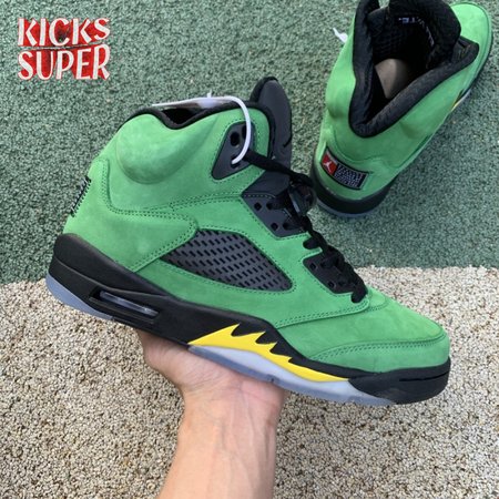 The Air Jordan 5 Retro SE "Oregon" features a distinctive color scheme paying tribute to the Oregon Ducks. Like the university"s PE edition, the shoe uses a green suede upper accented with a Team Jordan woven tag on the heel and contrasting black hits on the eyelets, tongue and quarter panel netting. The mid-top rides on a black foam midsole, accented with yellow shark tooth detailing and reinforced with a translucent rubber outsole.