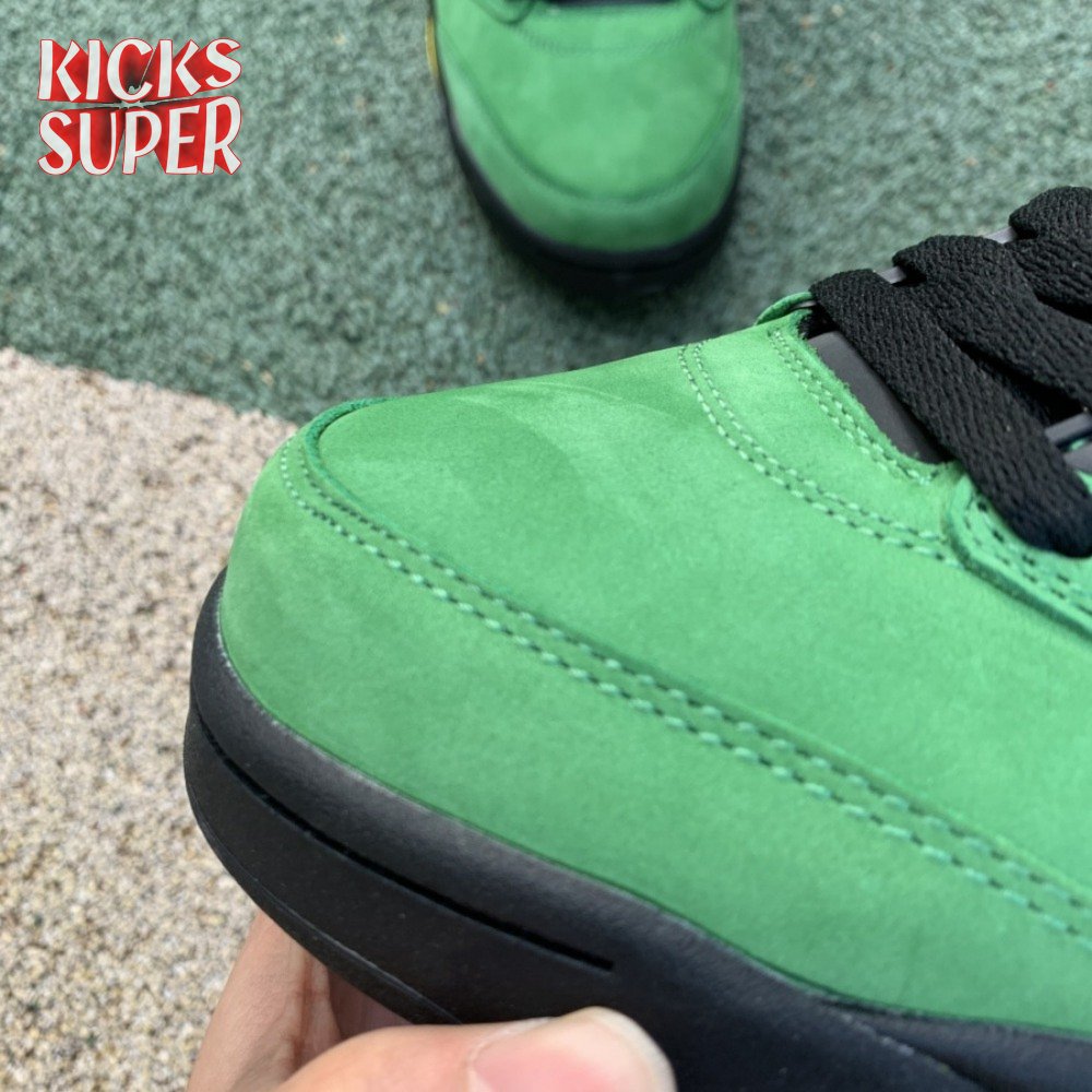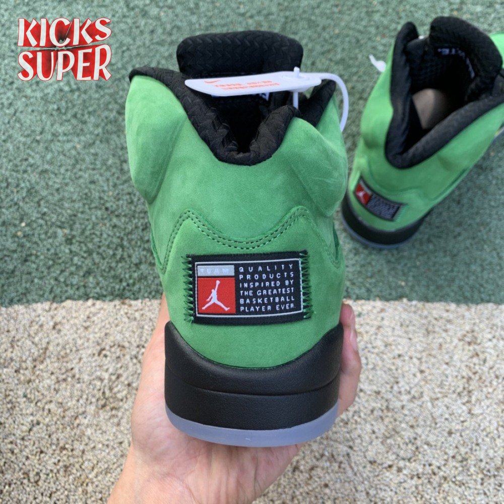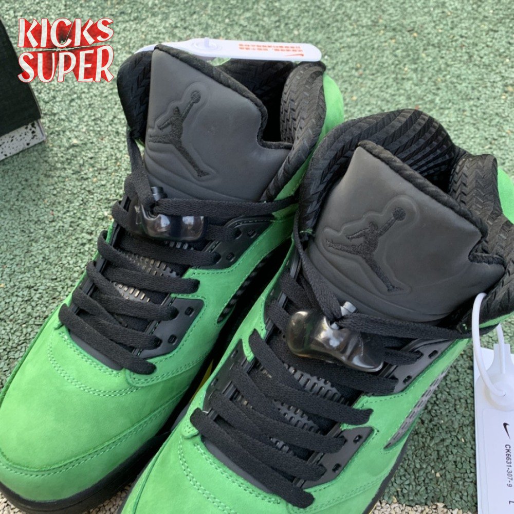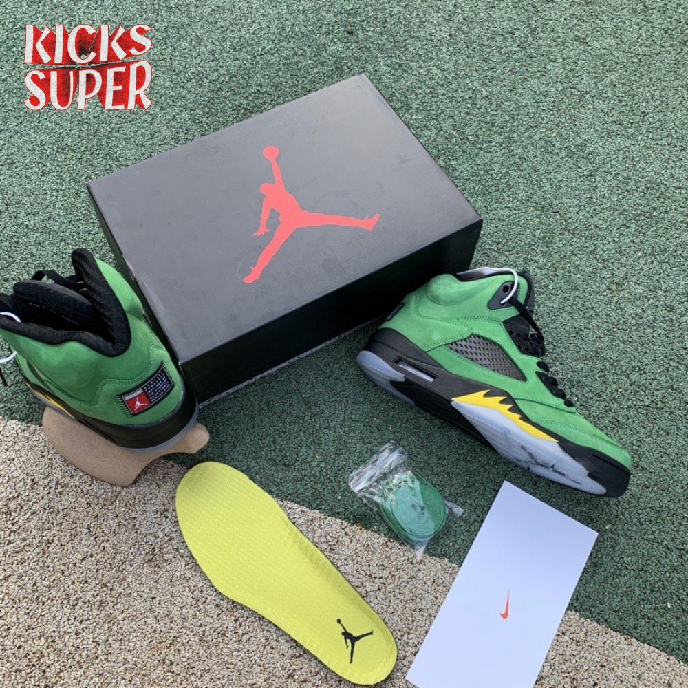 The Air Jordan 5 Retro SE "Oregon" features a distinctive color scheme paying tribute to the Oregon Ducks. Like the university"s PE edition, the shoe uses a green suede upper accented with a Team Jordan woven tag on the heel and contrasting black hits on the eyelets, tongue and quarter panel netting. The mid-top rides on a black foam midsole, accented with yellow shark tooth detailing and reinforced with a translucent rubber outsole.