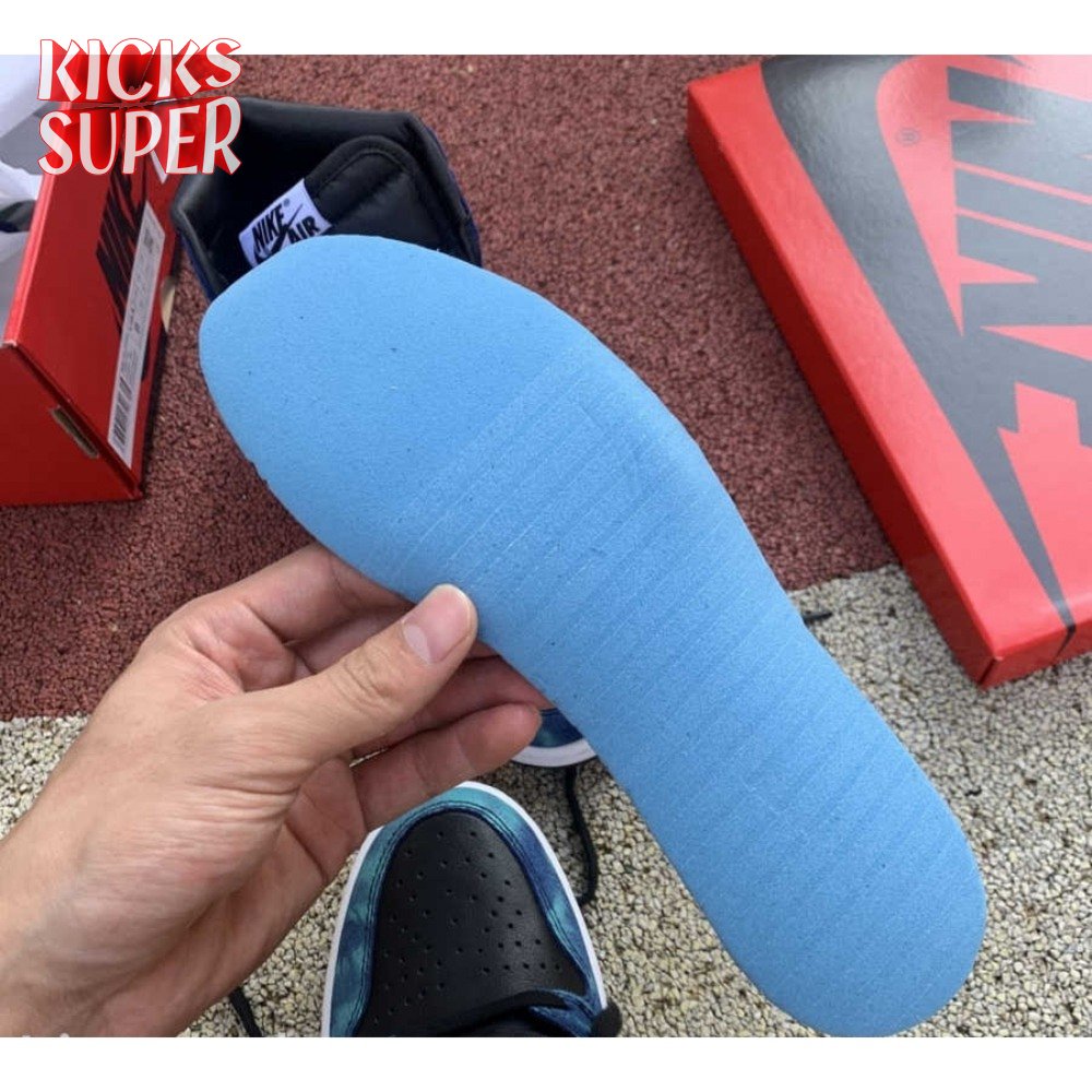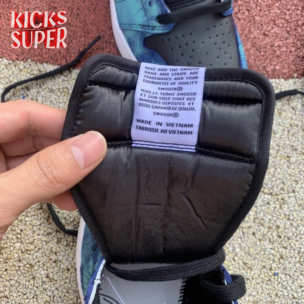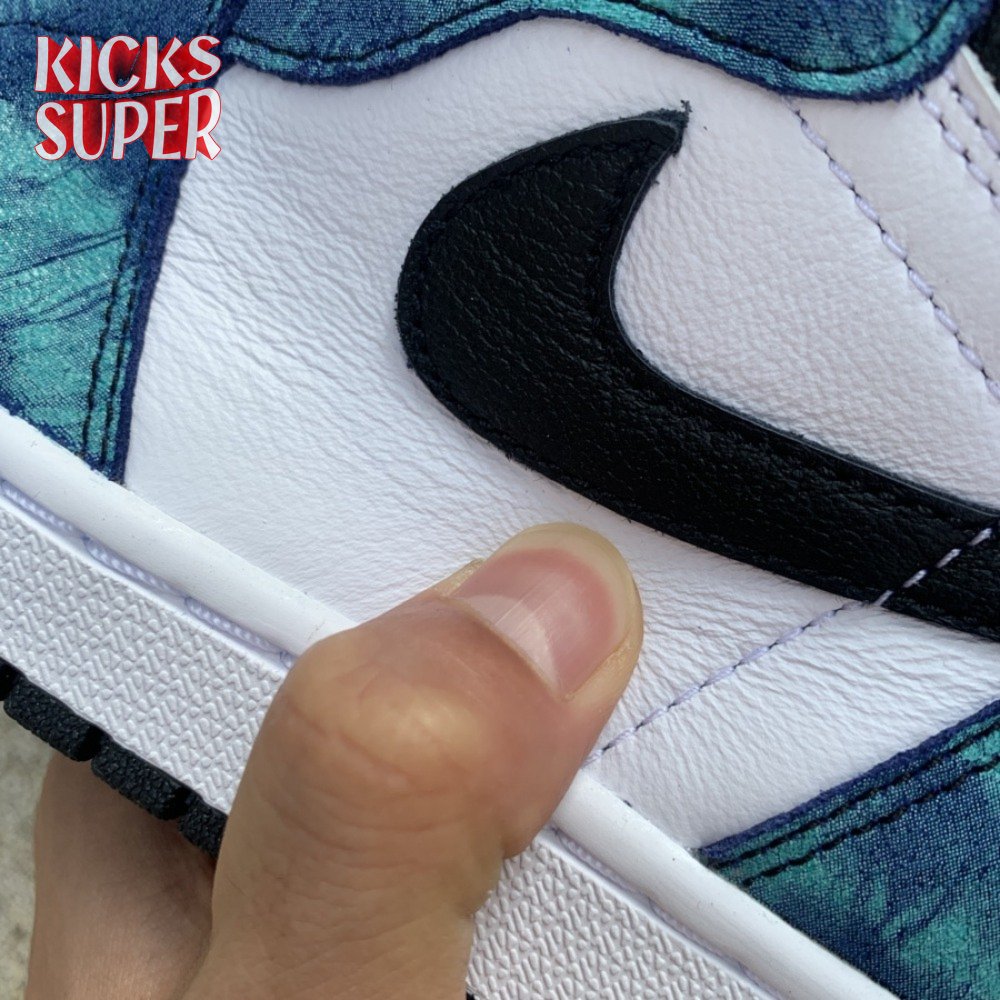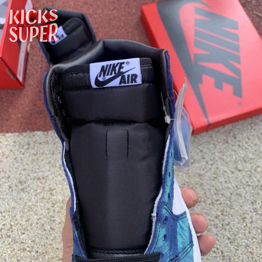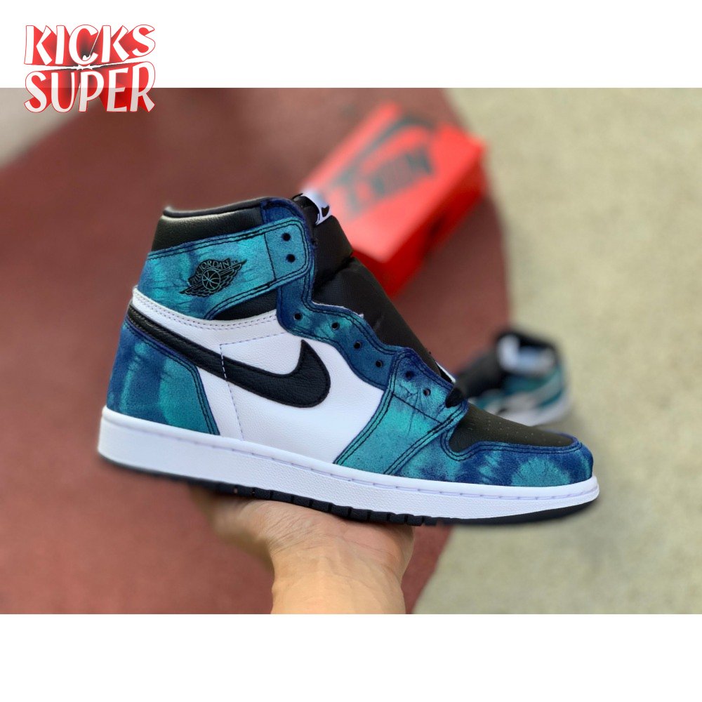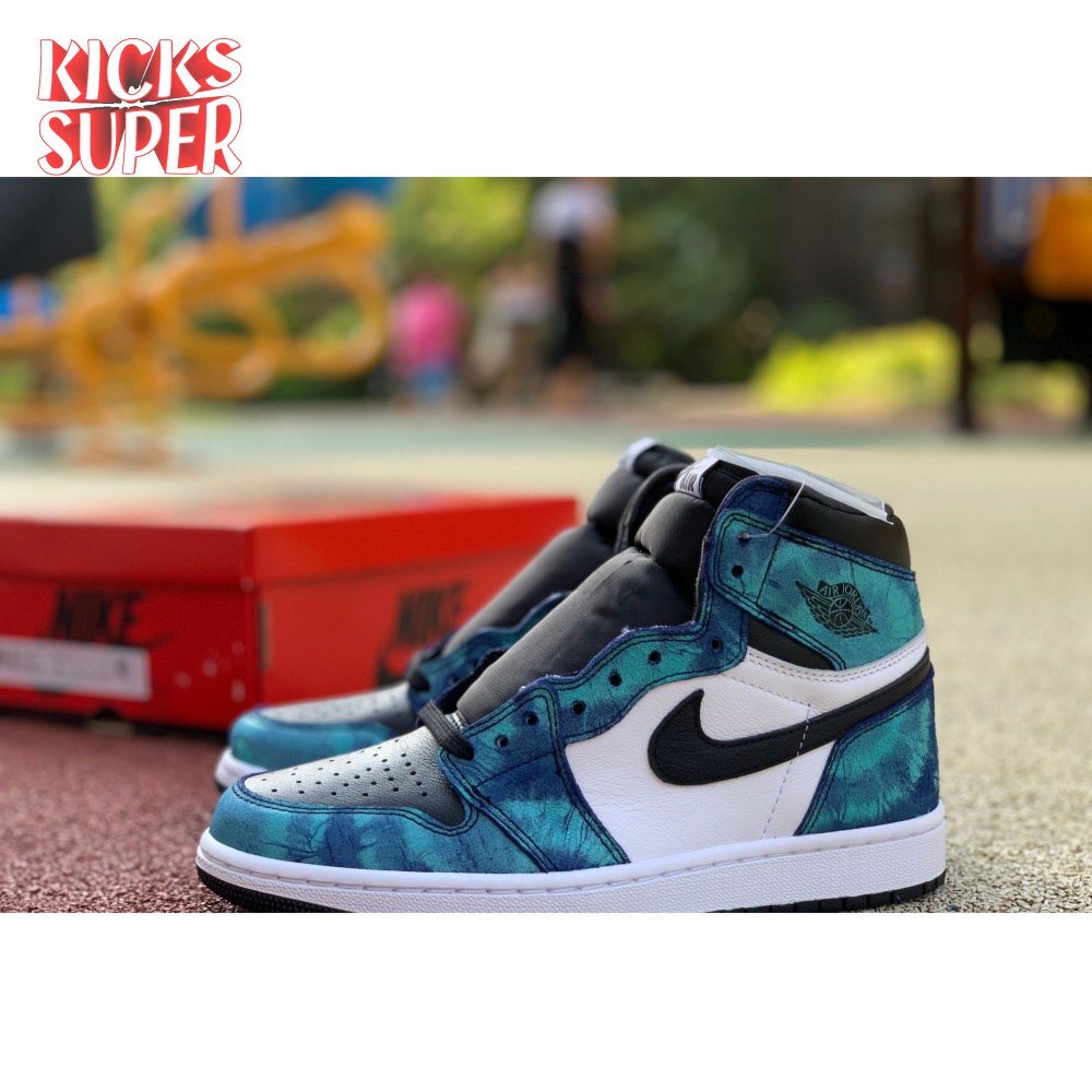 The women"s Air Jordan 1 Retro High OG "Tie-Dye" gives the iconic silhouette a fashion-forward look, highlighted by a faux hand-dyed effect on the sneaker"s heel and forefoot overlays. The swirling blue and teal hues are offset by a white leather quarter panel and contrasting black leather on the collar and toe box. Branding elements include a black Swoosh, matching black Wings logo and a Nike tag atop the lightly padded nylon tongue.
