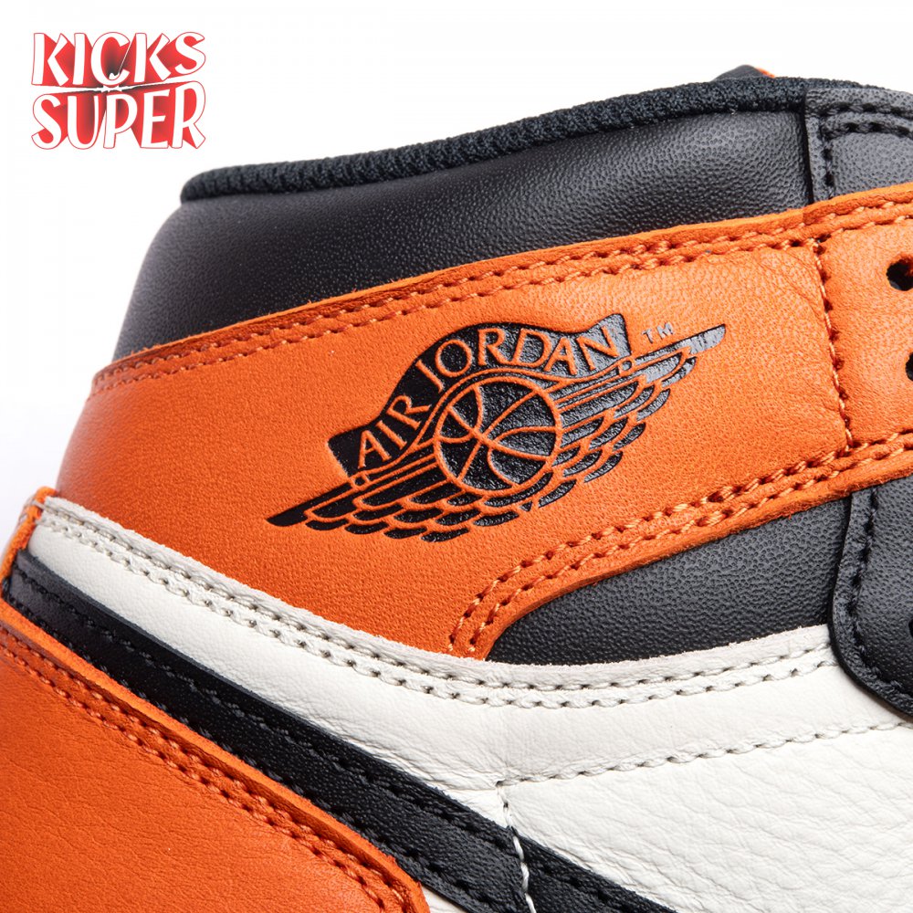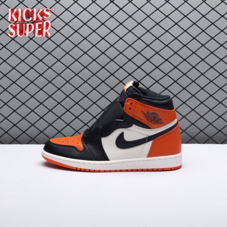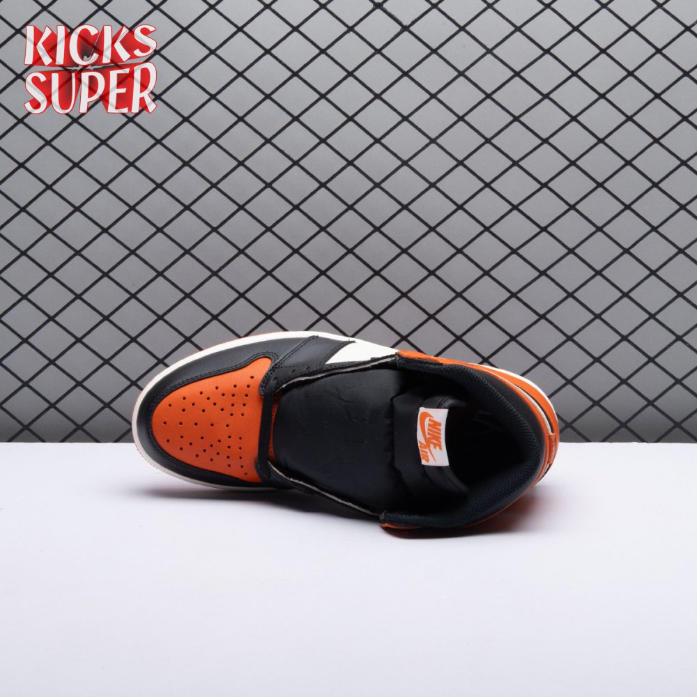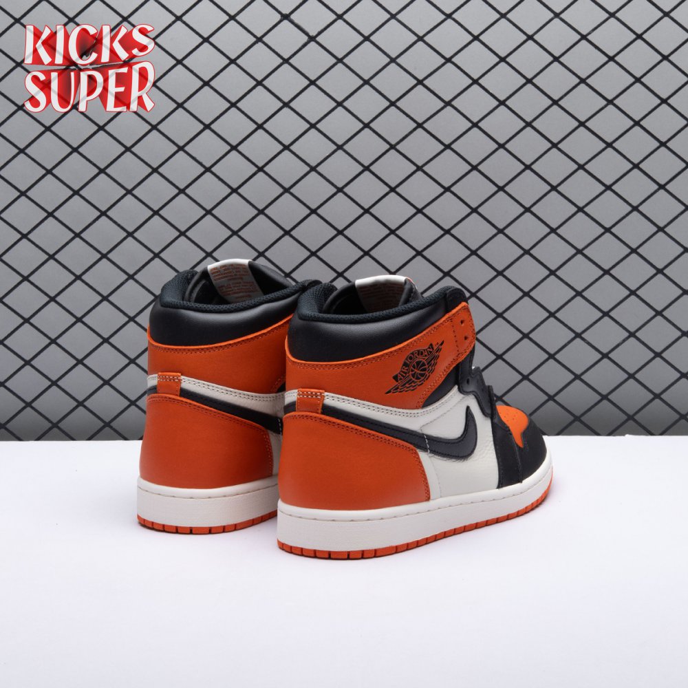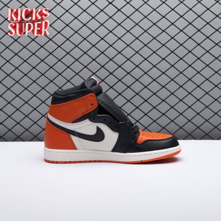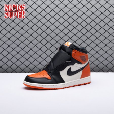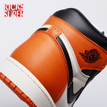 In 1985 on a Nike Europe tour, Michael Jordan shattered a backboard when throwing down a monstrous dunk while wearing an orange, black, and white uniform. Commemorating the moment and uniform, this 2015 Air Jordan 1 'Shattered Backboard' (aka 'Shattered Backboard' 1.0) sneaker was released. Shortly after in the Fall of 2016, an Air Jordan 1 'Shattered Backboard Away' (aka 'Reverse' and 'Shattered Backboard 2.0') was released. The sneaker keeps the black laces and Nike branding, but swaps out the orange toe box and black around the toe and tongue for white.