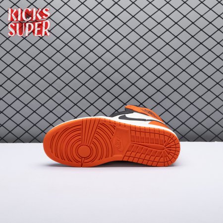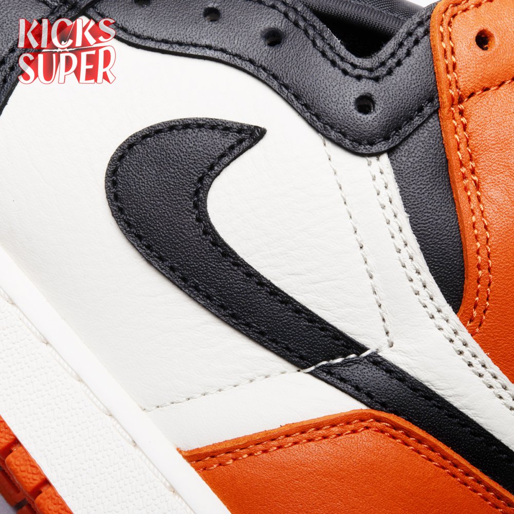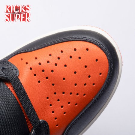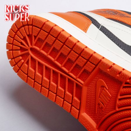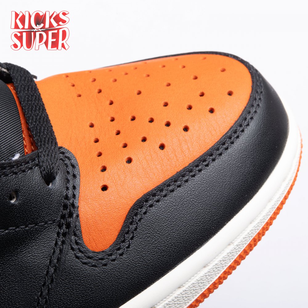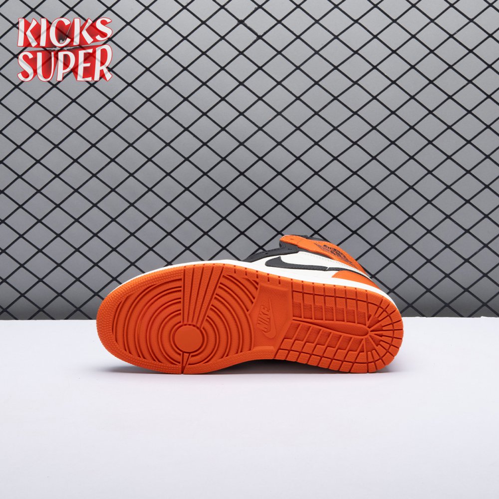 In 1985 on a Nike Europe tour, Michael Jordan shattered a backboard when throwing down a monstrous dunk while wearing an orange, black, and white uniform. Commemorating the moment and uniform, this 2015 Air Jordan 1 'Shattered Backboard' (aka 'Shattered Backboard' 1.0) sneaker was released. Shortly after in the Fall of 2016, an Air Jordan 1 'Shattered Backboard Away' (aka 'Reverse' and 'Shattered Backboard 2.0') was released. The sneaker keeps the black laces and Nike branding, but swaps out the orange toe box and black around the toe and tongue for white.