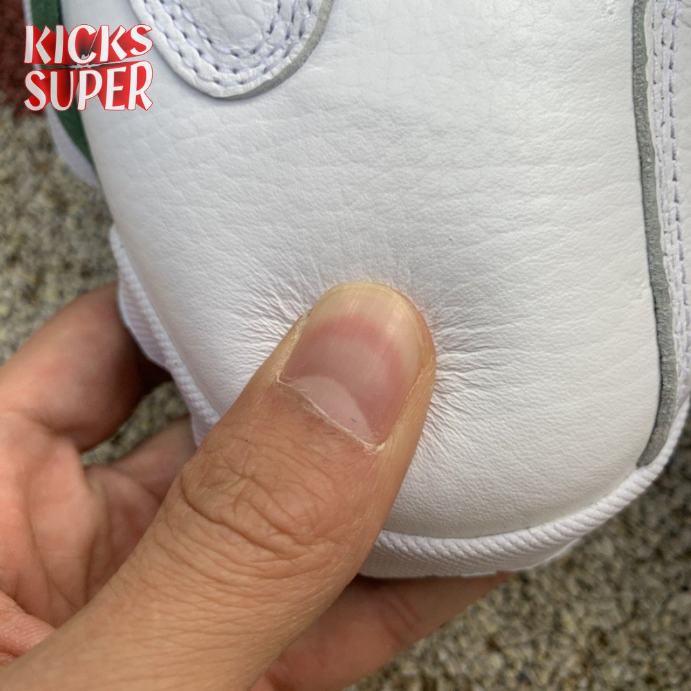 The Air Jordan 13 Retro "Lucky Green" makes use of a familiar design that calls to mind Ray Allen"s coveted Air "Three-Point Record" PE from 2011. The upper combines white tumbled leather with green synthetic suede, supported underfoot by the silhouette"s signature panther paw outsole in black rubber. Branding hits include a green embroidered Jumpman atop the tongue, matching the circular hologram on the lateral ankle.