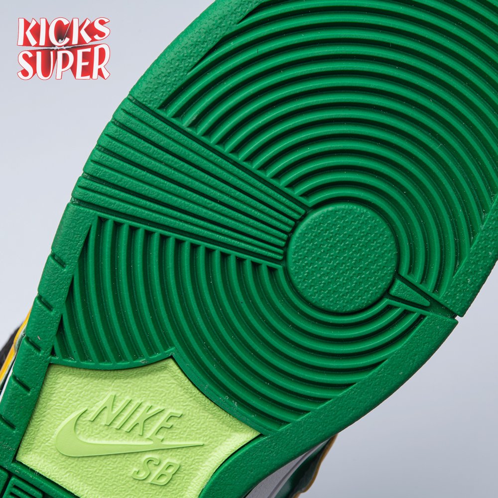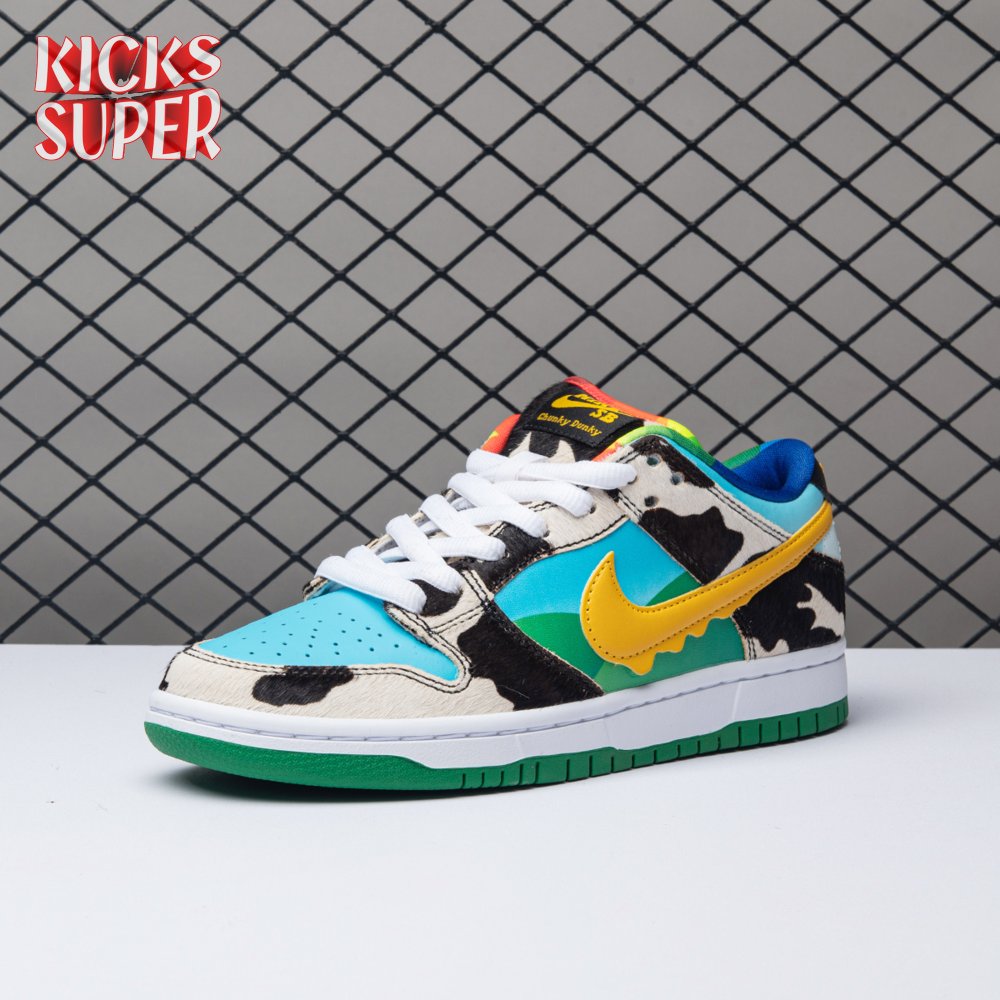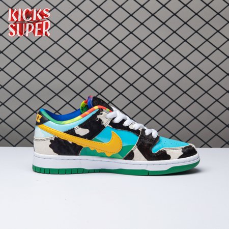 Made in collaboration with Ben & Jerry"s, the Nike Dunk Low SB "Chunky Dunky" replicates the packaging used for the ice cream brand"s Chunky Monkey flavor. The leather upper depicts blue skies and green pastures, while pony-hair overlays are rendered in a spotted cow print. A yellow leather Swoosh is treated to a melting ice cream effect for added visual flair. Atop the tongue, the woven tag features a Chunky Dunky callout alongside Nike SB branding.