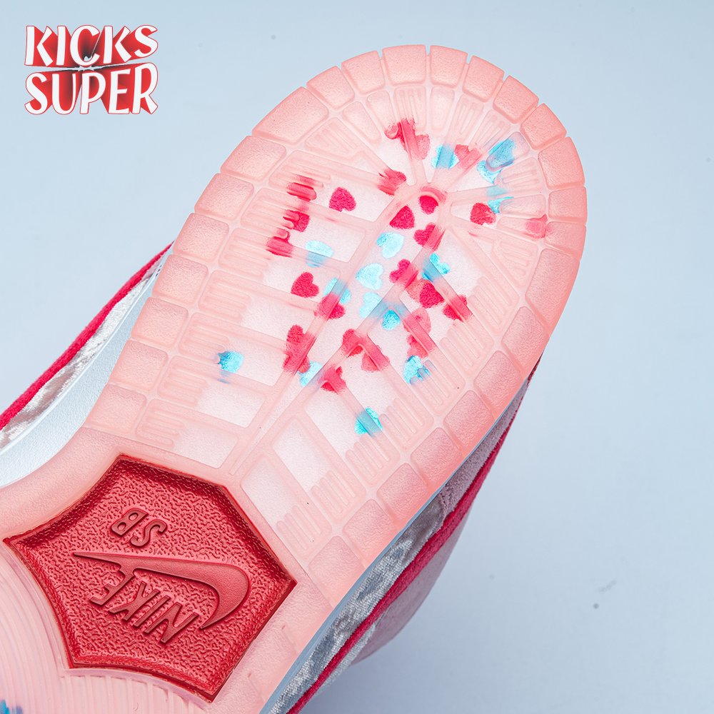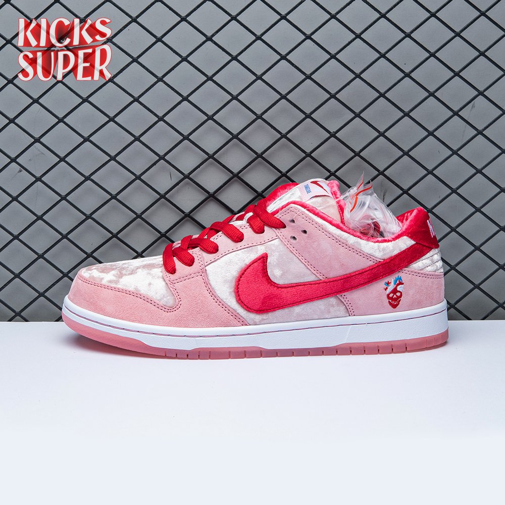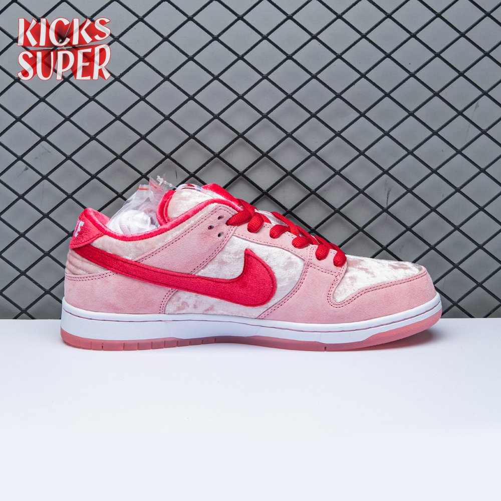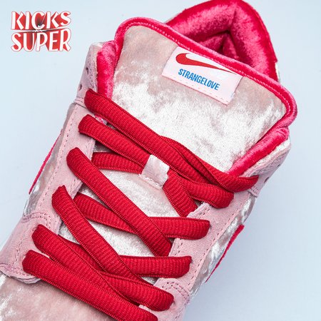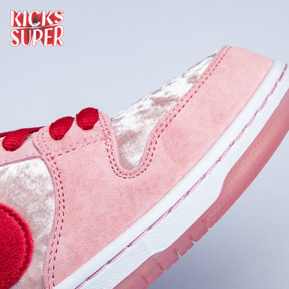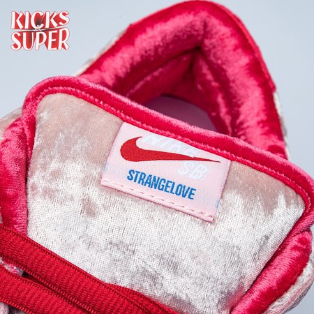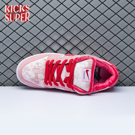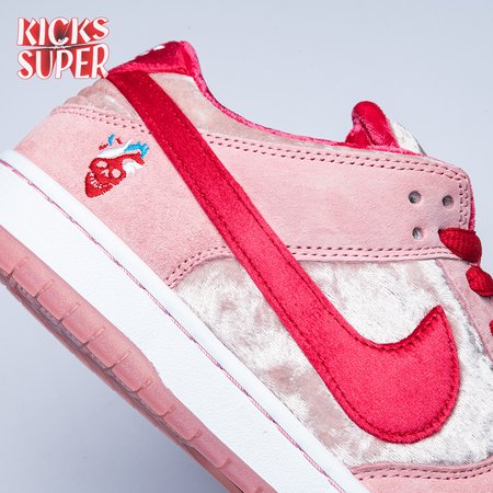 Made in collaboration with Sean Cliver"s skate brand, the StrangeLove x Dunk Low SB QS 'Valentine's Day' celebrates the romantic holiday with a plush take on the retro silhouette. The upper is constructed from white crushed velvet with pink suede overlays and a red velvet Swoosh. Cliver"s "Heart Skull" graphic is embroidered on the lateral heel, while the translucent pink rubber outsole reveals an array of scattered hearts in contrasting red and blue tones.