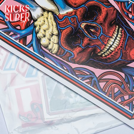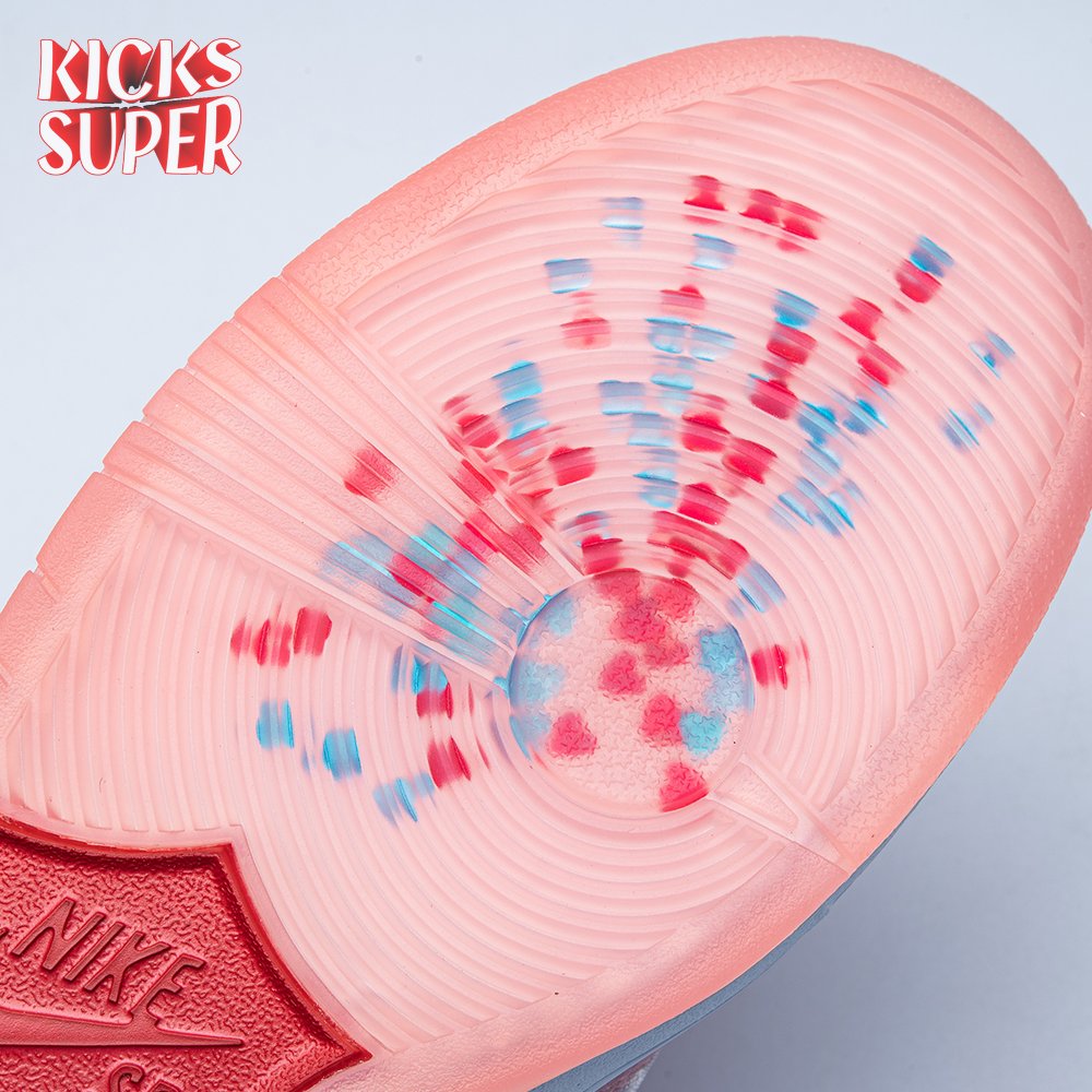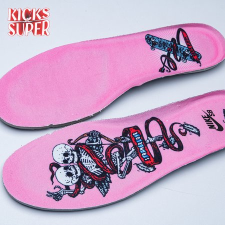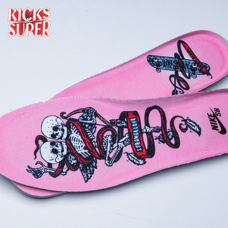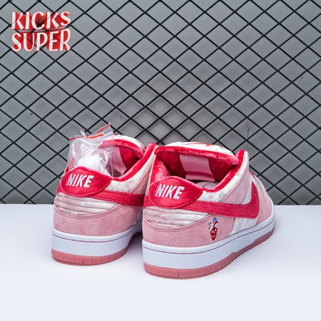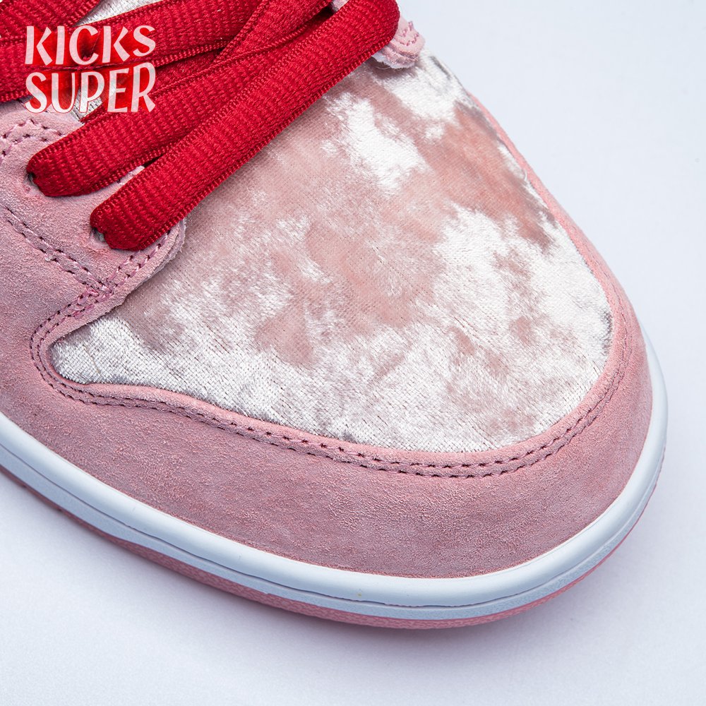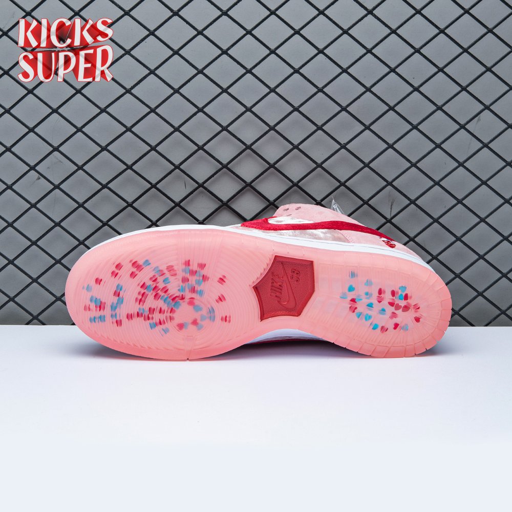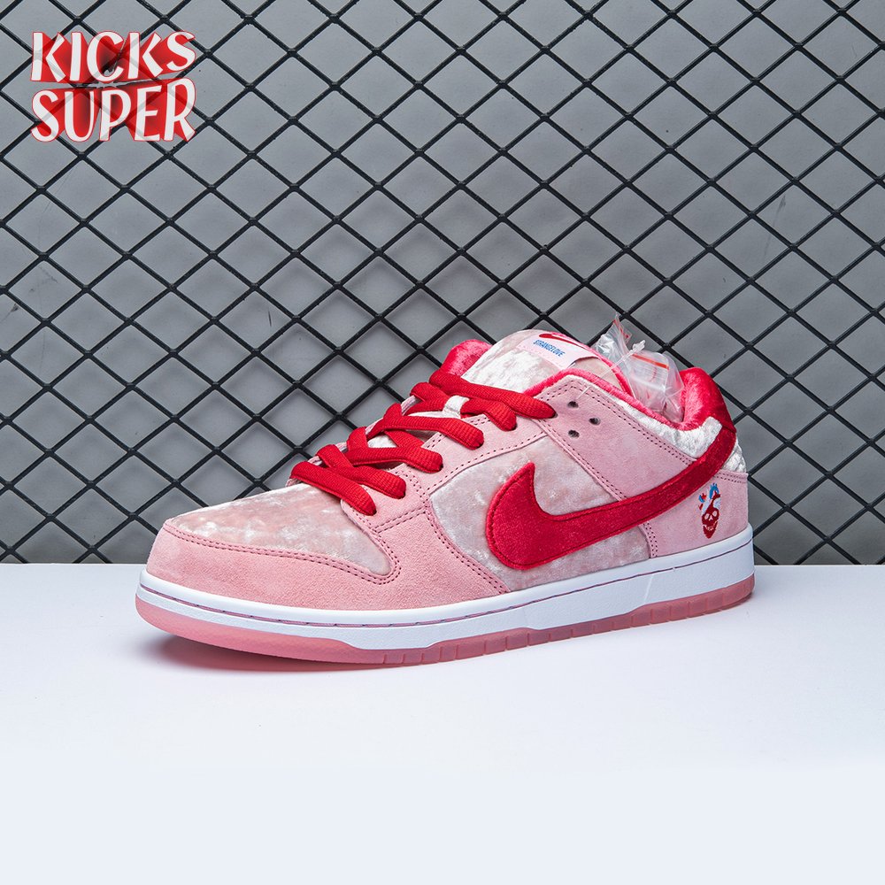 Made in collaboration with Sean Cliver"s skate brand, the StrangeLove x Dunk Low SB QS 'Valentine's Day' celebrates the romantic holiday with a plush take on the retro silhouette. The upper is constructed from white crushed velvet with pink suede overlays and a red velvet Swoosh. Cliver"s "Heart Skull" graphic is embroidered on the lateral heel, while the translucent pink rubber outsole reveals an array of scattered hearts in contrasting red and blue tones.