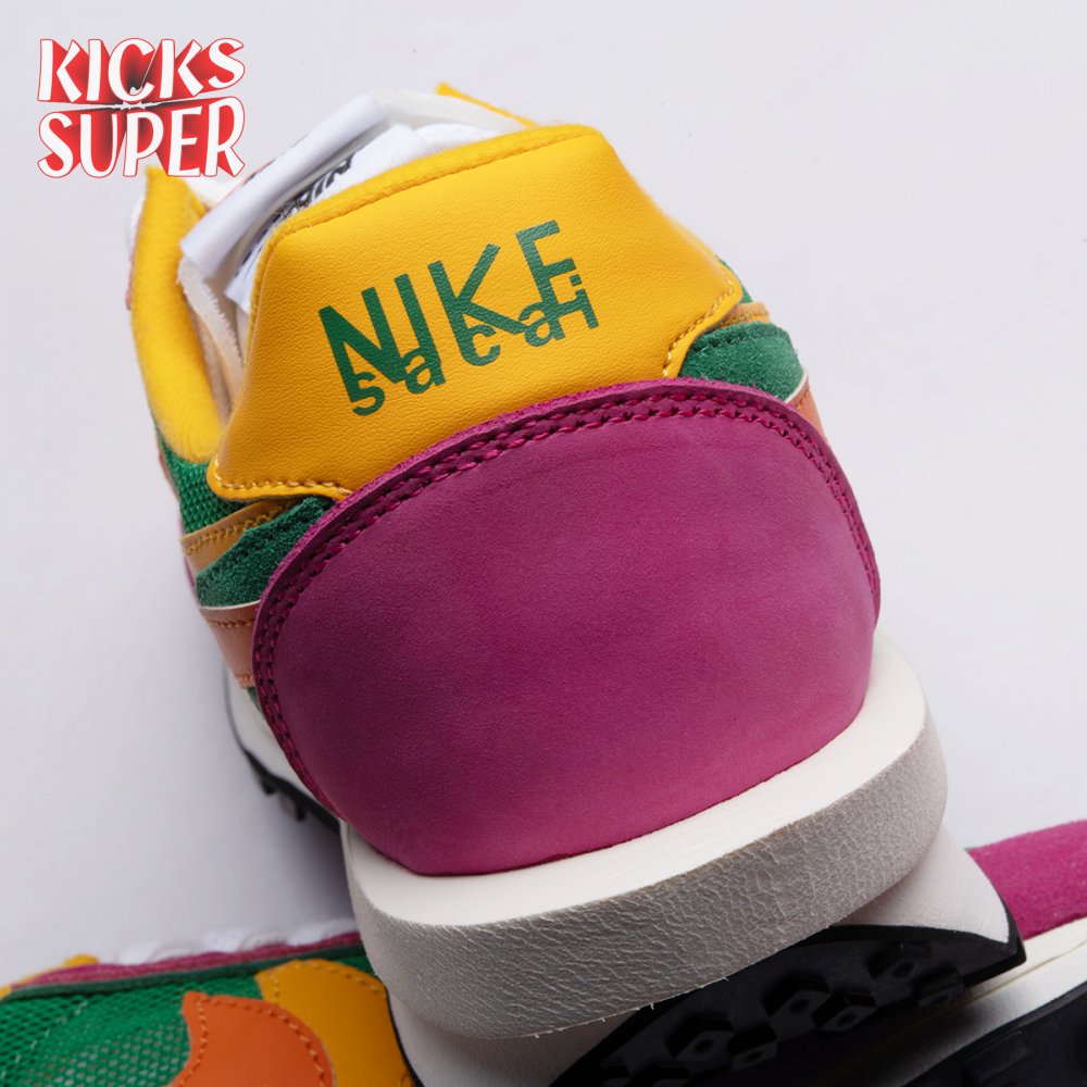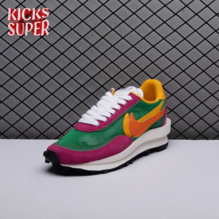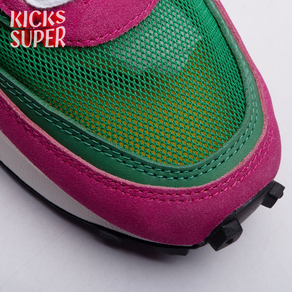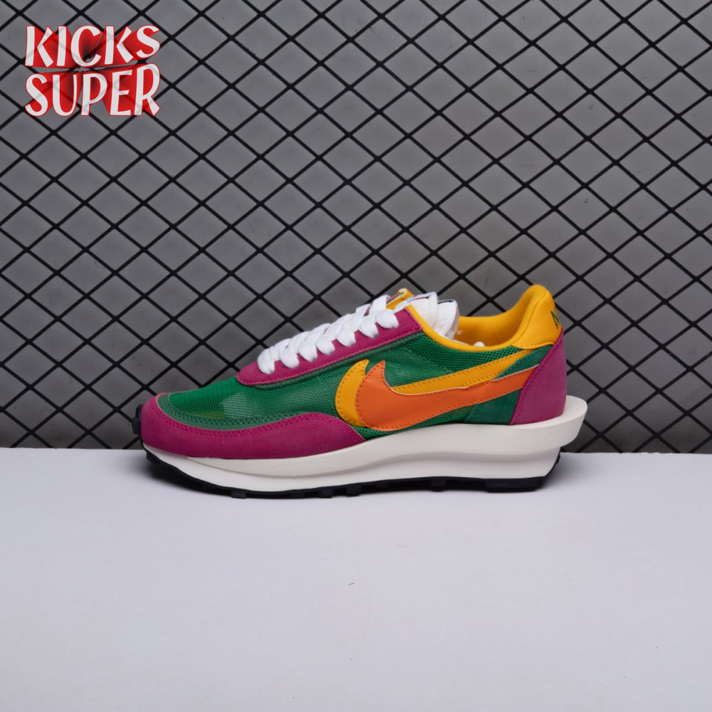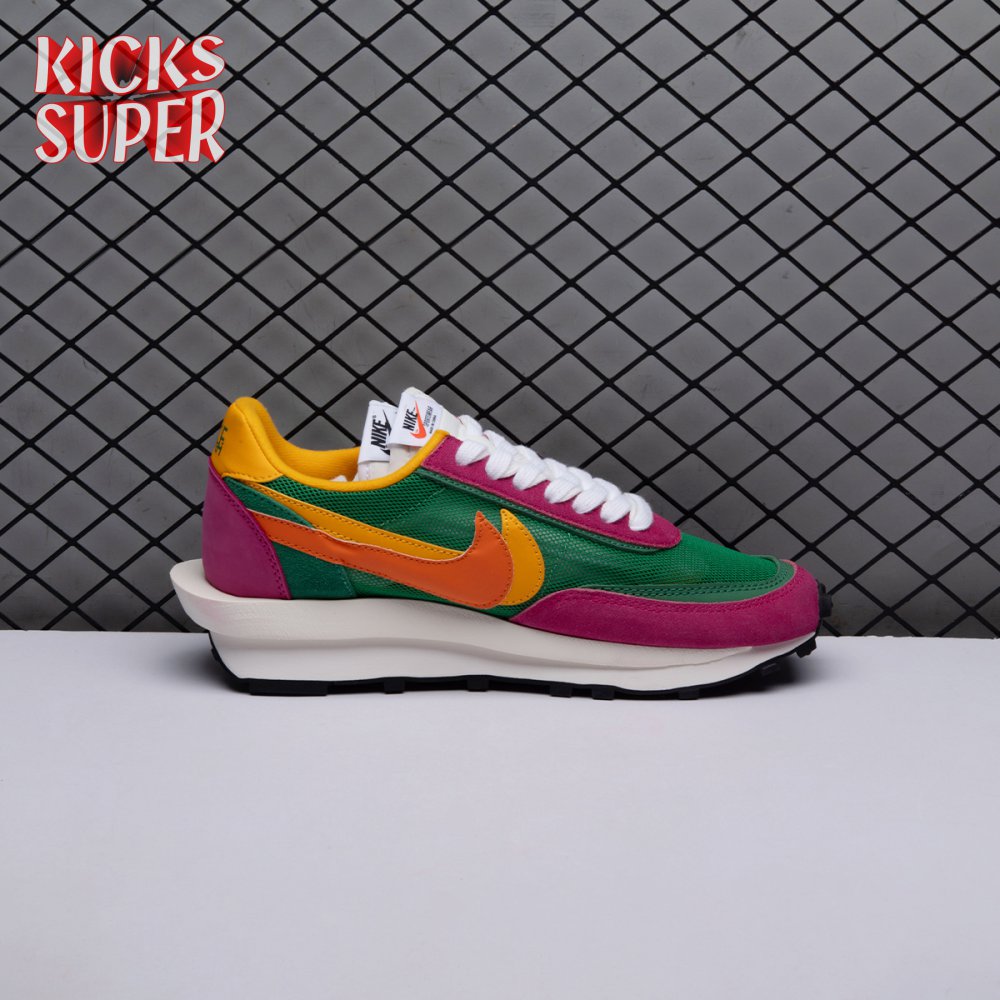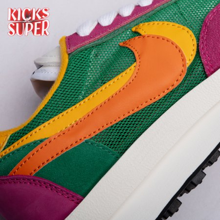 The Sacai x LDWaffle fuses the Japanese label's experimentalism with Nike's heritage ingenuity. Unveiled in September 2019, this 'Pine Green' edition updates the hybrid model in a vibrant color story. Its mesh upper sees layered suede eyestays, double reinforcements and dual, two-tone Swooshes. The aesthetic is furthered by twin tongues, optional double laces and stacked heel logos. Its double stacked, sculpted midsole follows the same formula atop a rubber waffle tread.