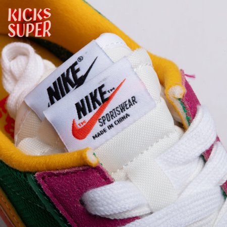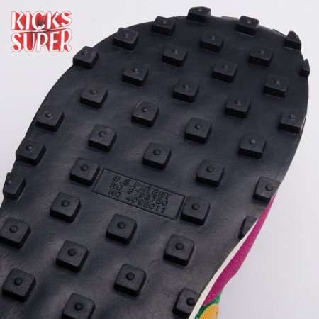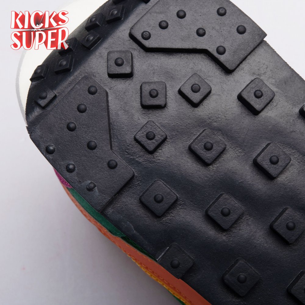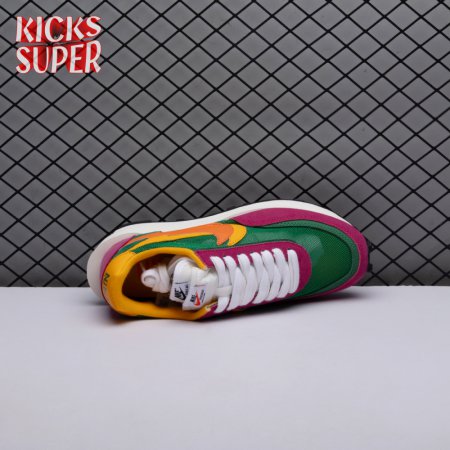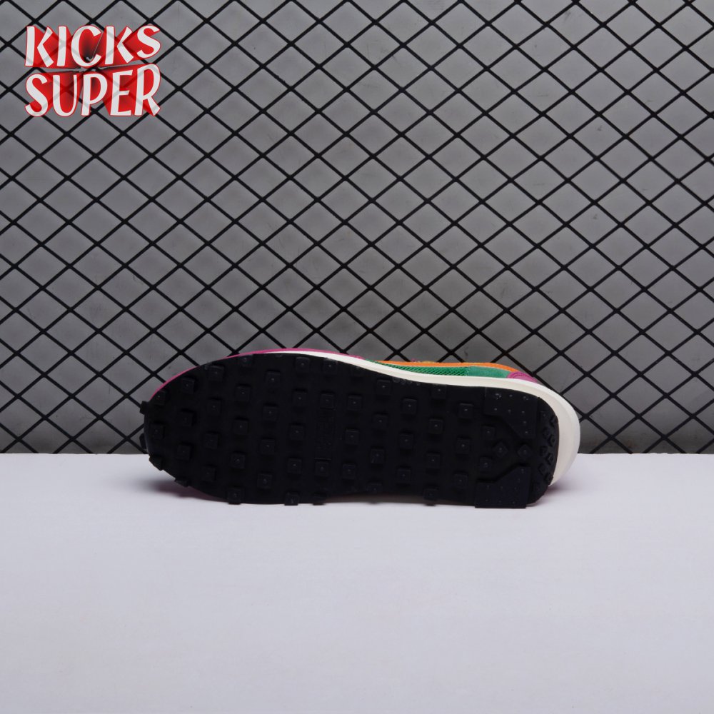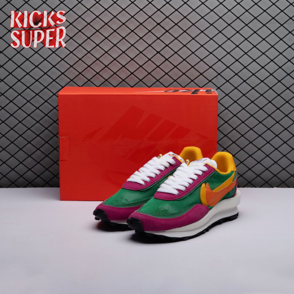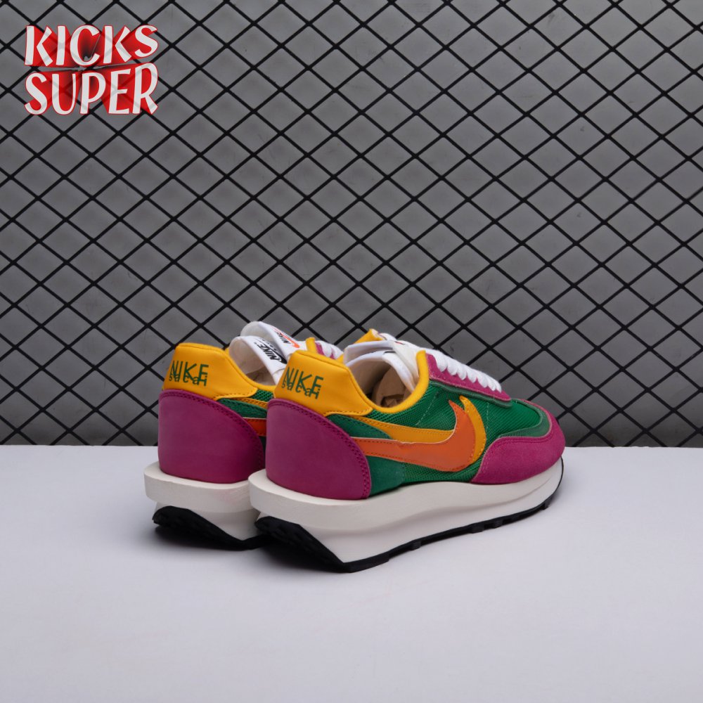 The Sacai x LDWaffle fuses the Japanese label's experimentalism with Nike's heritage ingenuity. Unveiled in September 2019, this 'Pine Green' edition updates the hybrid model in a vibrant color story. Its mesh upper sees layered suede eyestays, double reinforcements and dual, two-tone Swooshes. The aesthetic is furthered by twin tongues, optional double laces and stacked heel logos. Its double stacked, sculpted midsole follows the same formula atop a rubber waffle tread.