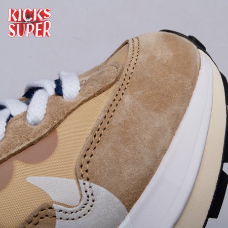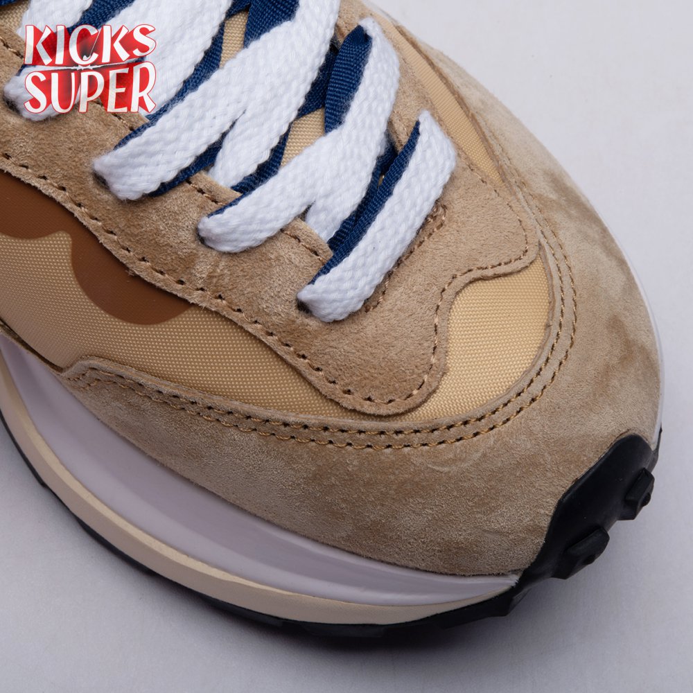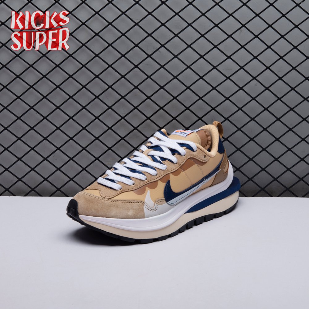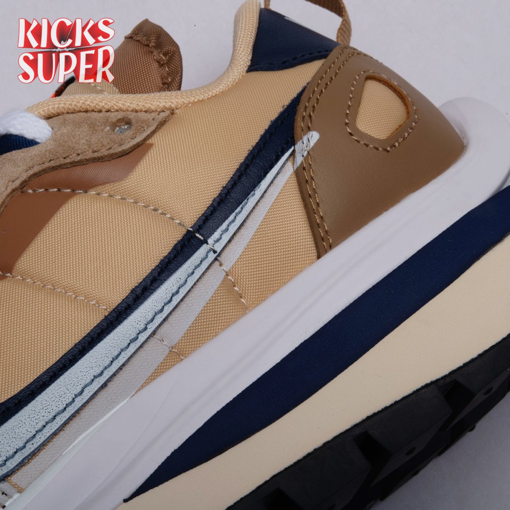 The sacai x Nike VaporWaffle "Sesame Blue Void" reunites the Swoosh with the Tokyo-based fashion label helmed by Chitose Abe. Blending elements from the modern Vaporfly and vintage Pegasus runner from 1983, the hybrid silhouette makes use of a khaki textile upper with tonal leather and suede overlays. A blue leather Swoosh is joined by a larger printed Swoosh in contrasting white. Tongues are similarly doubled up, each accented with a woven Nike tag. The sneaker rides on a dual-layered foam midsole, featuring split heel detailing and supported by a classic waffle tread outsole.