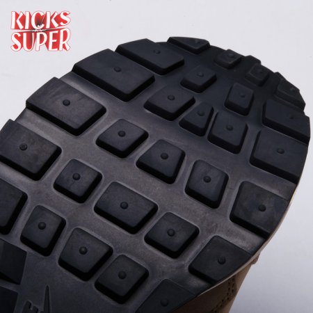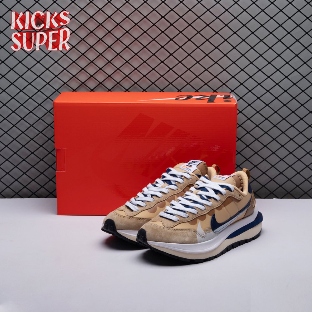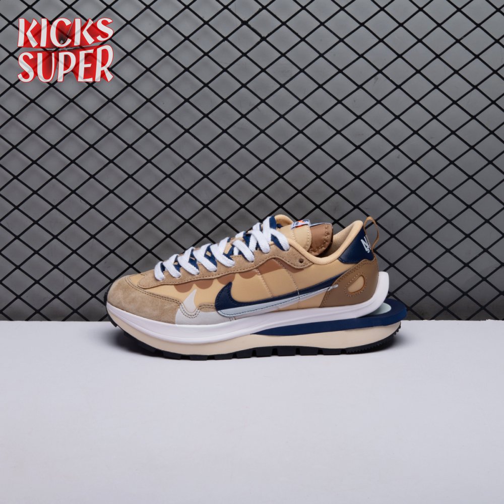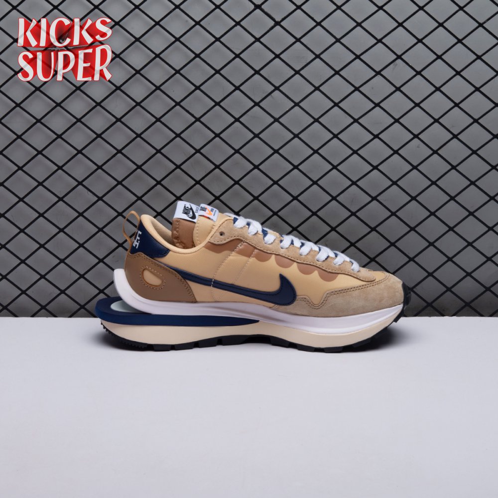 The sacai x Nike VaporWaffle "Sesame Blue Void" reunites the Swoosh with the Tokyo-based fashion label helmed by Chitose Abe. Blending elements from the modern Vaporfly and vintage Pegasus runner from 1983, the hybrid silhouette makes use of a khaki textile upper with tonal leather and suede overlays. A blue leather Swoosh is joined by a larger printed Swoosh in contrasting white. Tongues are similarly doubled up, each accented with a woven Nike tag. The sneaker rides on a dual-layered foam midsole, featuring split heel detailing and supported by a classic waffle tread outsole.